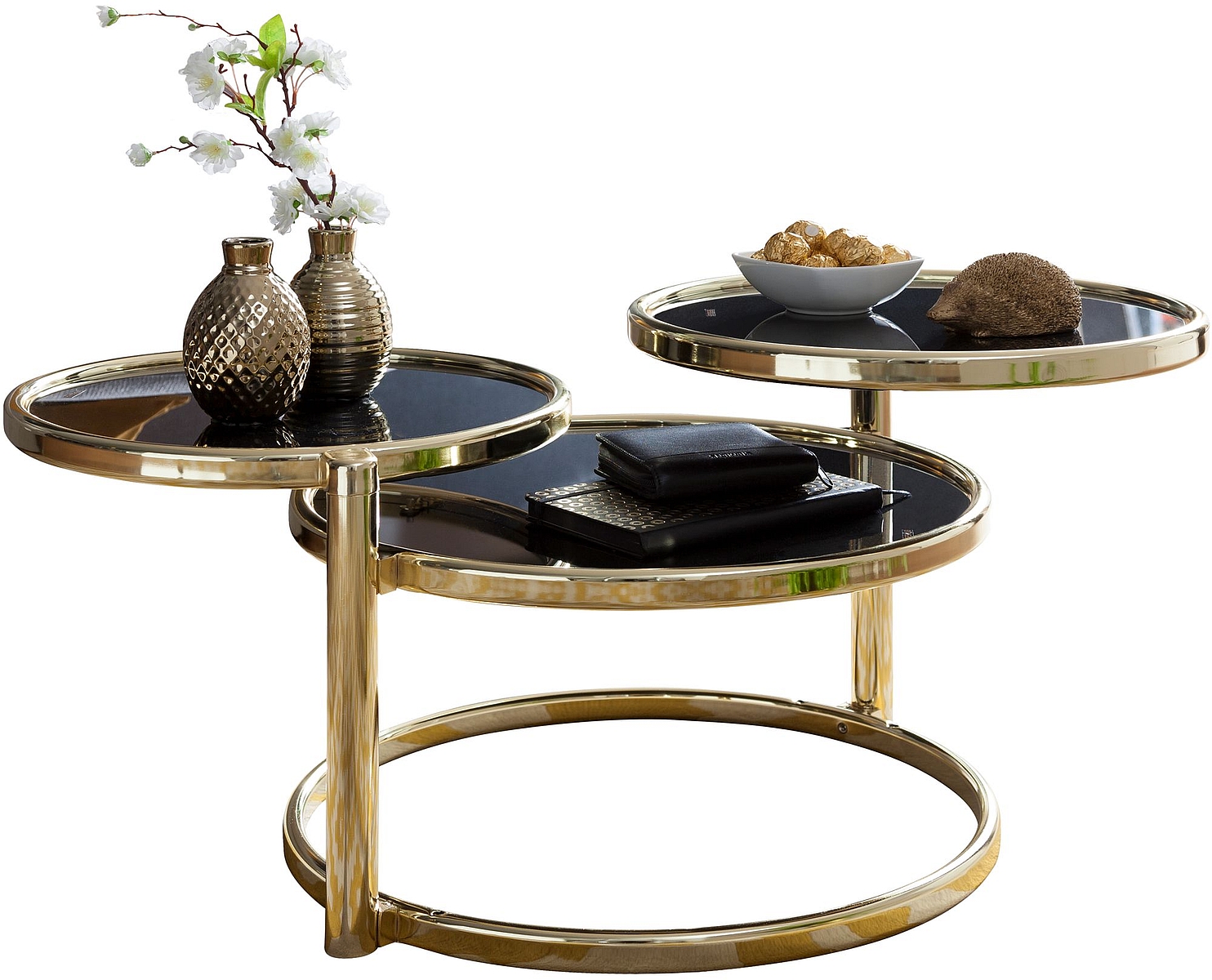 - IRRÉSISTIBLE ✔ Le superbe piètement en métal et les trois plateaux de tables en verre miroir trempé sont un vrai régal pour les yeux. Les trois plateaux pivotants achèvent parfaitement l’ensemble : une fois dépliés, la table a une largeur de 139 cm. Une bonne manière d’avoir toujours à portée de main vos boissons, snacks, portable, etc. Après une soirée télé tranquille, rabattez simplement les plateaux pour regagner de la place.