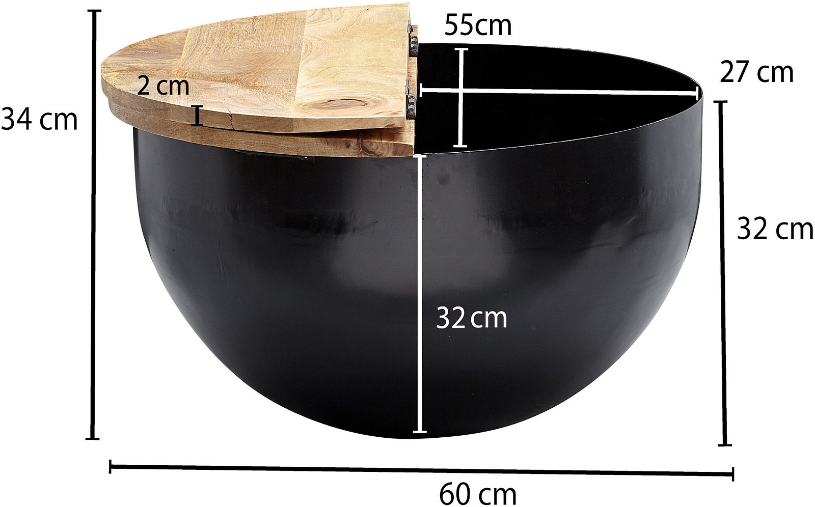 DIMENSIONS ✔ Largeur : 60 cm // Hauteur : 34 cm // Profondeur : 60 cm // Hauteur du coffre de rangement : 32 cm // Dimensions de l'ouverture (LxP) : 55 x 27 cm // Épaisseur plateau de table : env. 2 cm // Vous trouverez d'autres dimensions sur l'image correspondante.
