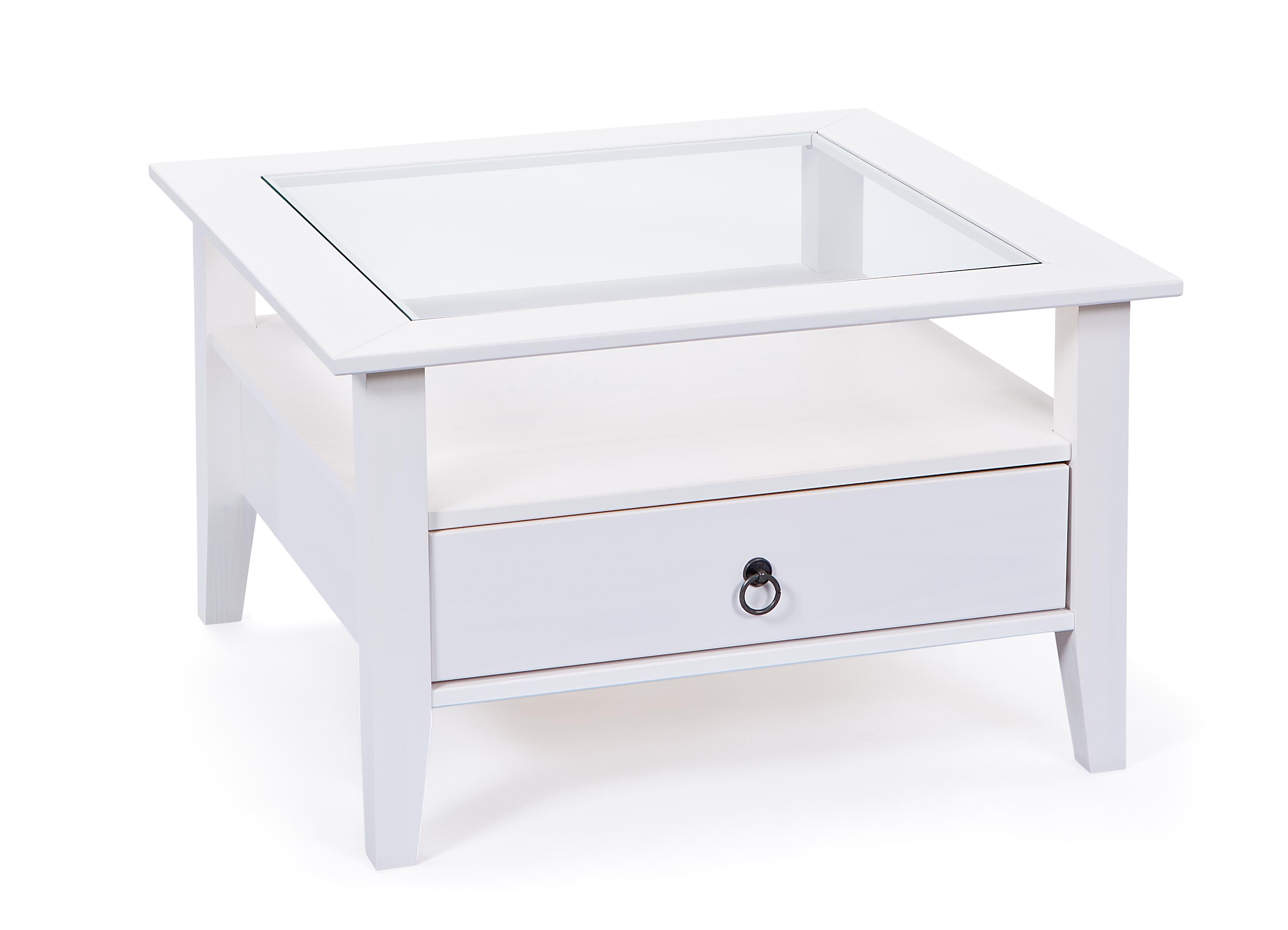 Bois de pin massif (Brésil) laqué blanc avec plateau de table en verre de sécurité transparent intégré.