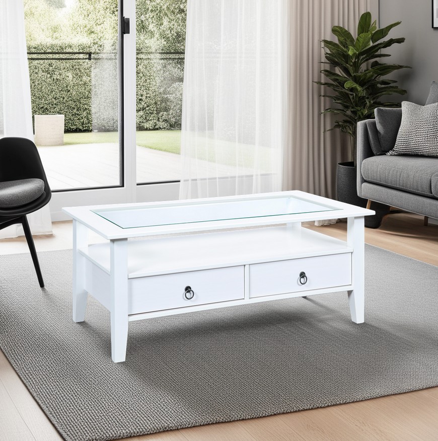 Bois de pin massif (Brésil) laqué blanc avec plateau de table en verre de sécurité transparent intégré.