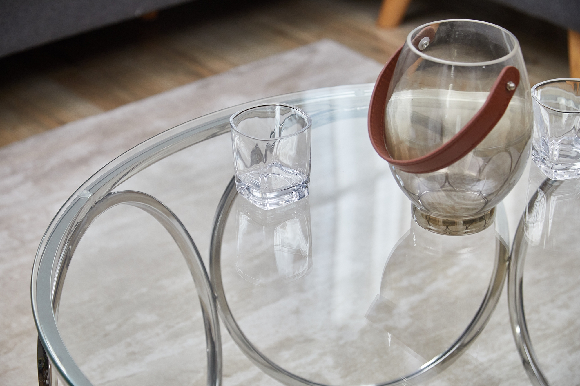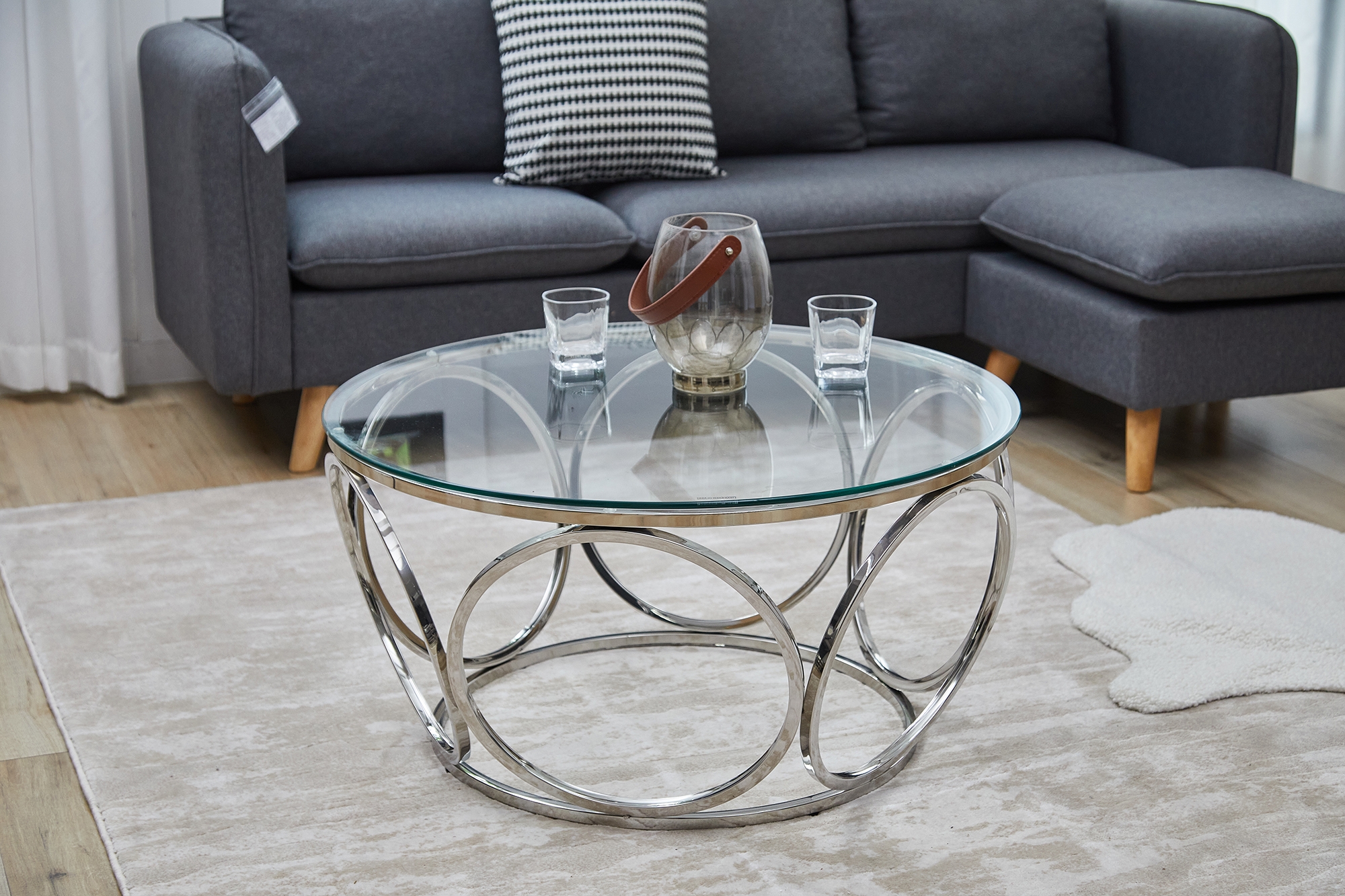 Cette élégante table basse fera régner charme et glamour dans votre salon. Le piètement design en acier inoxydable ton argent est à la fois robuste et attirera tous les regards grâce à son look original. Le piètement est constitué de cercles métalliques décoratifs qui mettent la table joliment en valeur ; elle deviendra vite le point central de votre salon. La table basse ton argent avec son plateau en verre transparent s’intègre harmonieusement dans de nombreux styles d’intérieur et s’associe facilement à des canapés et fauteuils dans des teintes et des formes différentes. Grâce au plateau en verre de sécurité de 8 mm d’épaisseur, la table est extrêmement résistante contre les coups et le bris. La surface du plateau en verre et le piètement sont également très faciles d’entretien : il suffit de passer un chiffon légèrement humide et le tour est joué ! Avec cette table basse, faites entrer une touche d’originalité dans votre intérieur.