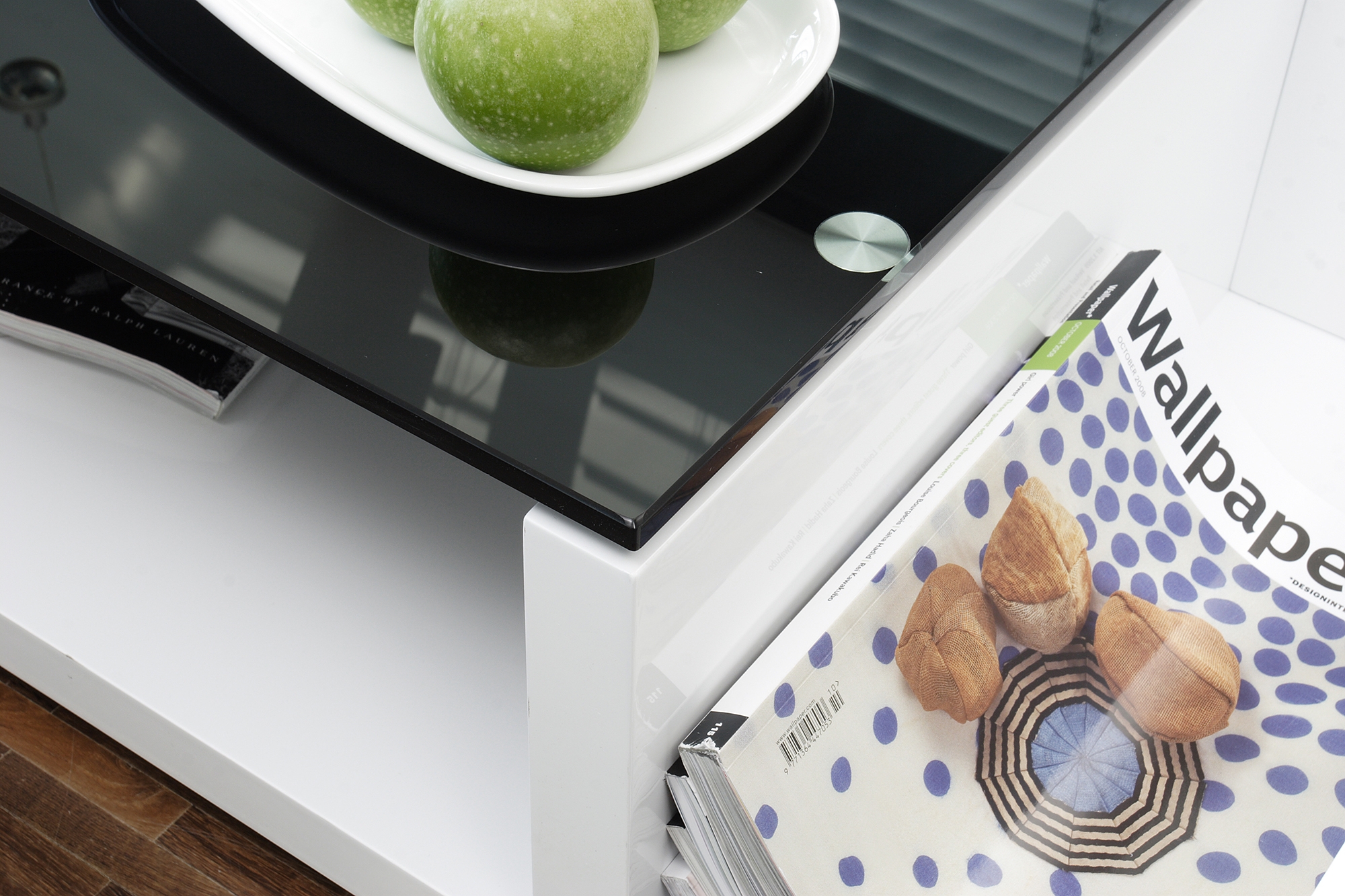 Cette table basse moderne attire immédiatement le regard grâce à sa forme originale. La table de salon facile d’entretien est entièrement fabriquée en MDF laqué ton blanc ultra brillant. Le plateau de table en verre de sécurité noir de 12 mm d’épaisseur apporte la touche finale au design tendance. Le casier ouvert sous le plateau ainsi que les deux casiers latéraux offrent un espace de rangement spacieux pour les boissons, snacks, magazines, etc… Cette table de salon s’adapte parfaitement à l’ameublement existant. Les meubles dans une teinte claire ou foncée permettent de créer des contrastes originaux, comme le noir et blanc tendance.