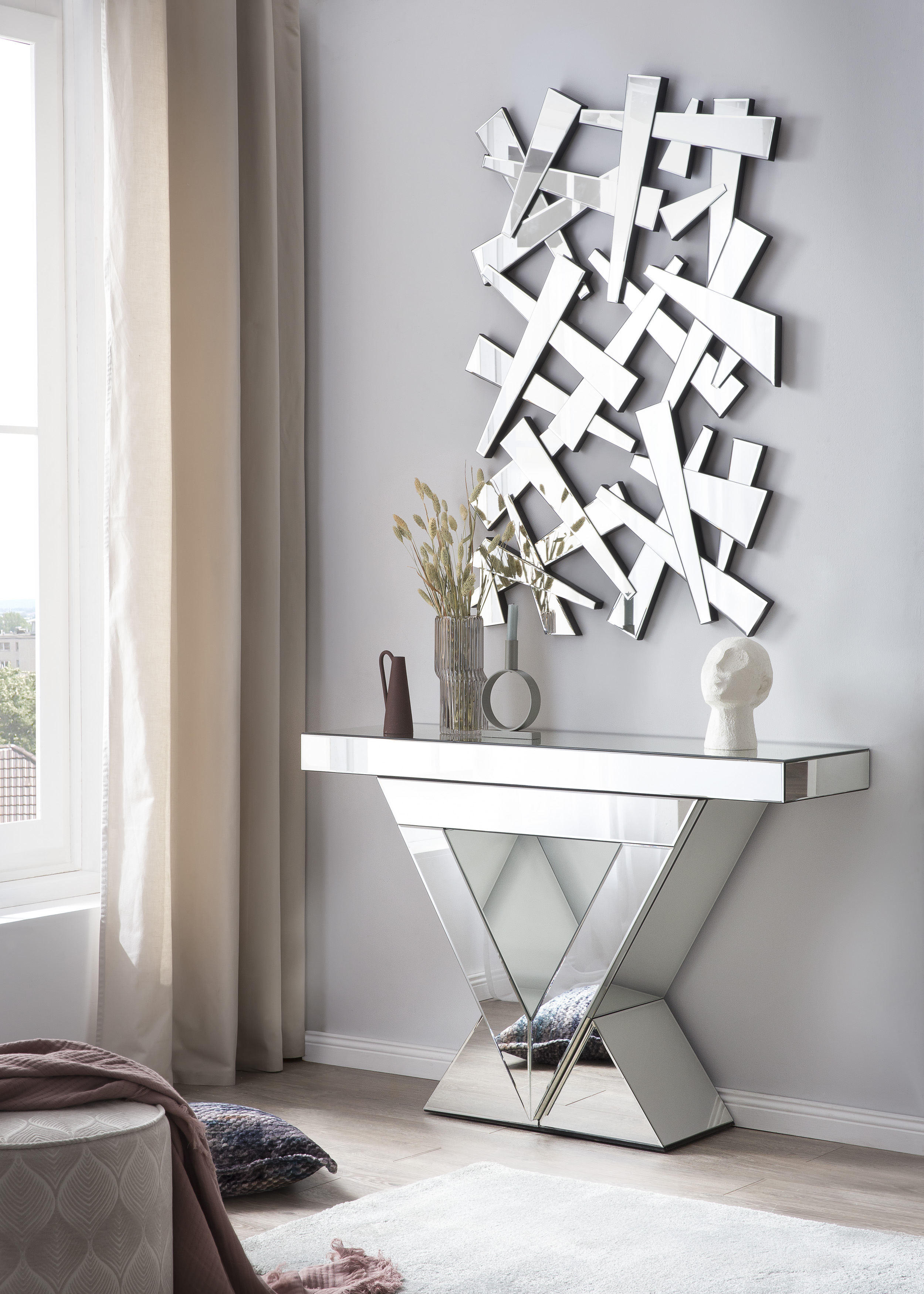 La table console rectangulaire dans un design abstrait attire tous les regards. Le plateau de table ainsi que le socle sont en MDF robuste et sont entièrement recouverts d'éléments en verre miroir. Le socle en forme de triangle avec éléments en verre miroir donne à l'ensemble une sensation d'espace. Grâce au design attrayant de cette console, vous conférerez une touche élégante à votre espace de vie. La table console se combinera également à merveille avec l'ameublement existant. Que ce soit dans le salon, le couloir ou la chambre à coucher, ce petit bijou en matière de design brillera par son originalité.