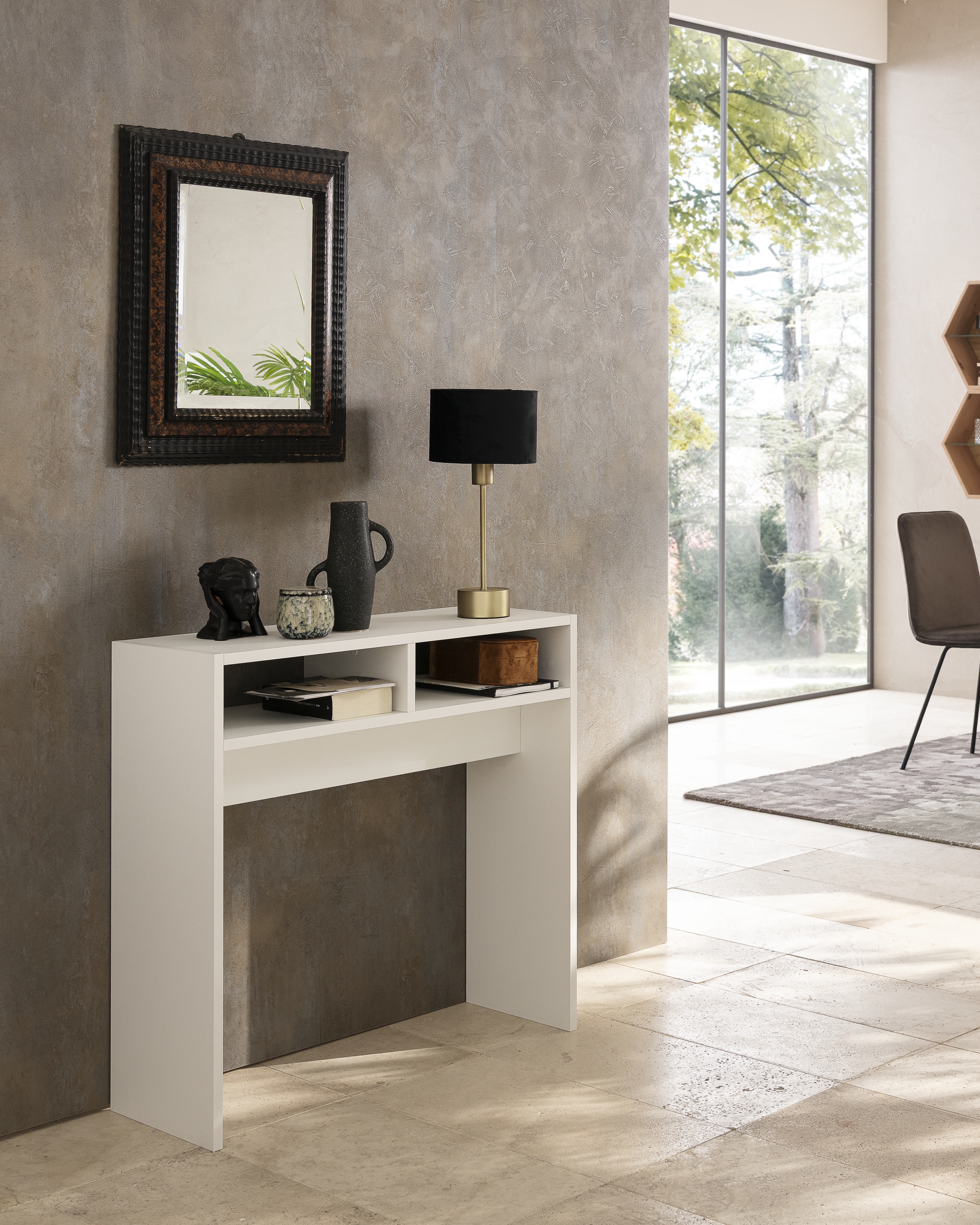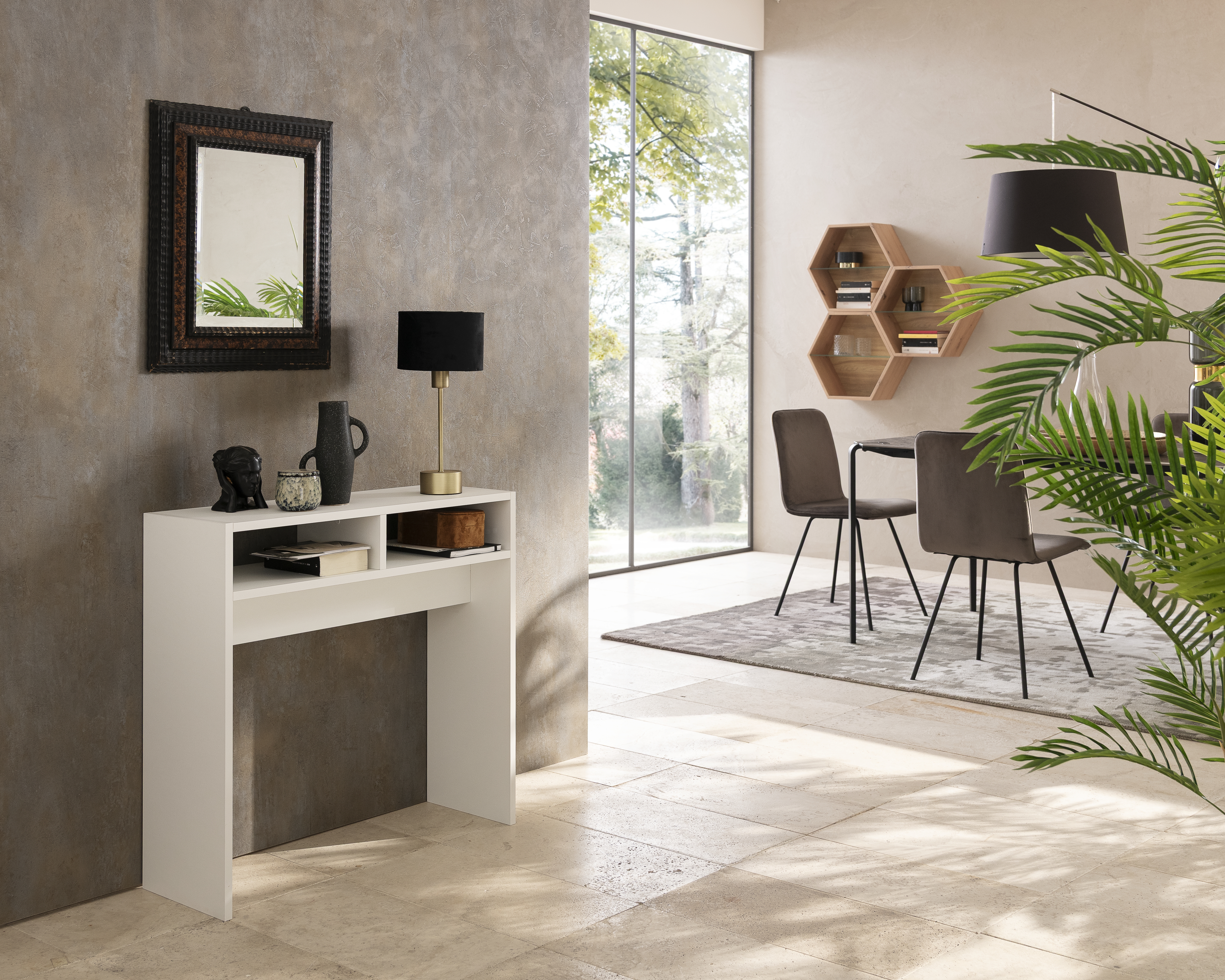 Cette console blanche est un complément pratique pour votre couloir, votre salon ou votre espace de travail. Sa construction robuste et ses surfaces faciles d'entretien en font un meuble fonctionnel pour un usage quotidien. Deux compartiments ouverts sous le plateau offrent un espace de rangement supplémentaire pour les petits objets, les magazines ou les articles de décoration. La fabrication solide garantit une grande stabilité, tandis que le décor bois naturel crée une atmosphère chaleureuse. Grâce à ses dimensions compactes, la table peut être placée de manière flexible, ce qui est idéal pour les petites pièces. Un compagnon polyvalent et pas cher avec la garantie de prix MEGA Möbel.