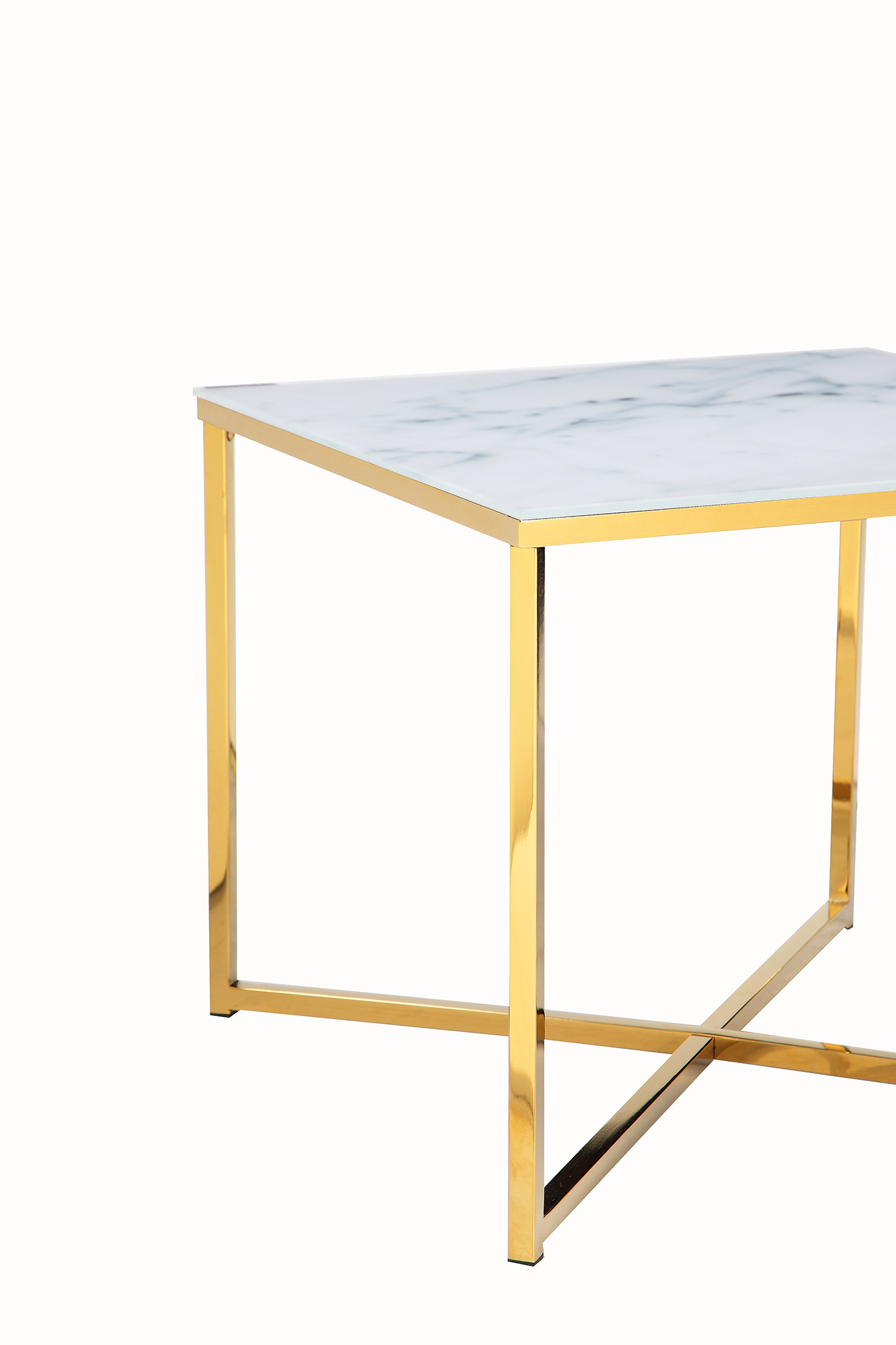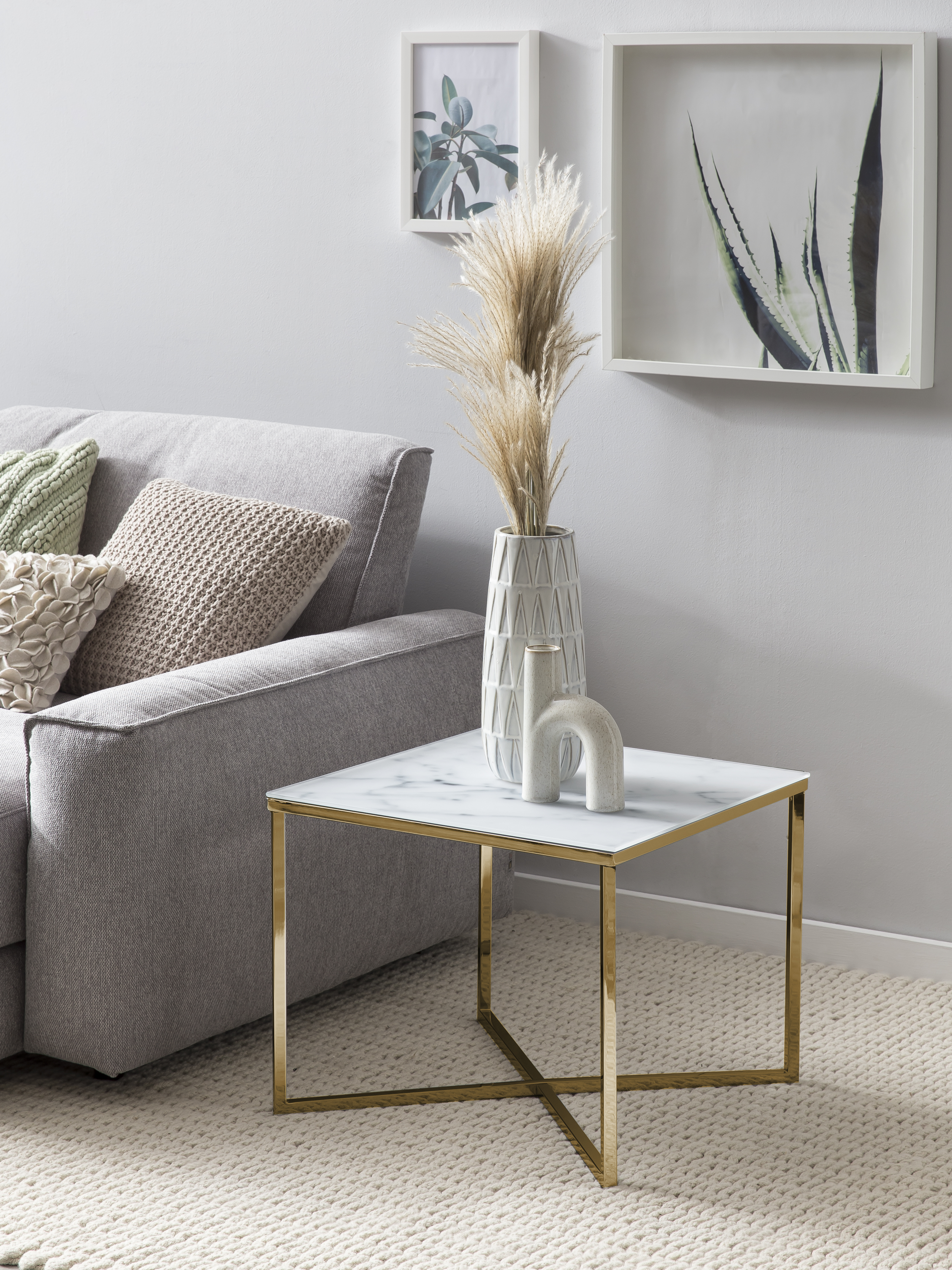 Cette table basse carrée combine un design moderne avec une touche d’extravagance. Le plateau en verre recouvert d'un film aspect marbre se marie parfaitement avec le piètement en métal ton doré. La table basse offre suffisamment d’espace pour poser des magazines, un vase de fleurs ou une jolie lampe. Grâce à son design attrayant et à sa forme carrée, cette petite table peut être combinée avec de nombreux meubles et trouvera également sa place dans votre intérieur.