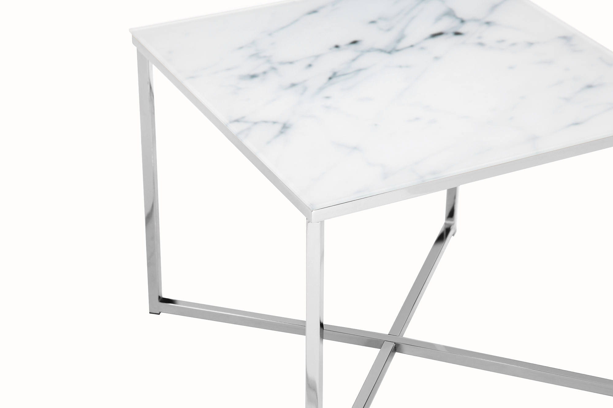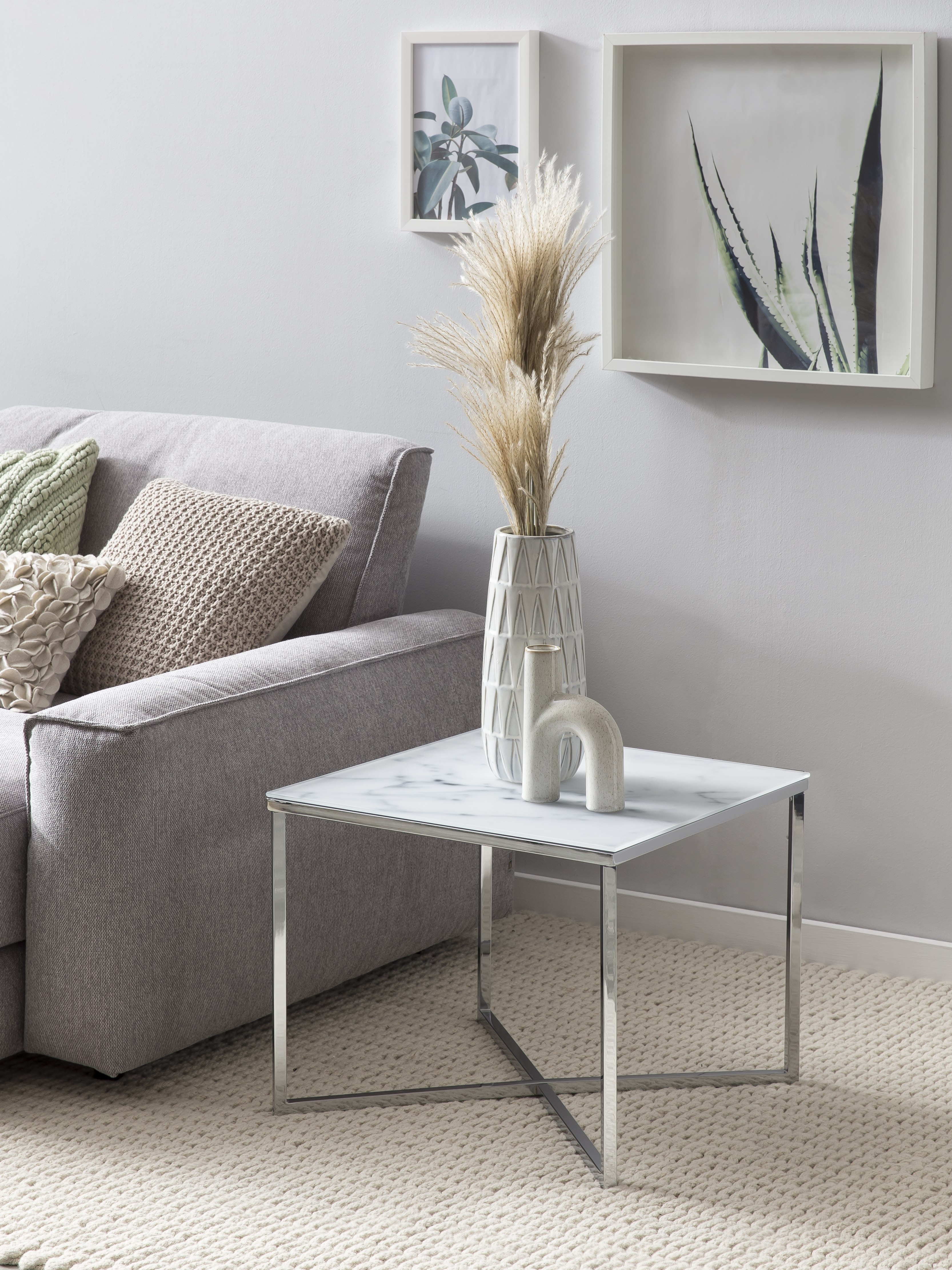 Cette table basse carrée combine un design moderne avec une touche d’extravagance. Le plateau en verre recouvert d'un film aspect marbre se marie parfaitement avec le piètement en métal ton chrome. La table basse offre suffisamment d’espace pour poser des magazines, un vase de fleurs ou une jolie lampe. Grâce à son design attrayant et à sa forme carrée, cette petite table peut être combinée avec de nombreux meubles et trouvera également sa place dans votre intérieur.