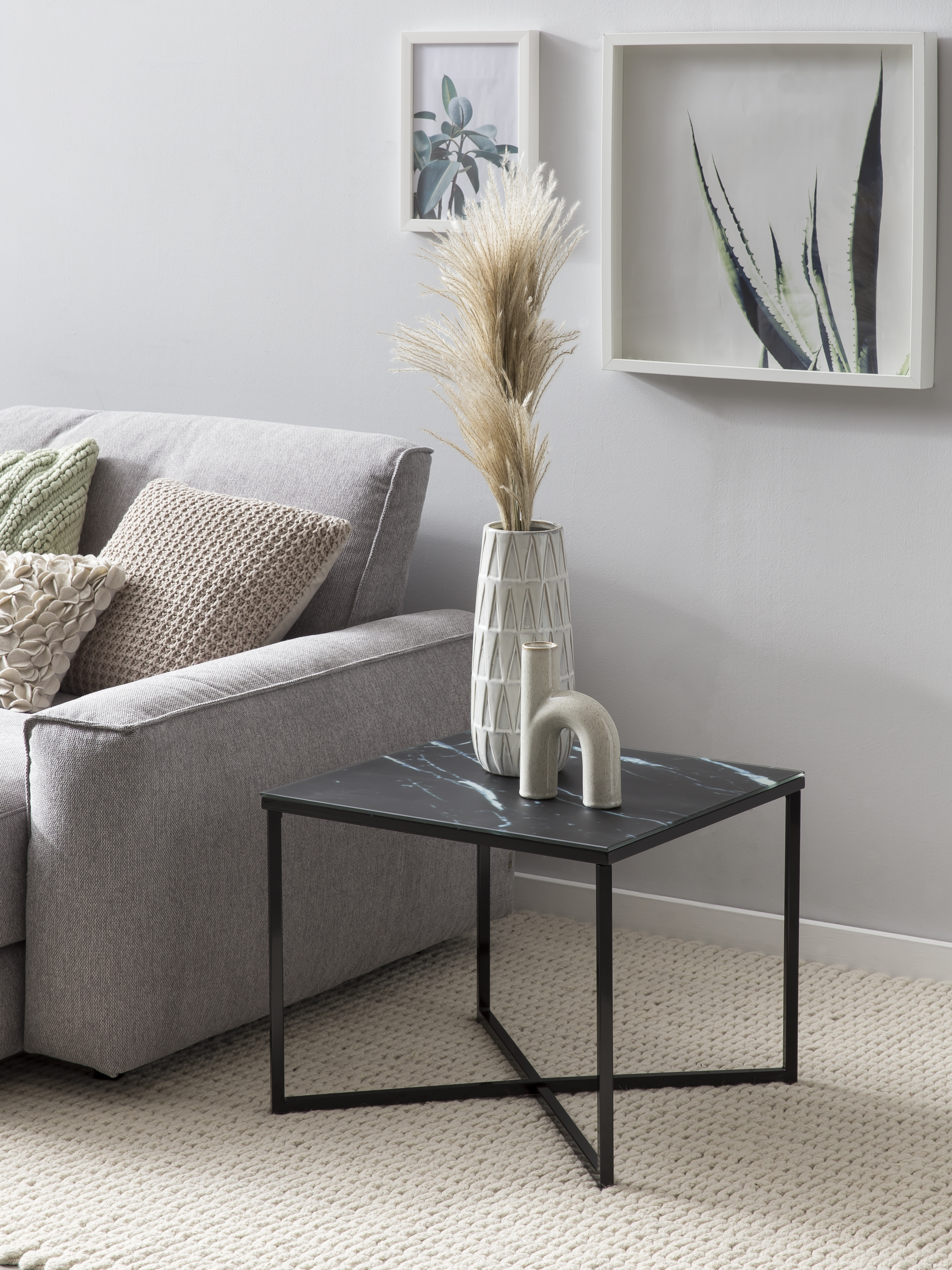 Cette table basse carrée combine un design moderne avec une touche d’extravagance. Le plateau en verre recouvert d'un film aspect marbre se marie parfaitement avec le piètement en métal noir. La table basse offre suffisamment d’espace pour poser des magazines, un vase de fleurs ou une jolie lampe. Grâce à son design attrayant et à sa forme carrée, cette petite table peut être combinée avec de nombreux meubles et trouvera également sa place dans votre intérieur.