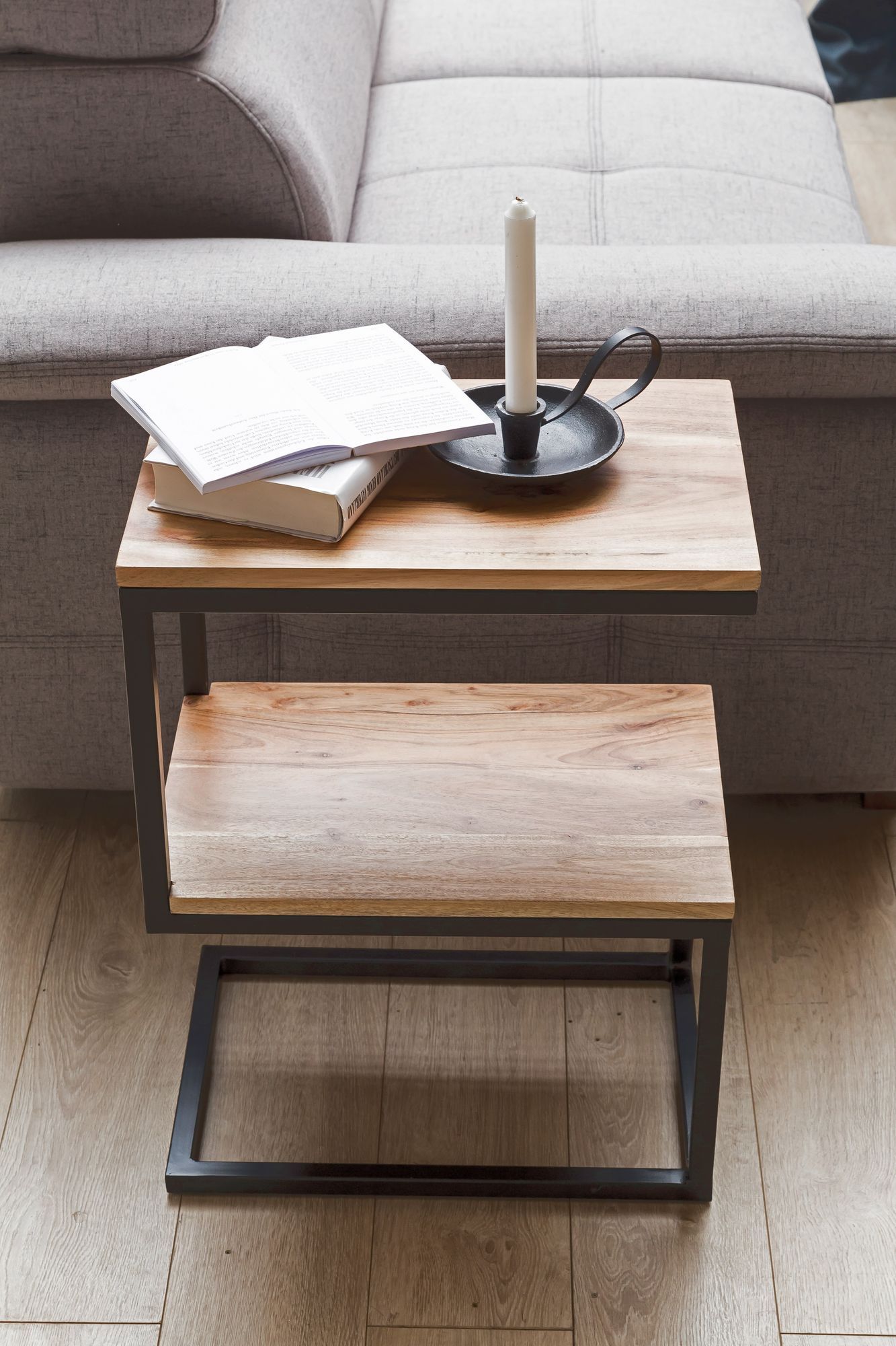 - DESIGN ✔ Bout de canapé moderne en forme de S avec piètement métallique et deux plateaux en bois massif