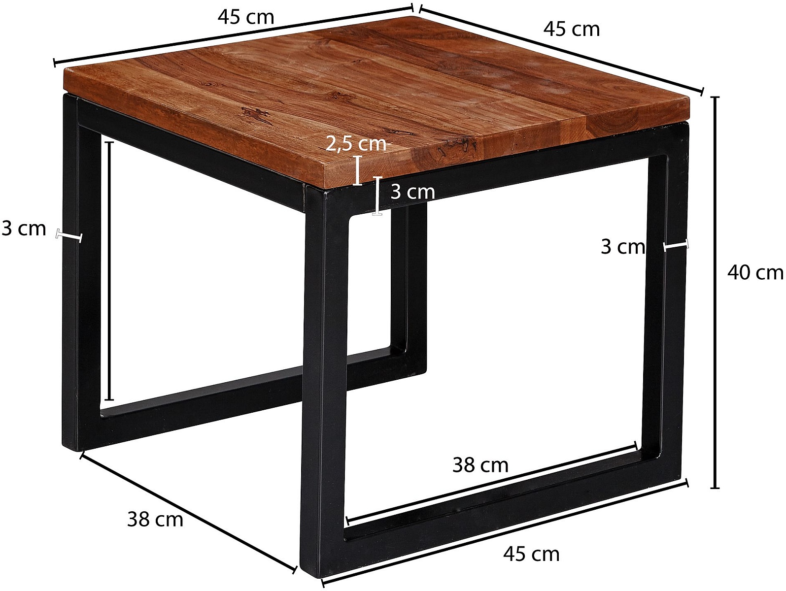 DIMENSIONS ✔ Largeur : 45 cm // Hauteur : 40 cm // Profondeur : 45 cm // Épaisseur du plateau de table : 2,5 cm // Épaisseur métal : 3 cm // Poids maxi : 15 kg.