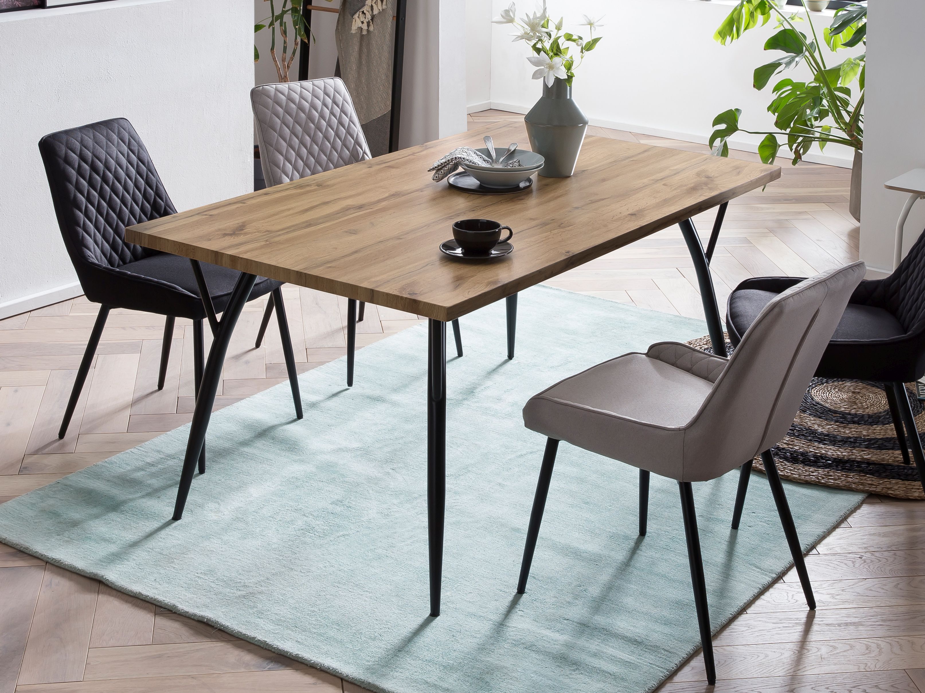 Cette table à dîner stylée rend le coin repas encore plus accueillant. Un médium (MDF) dans une fabrication de qualité a été utilisé pour le plateau. La surface est très résistante aux épreuves habituelles du quotidien. Le piètement en métal noir donne la touche finale. La table - qu'elle soit dans la cuisine ou la salle à manger - est souvent le centre des interactions sociales. Ici, on mange, on boit, on rit, on joue et on discute ensemble. Même les activités en télétravail sont plus agréables avec ce joli modèle.