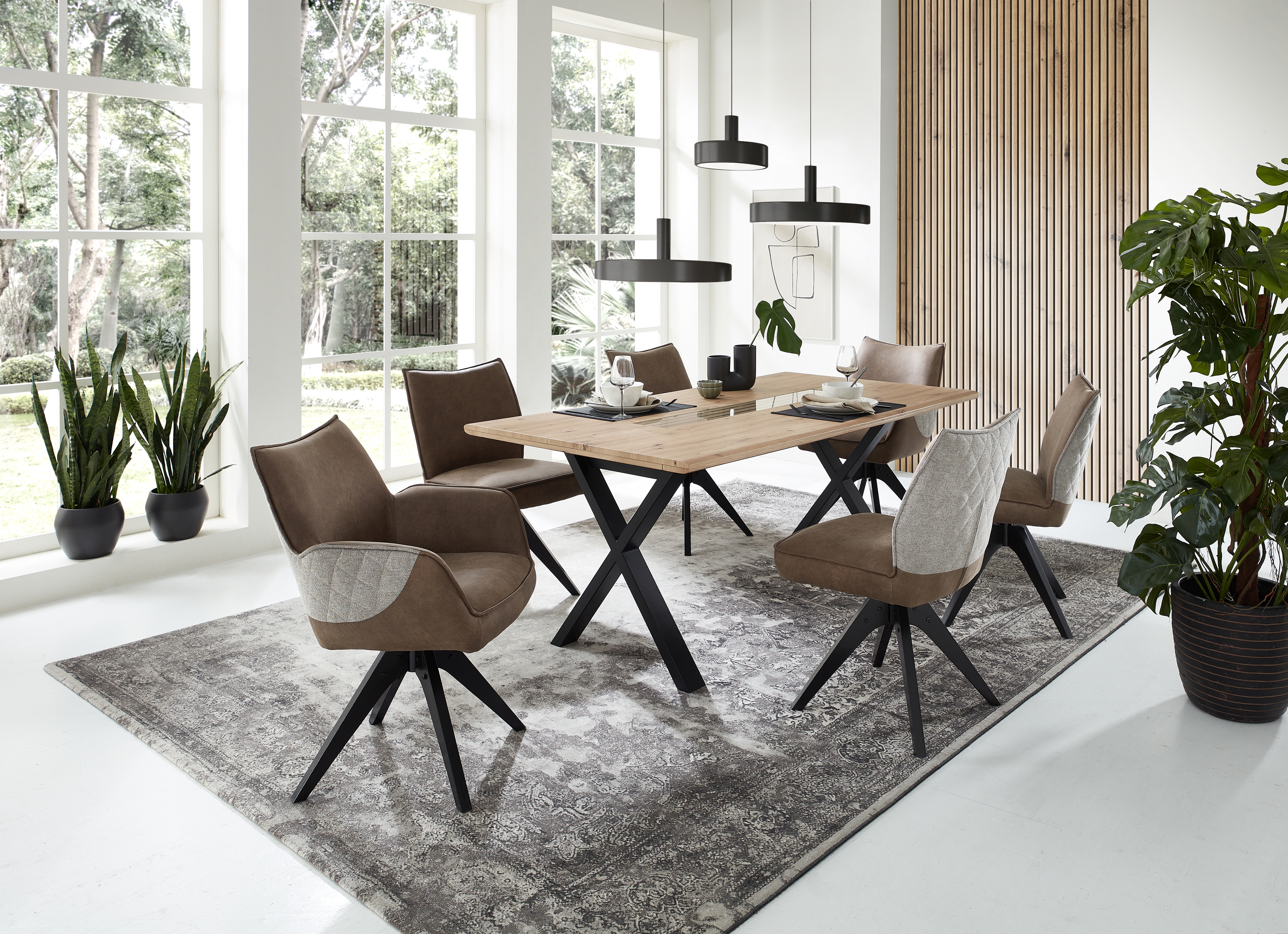 Plateau de table : décor chêne Artisan, au centre avec insertion décor chêne Artisan en MDF aspect lattes de bois (au-dessus cette partie centrale se trouve un panneau en verre transparent)