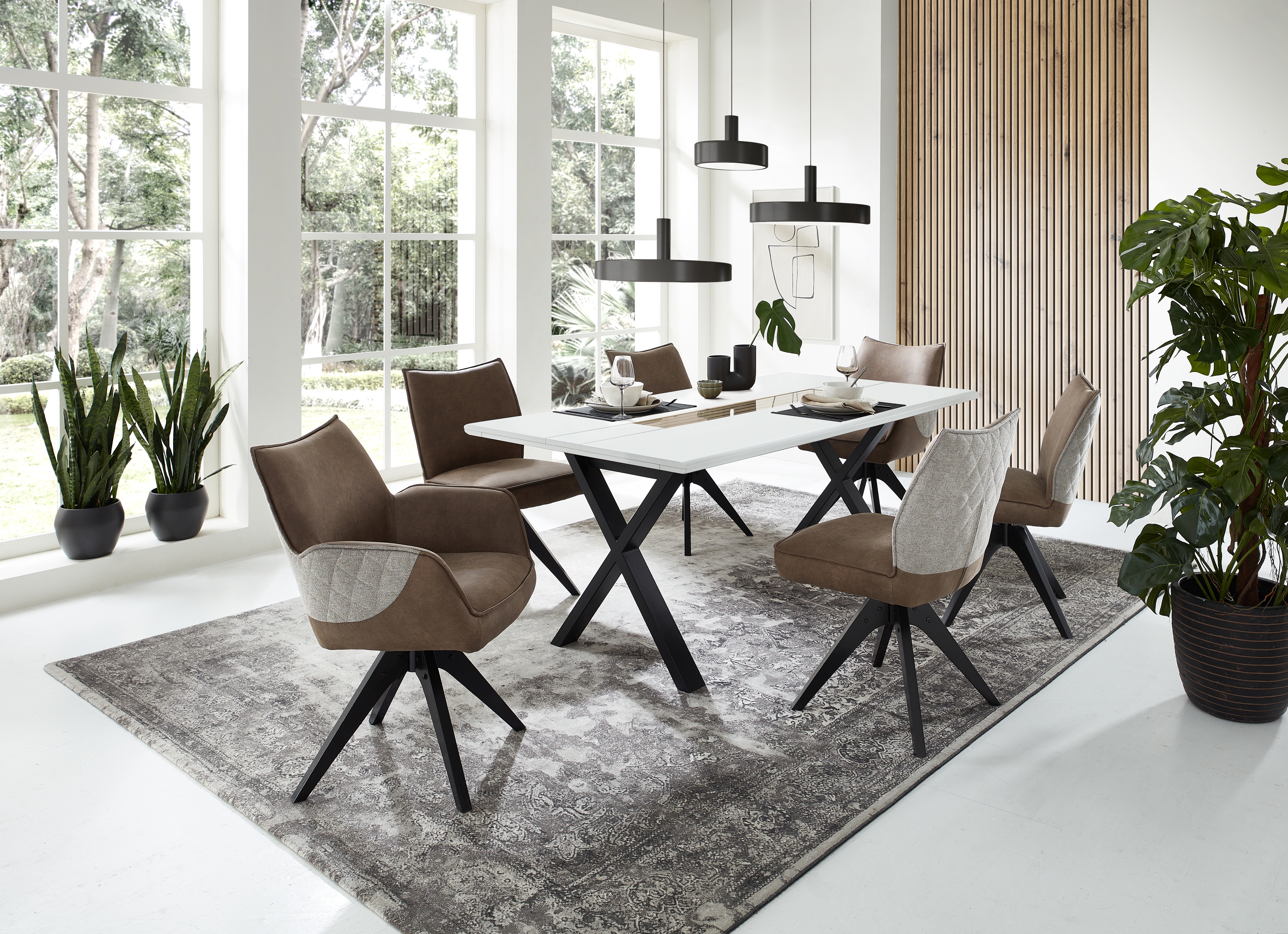 Plateau de table : ton blanc, au centre avec insertion décor chêne Artisan en MDF aspect lattes de bois (au-dessus de cette partie centrale se trouve un panneau en verre transparent)