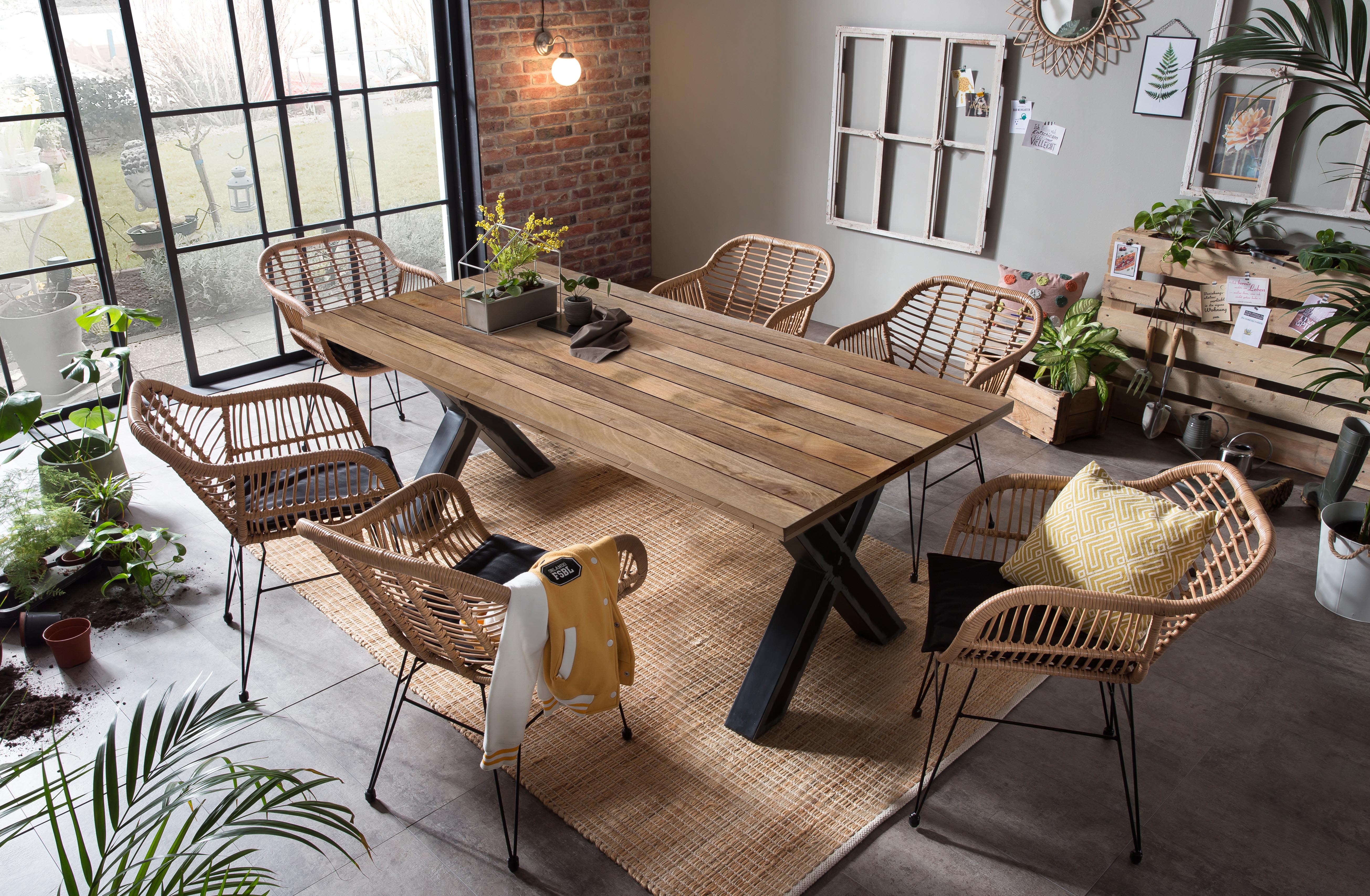Dans la salle à manger, la véranda ou sur la terrasse : l'association du bois de manguier robuste et du métal lourd confère à cette table un aspect moderne qui se distingue positivement de la norme. Comprenant 9 lamelles en bois au veinage naturel, le plateau de table attirera tous les regards. Les piètements de style industriel sont délibérément maintenus dans un aspect grossier pour souligner le "look usé" souhaité. En utilisant la table à l'extérieur, des taches de rouille apparaîtront probablement bientôt. Mais, là encore, c'est vous qui déciderez de l'endroit où vous placerez la table et déterminerez ainsi l'aspect final souhaité.
