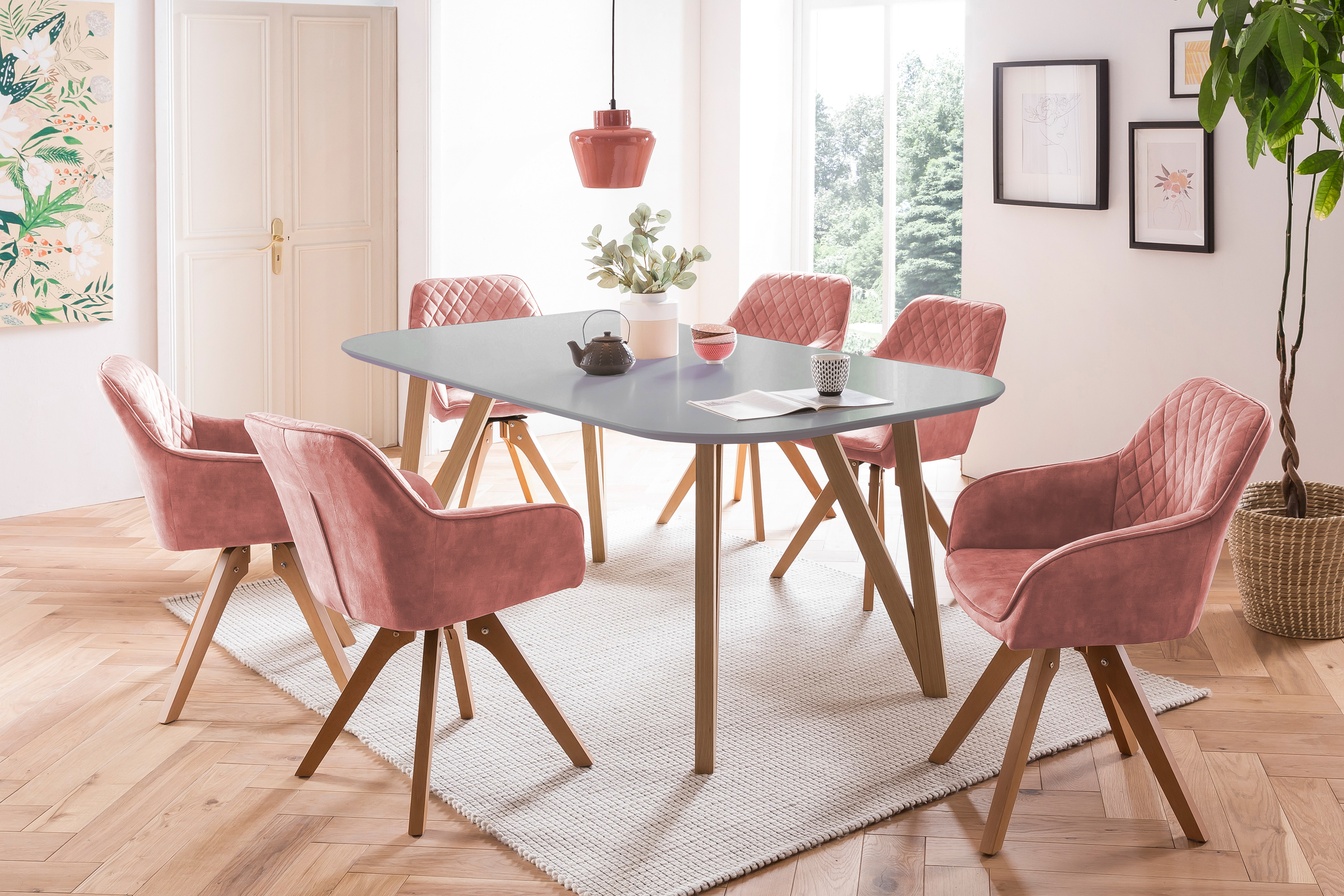 La table de repas tendance dans un style scandinave possède un plateau laqué ton gris mat. Ce dernier offre suffisamment de place pour recevoir la famille et les amis. Le piètement en équerre en chêne massif ne garantit pas seulement une excellente stabilité, mais offre aussi un superbe contraste avec le plateau ovale ton gris. Grâce à son design sobre, la table de salle à manger s'adapte à différents types d'aménagements intérieurs tout en étant très facile d'entretien.