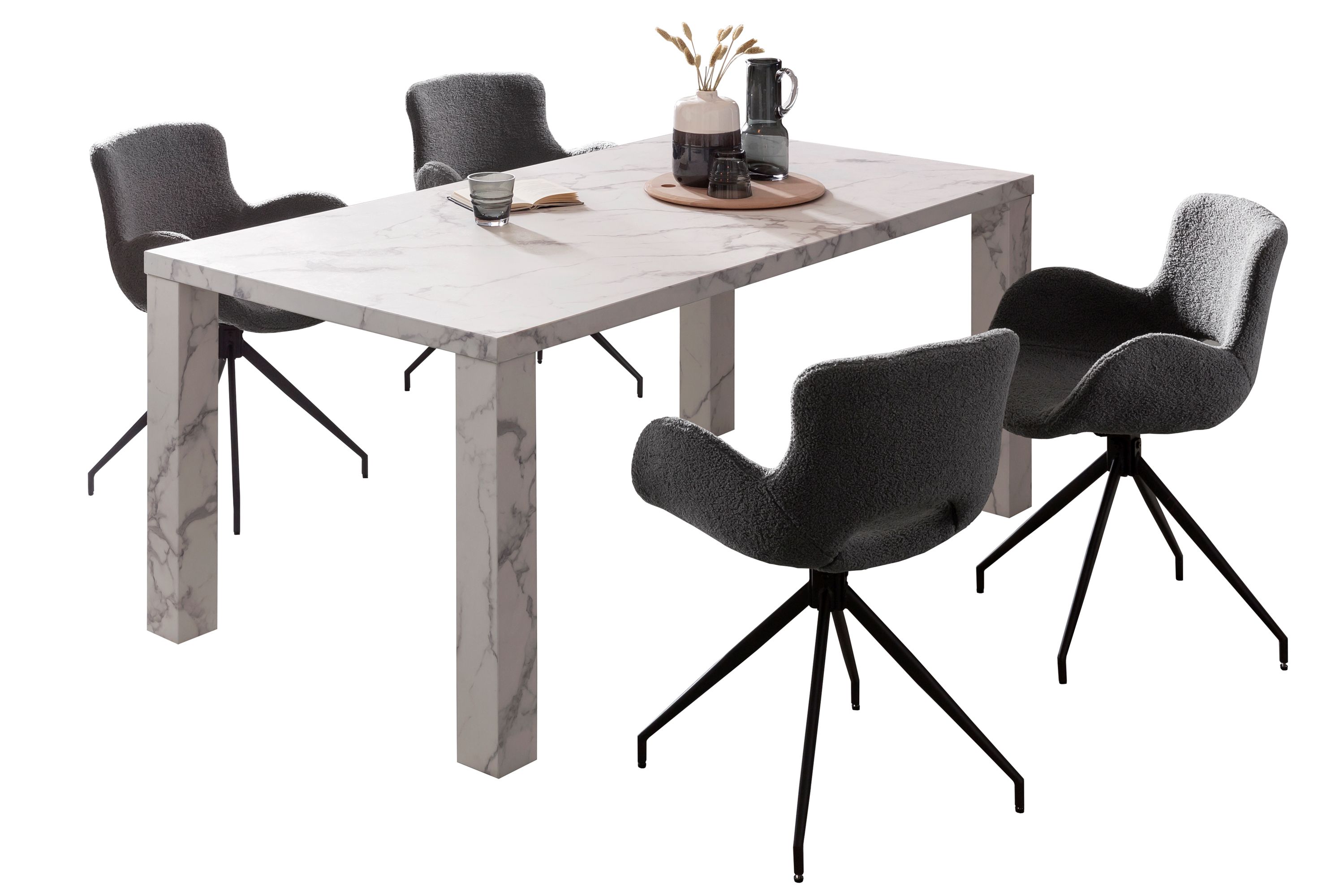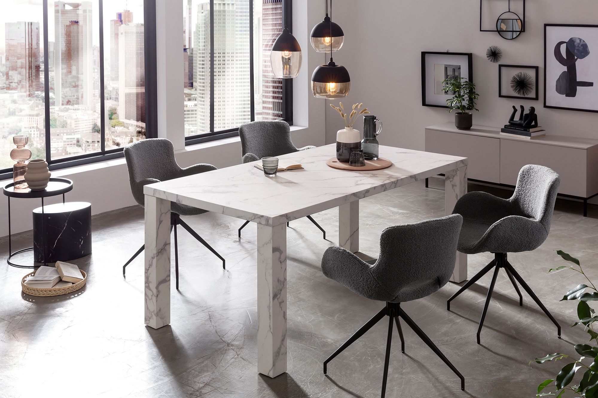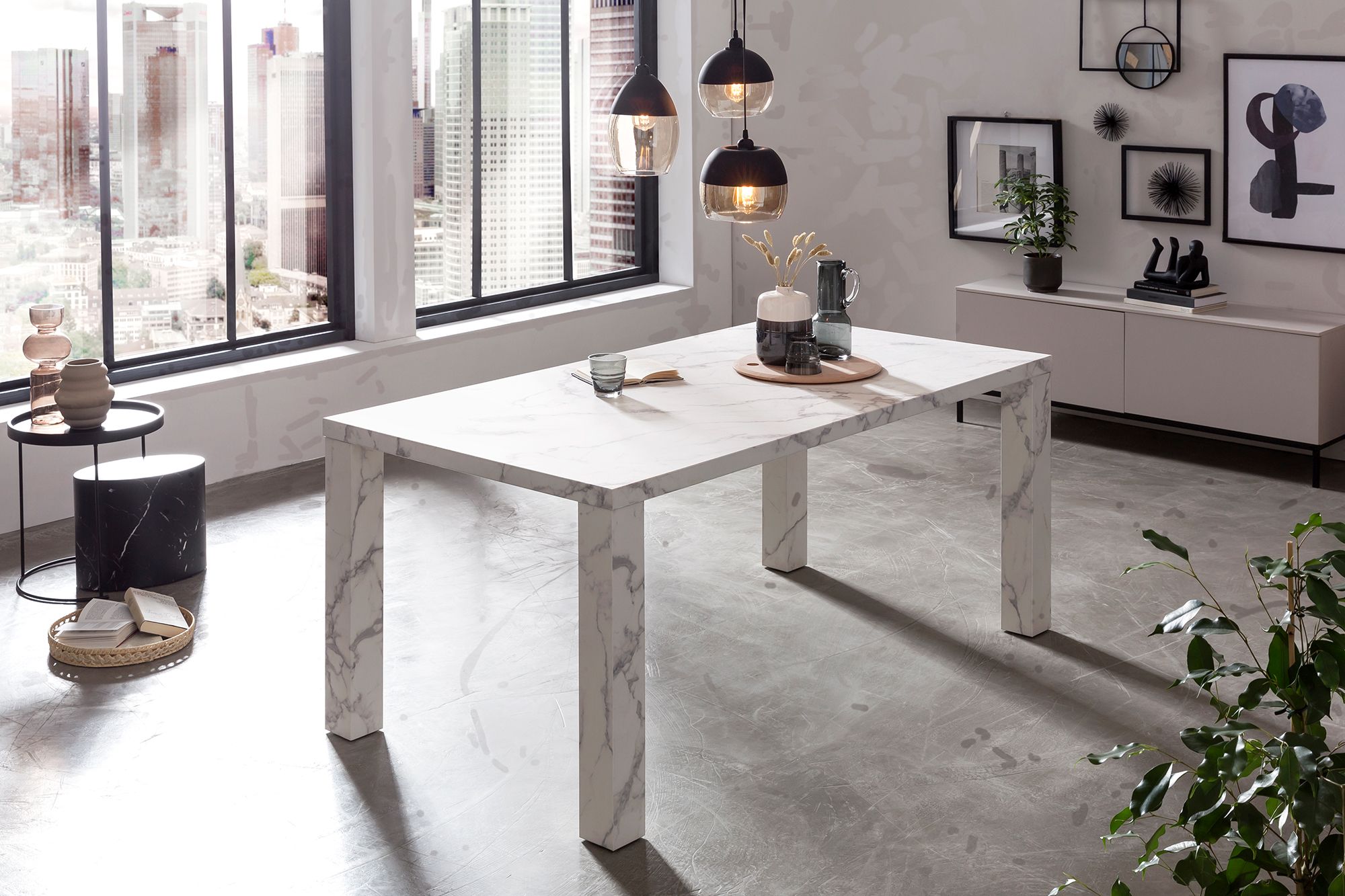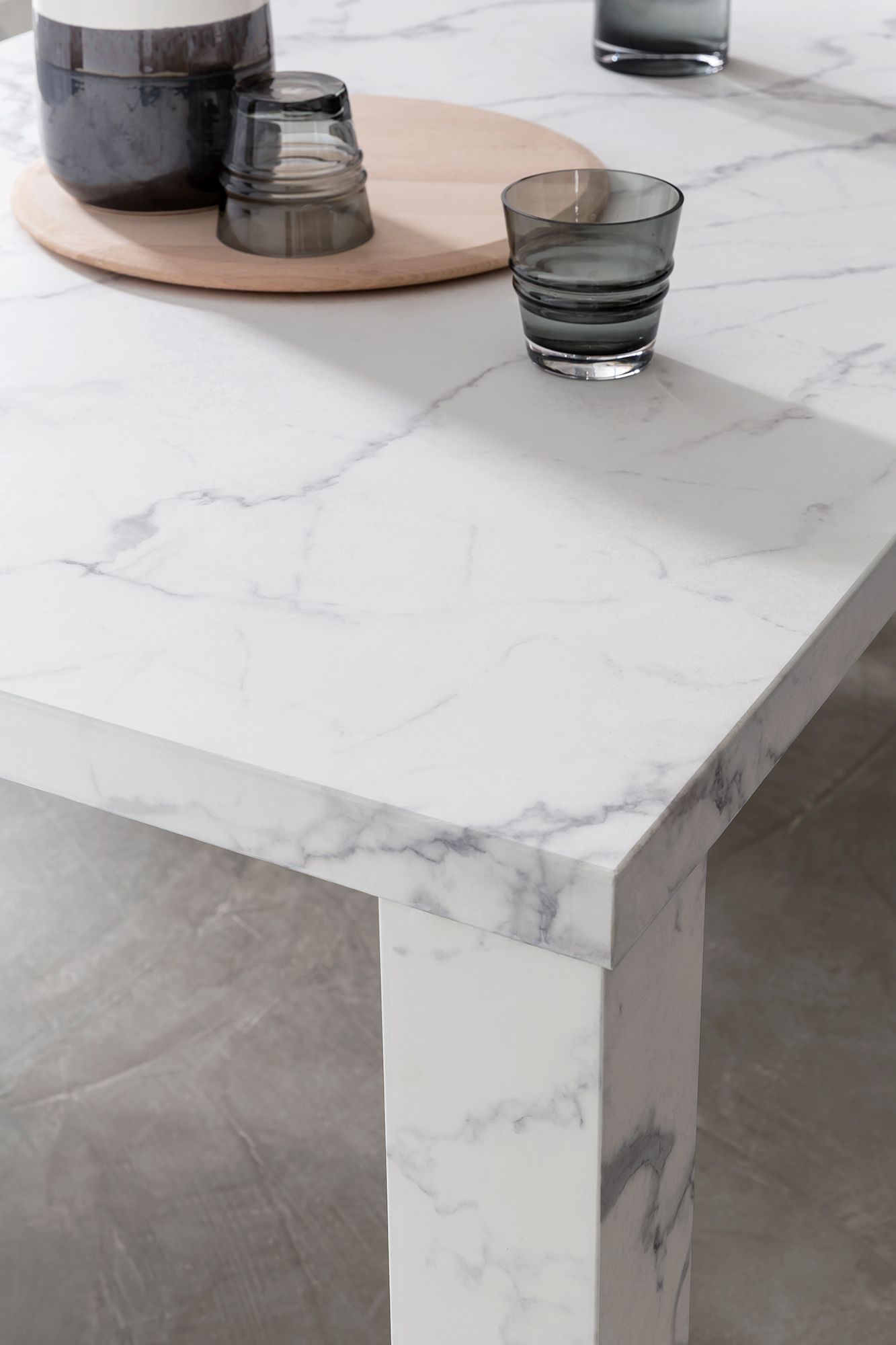 Cette table à dîner stylée rend le coin repas encore plus accueillant. La table est fabriquée en MDF de qualité. La surface est très résistante aux épreuves habituelles du quotidien. Les pieds particulièrement larges et l'effet marbre blanc lui confèrent beaucoup de charme. La table - qu'elle soit dans la cuisine ou la salle à manger - est souvent le centre des interactions sociales. Ici, on mange, on boit, on rit, on joue et on discute ensemble.