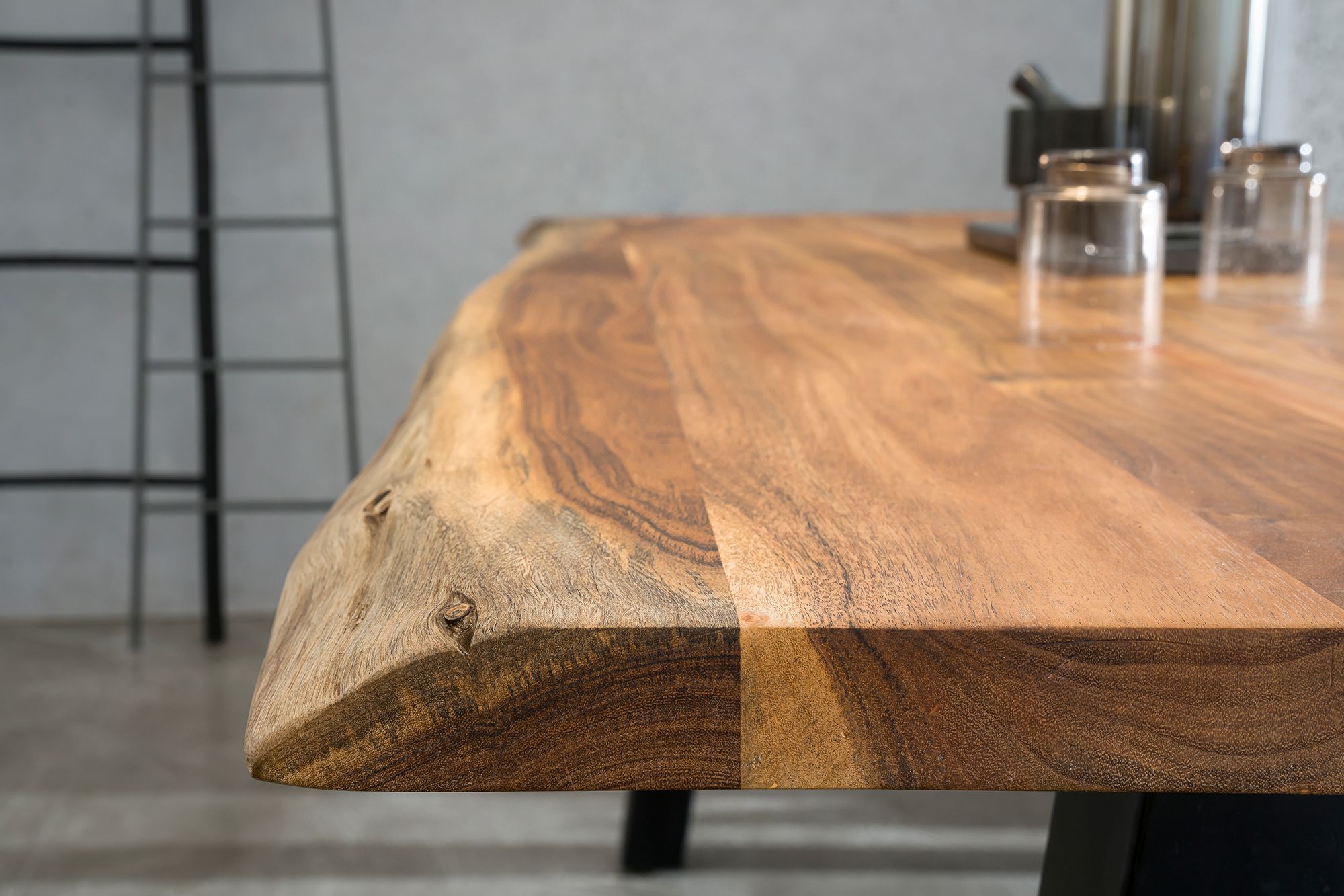 Les meubles en bois massif d'acacia font partie d'un mobilier à la fois beau et intemporel qui n'est jamais démodé. Le plateau de table de 35 mm d'épaisseur aux chants de forme naturelle est en bois d'acacia. Il a été huilé et ciré deux fois, ce qui rend la surface résistante et déperlante. Le piètement en H en métal noir confère à la table une excellente stabilité et représente un contraste bienvenu avec le joli plateau ton naturel. Cette table de salle à manger est bien plus qu'un endroit pour prendre le repas. Faites entrer un peu de nature dans votre intérieur. Remarque : comme cette table en bois massif est un produit naturel, elle peut présenter des nœuds ou des variations de teinte qui ne sont pas des défauts, mais qui soulignent le caractère individuel du bois véritable. La profondeur peut également varier en raison de la forme naturelle. Tous ces détails font de cette table à dîner une pièce véritablement unique.