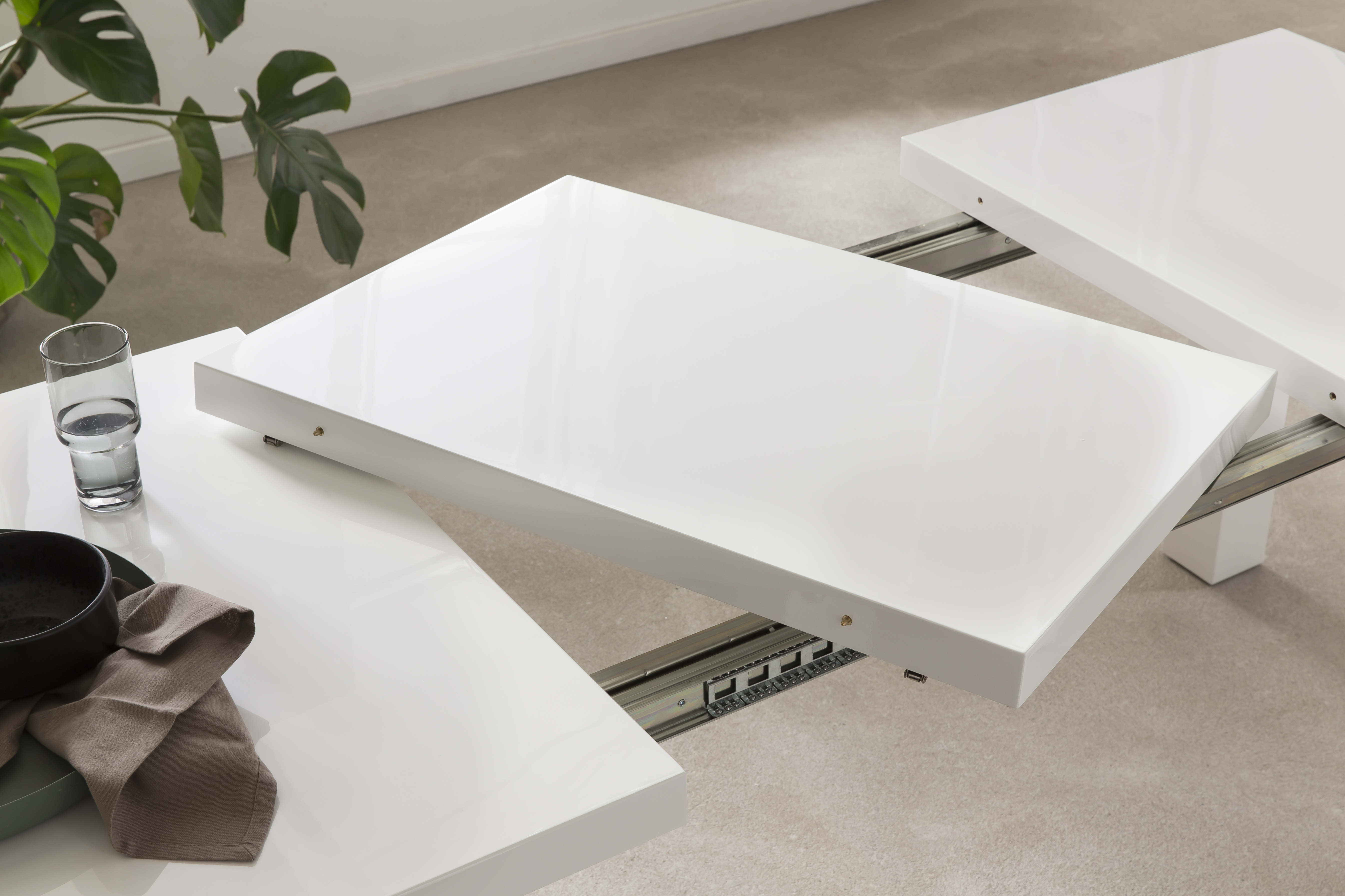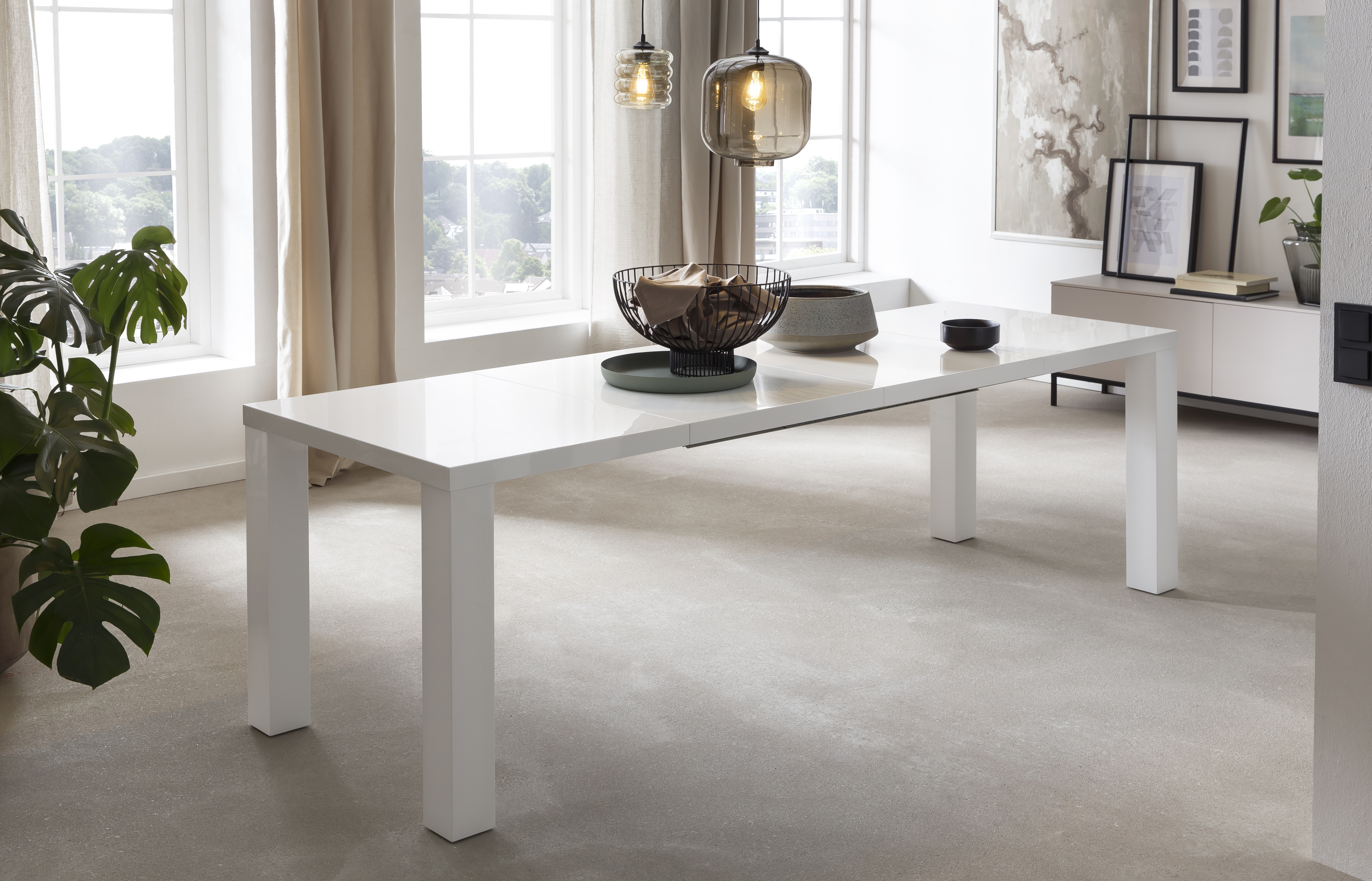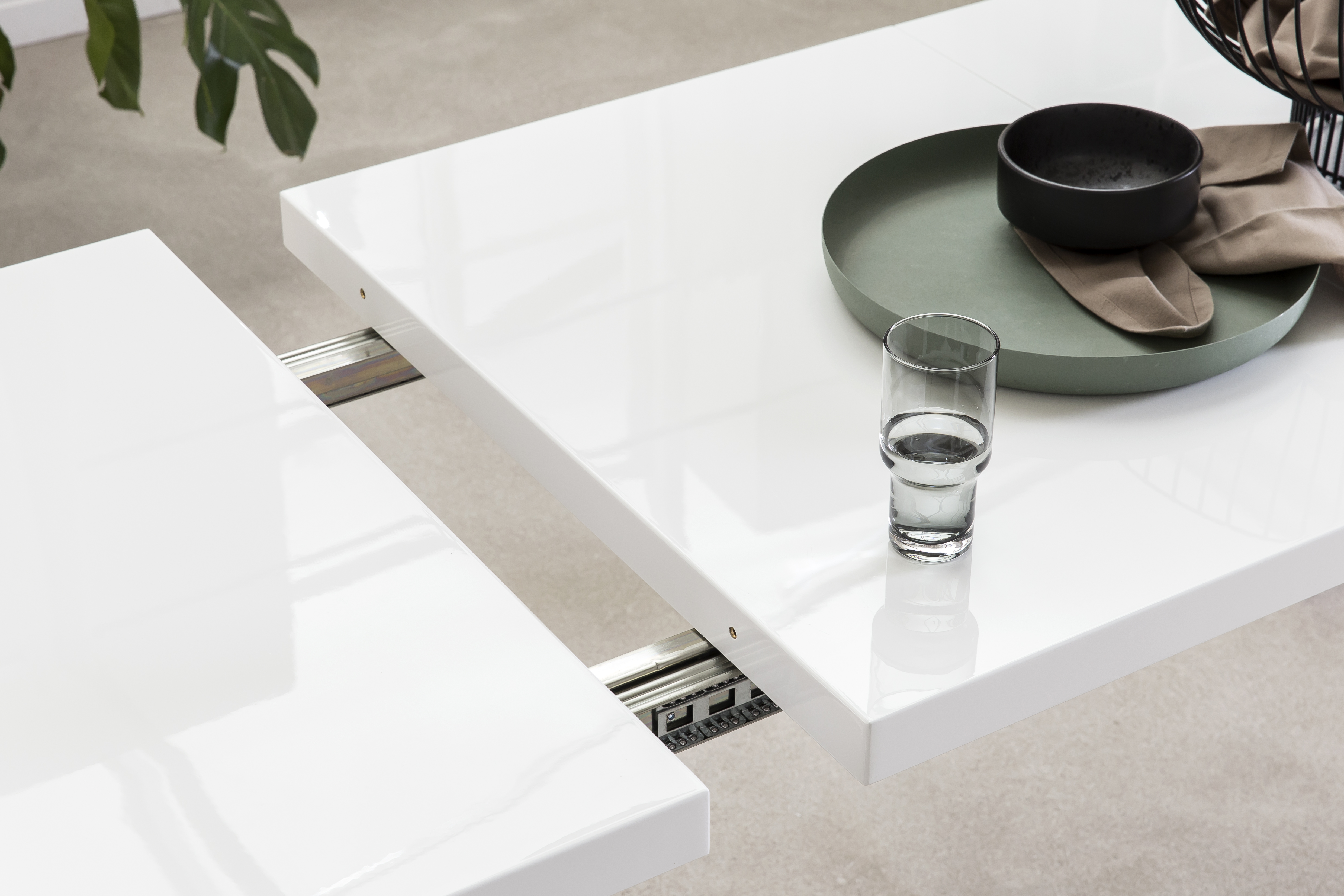 Si vous aimez les meubles aux lignes épurées, vous allez adorer cette table à dîner. Cette table conférera à votre salle à manger ou à votre cuisine l'éclat qu'elle mérite. La table est fabriquée en bois MDF. Grâce au vernis ultra brillant ton blanc, les formes aux lignes claires sont joliment mises en valeur. Les quatre pieds ne sont pas seulement ultra larges, ils confèrent aussi à la table une excellente stabilité. Et si une visite surprise s'invite chez vous, vous pouvez agrandir le plateau de table à l'aide des deux rallonges jusqu'à 240 cm de longueur. La table de salle à manger ne constitue pas seulement un espace pratique pour prendre le repas : c'est également un lieu de rencontre pour les soirées jeux entre amis ou en famille.