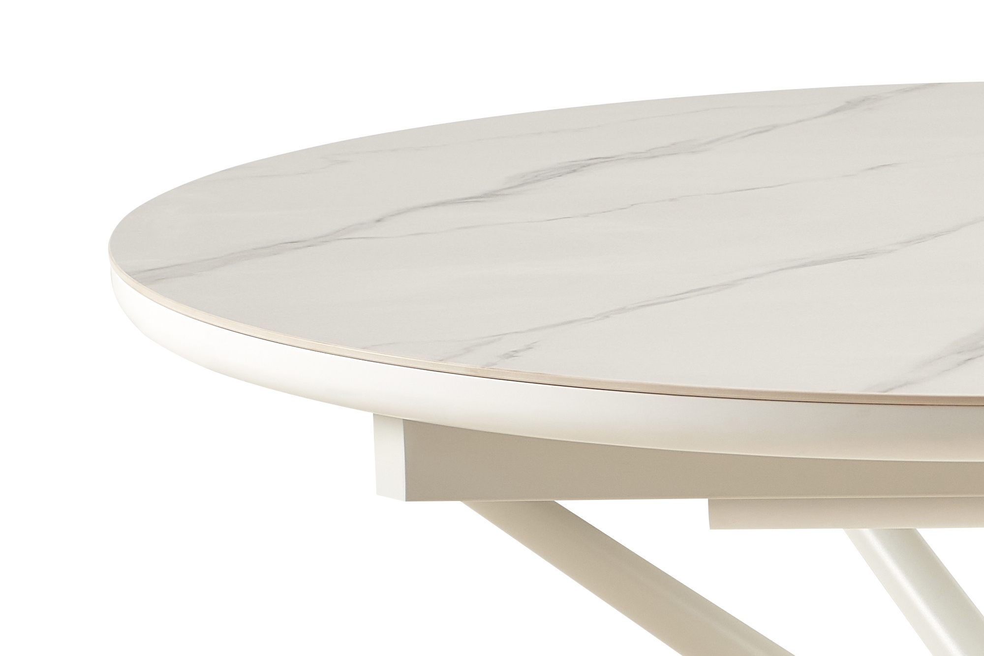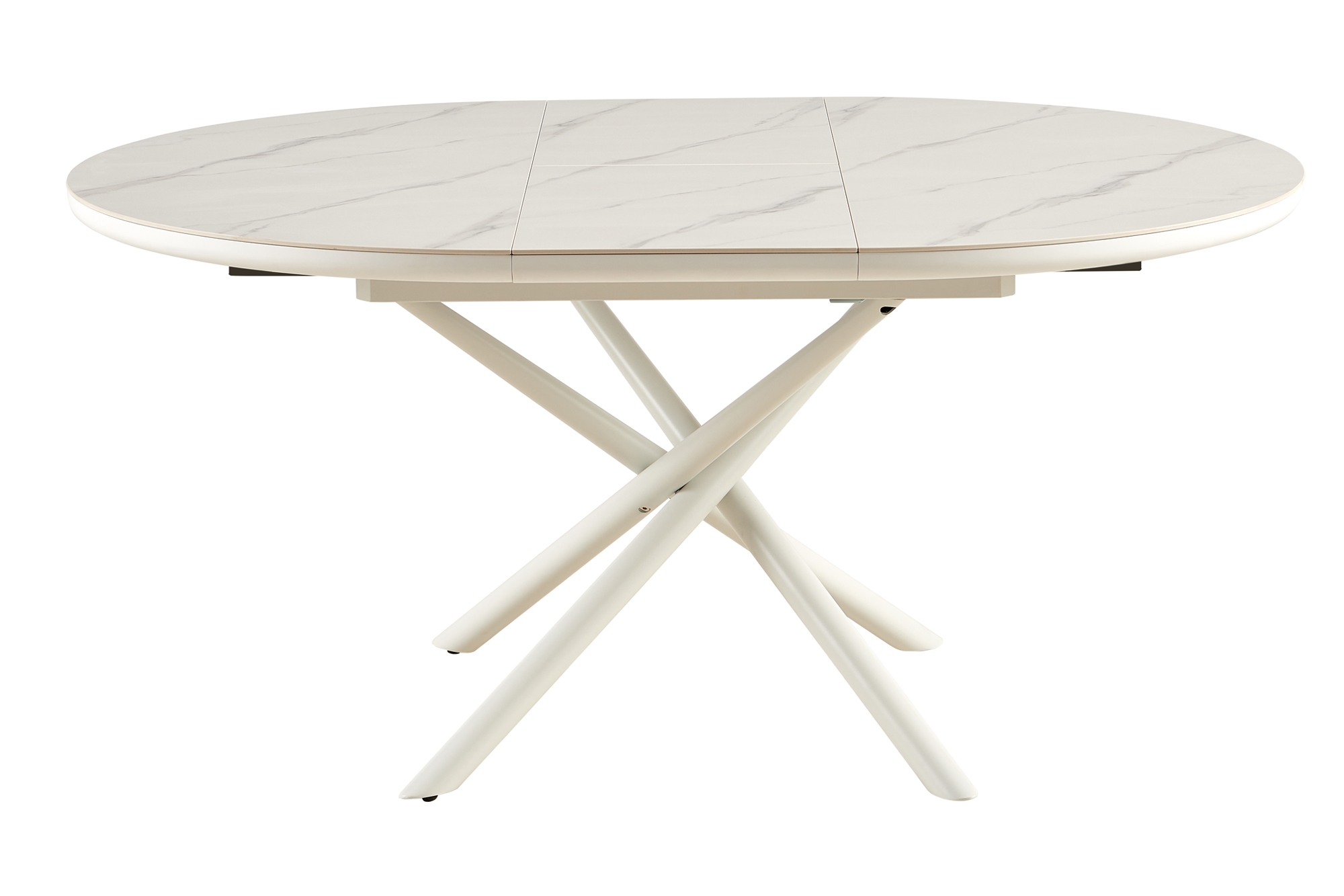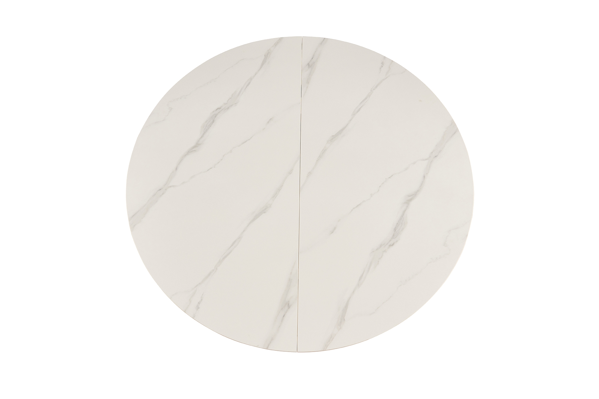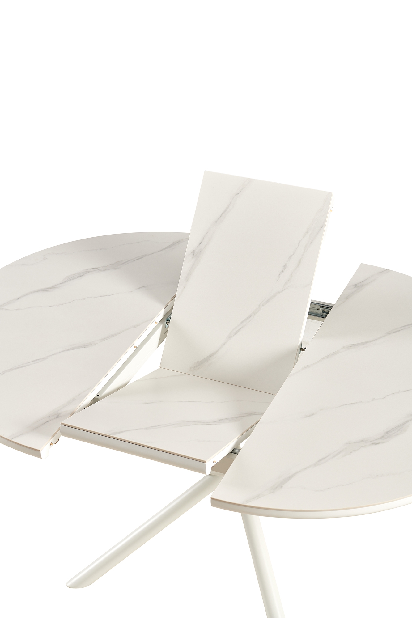 Un design ultra tendance et une utilisation très pratique. Cette table de salle à manger à rallonges n'attire pas seulement le regard, elle s'agrandit aussi facilement en quelques gestes. Pour les fêtes de famille, les invités surprises ou les soirées conviviales entre amis, la table peut être facilement agrandie jusqu'à une taille de 160x120 cm grâce aux deux rallonges amovibles. La surface dans un aspect marbre minimaliste est intemporelle et chic ; elle s'harmonise parfaitement avec le piètement design de forme étoilée. L’effet mat apporte la touche final à l’ensemble. Sans les rallonges, la table a un diamètre de 120 cm. Les tables rondes permettent de gagner de la place, surtout dans les petites salles à manger, et d'avoir des conversations agréables autour d'une table.