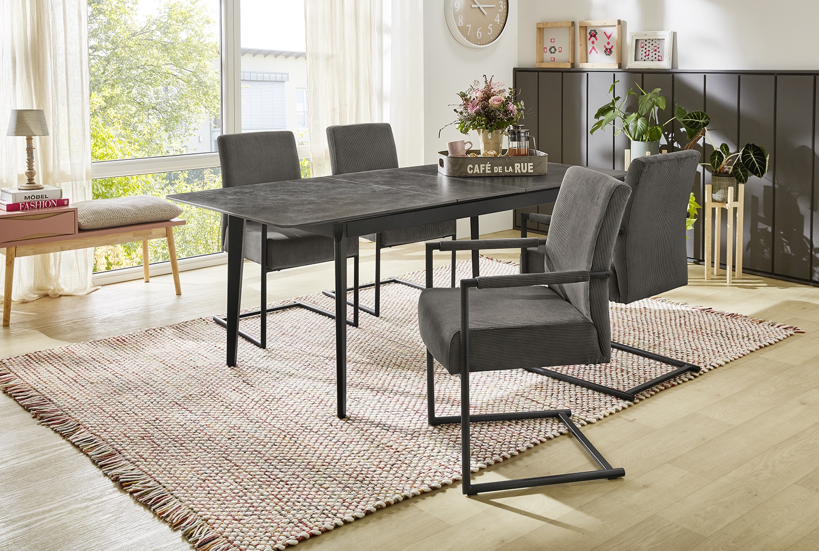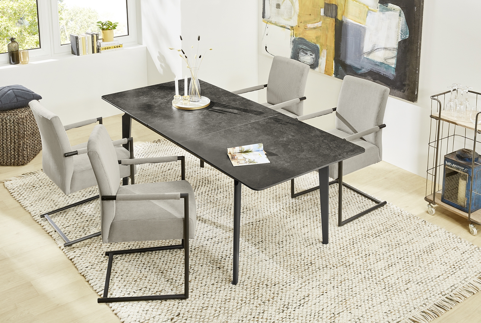 Plateau de table avec système de rallonge synchrone, fonction de relevage et rallonge amovible