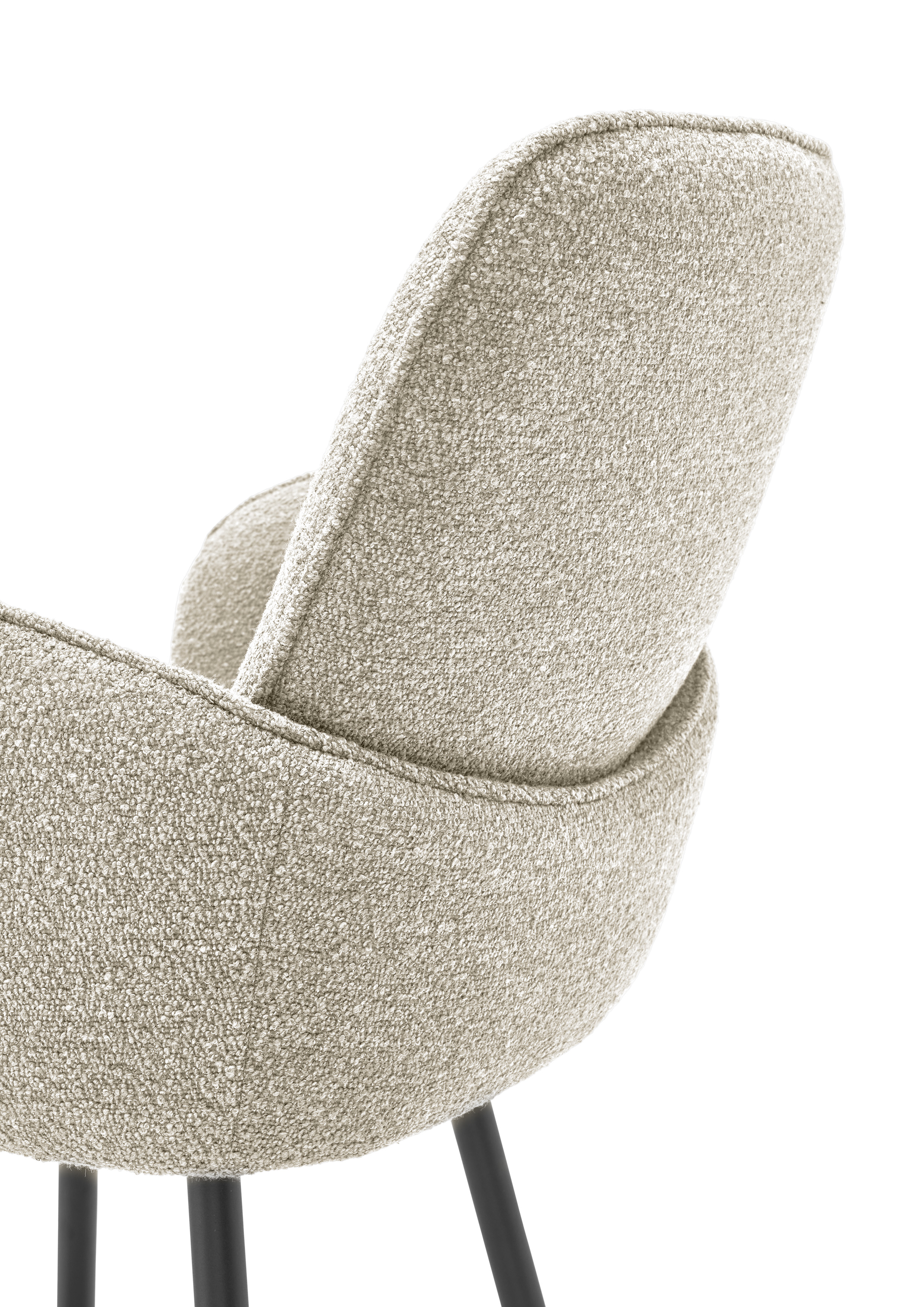 Les assises rembourrées sont recouvertes d'un tissu structuré durable, offrent un toucher agréable et contribuent à créer une atmosphère accueillante. Le piètement en métal noir assure une bonne stabilité et une longue durée de vie. La fonction de rotation à 180° avec retour automatique est particulièrement pratique, car elle permet de s'asseoir de manière flexible et de s'asseoir et de se lever confortablement.