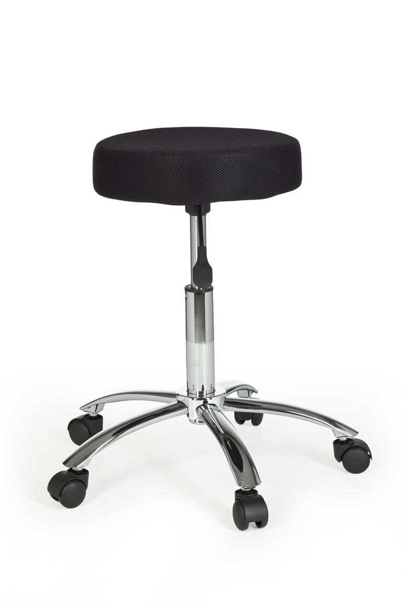 Tabouret de travail robuste avec assise recouverte d'un tissu résille (mesh) ton noir.