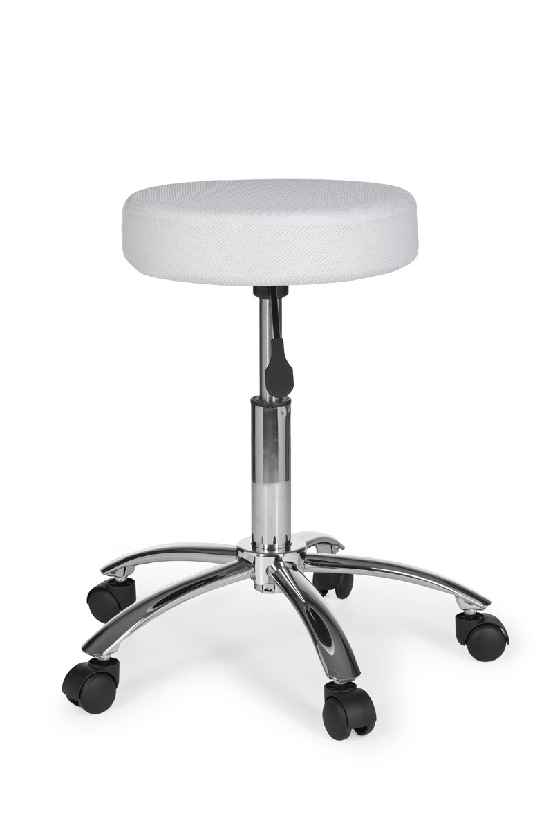 Tabouret de travail robuste avec assise recouverte d'un tissu résille (mesh) ton blanc.