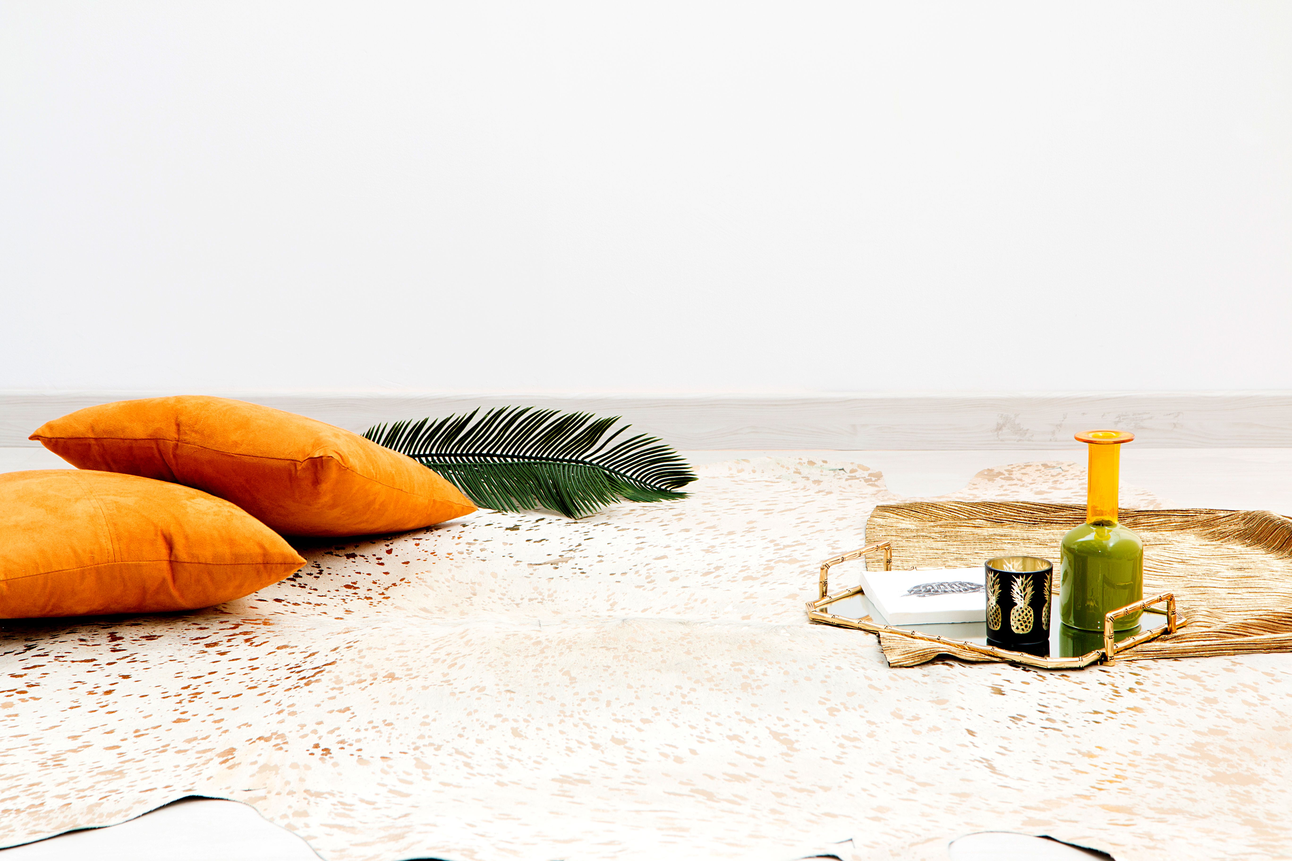 Chaque tapis est une pièce unique avec des variations pouvant atteindre jusqu’à 30 % en termes de texture, structure, forme et couleur ; ceci est dû à la nature même du matériau. Avec le temps et une utilisation intensive, le cuir teinté peut perdre quelques poils ou légèrement déteindre. De même, les reflets métalliques peuvent se détacher par endroits. Ces caractéristiques sont inhérentes au matériau naturel et ne constituent pas un défaut de fabrication.