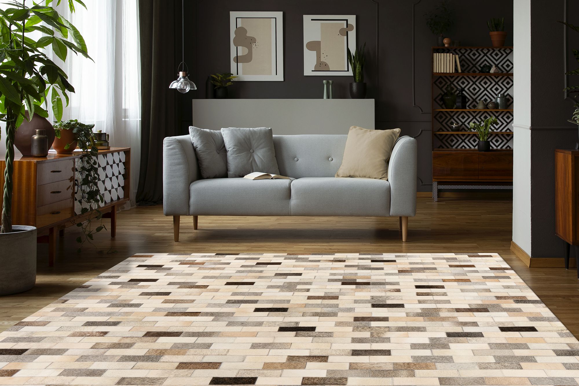 Ce tapis de qualité supérieure est disponible dans trois coloris et tailles ; il se caractérise par son design unique et ses matériaux naturels. Peu importe la pièce où se trouve ce tapis à poils courts en cuir de vachette : les effets métalliques apportent une touche élégante qui attire immédiatement le regard.