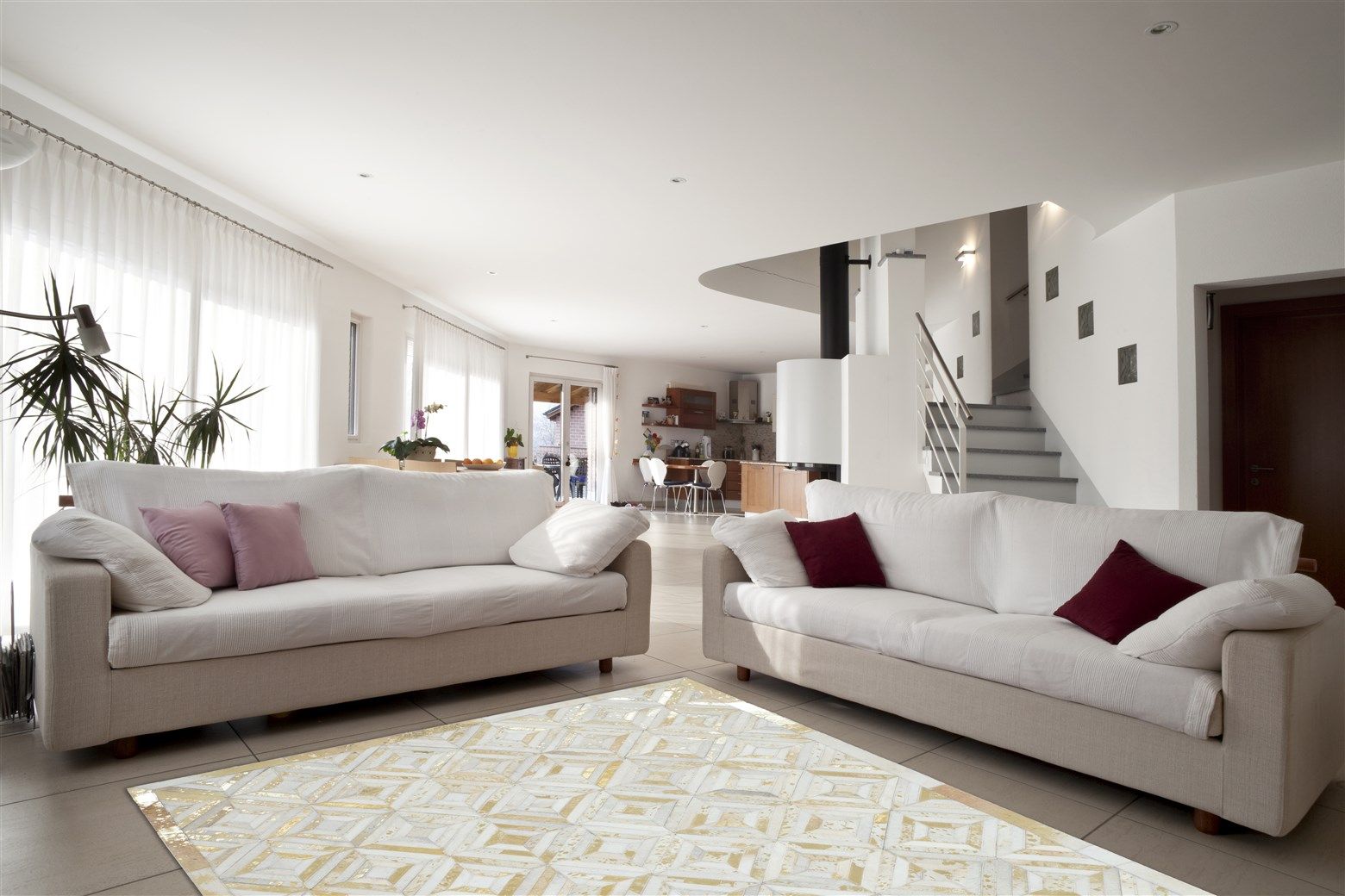 Ce superbe tapis en cuir avec détails incrustés dans un film métallisé apportera la touche finale à un intérieur luxueux. Cet élégant tapis de qualité 100 % cuir imprime une touche individuelle à la pièce tout en lui conférant un charme inimitable. Fabriqué à la main, chaque tapis en cuir est une pièce unique. L’utilisation de matériaux nobles et la finition de qualité créent un effet dynamique et font de chaque tapis un modèle unique : en effet, en raison des caractéristiques naturelles, la forme, la couleur et le motif peuvent varier jusqu’à 30 % par rapport au modèle original. En cas d’utilisation intensive et après un certain temps, il est possible que ce tapis perde des poils. De même, le film métallisé peut se détacher dans certaines circonstances. Ceci est dû aux caractéristiques de ce produit naturel : il ne s’agit pas d’un défaut de fabrication.