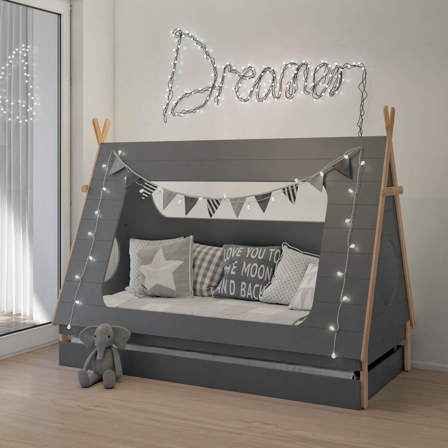 Une jolie façon d'améliorer encore le lit d'enfant moderne : avec ce tiroir assorti au lit en forme de tipi (n° art. 510655-00), créez facilement un espace de rangement supplémentaire dans la chambre d'enfant. Ce tiroir avec permet de ranger, par exemple, le linge de lit, les vêtements de saison ou les jouets. Dans la version moderne du tiroir de lit classique, vous ne pourrez pas seulement ranger les objets du quotidien : le tiroir est également prévu pour accueillir un matelas de 90x190 cm. Le lit junior se transforme ainsi en lit gigogne : créer un espace de couchage supplémentaire ou le faire disparaître en le poussant sous le lit devient un jeu d'enfant. Une solution idéale si votre enfant souhaite accueillir des copains ou des copines à la maison. Le design nordique tout en sobriété s'harmonise de façon optimale avec les lits enfants et s'intégrera à merveille dans un ameublement de style scandinave tendance.