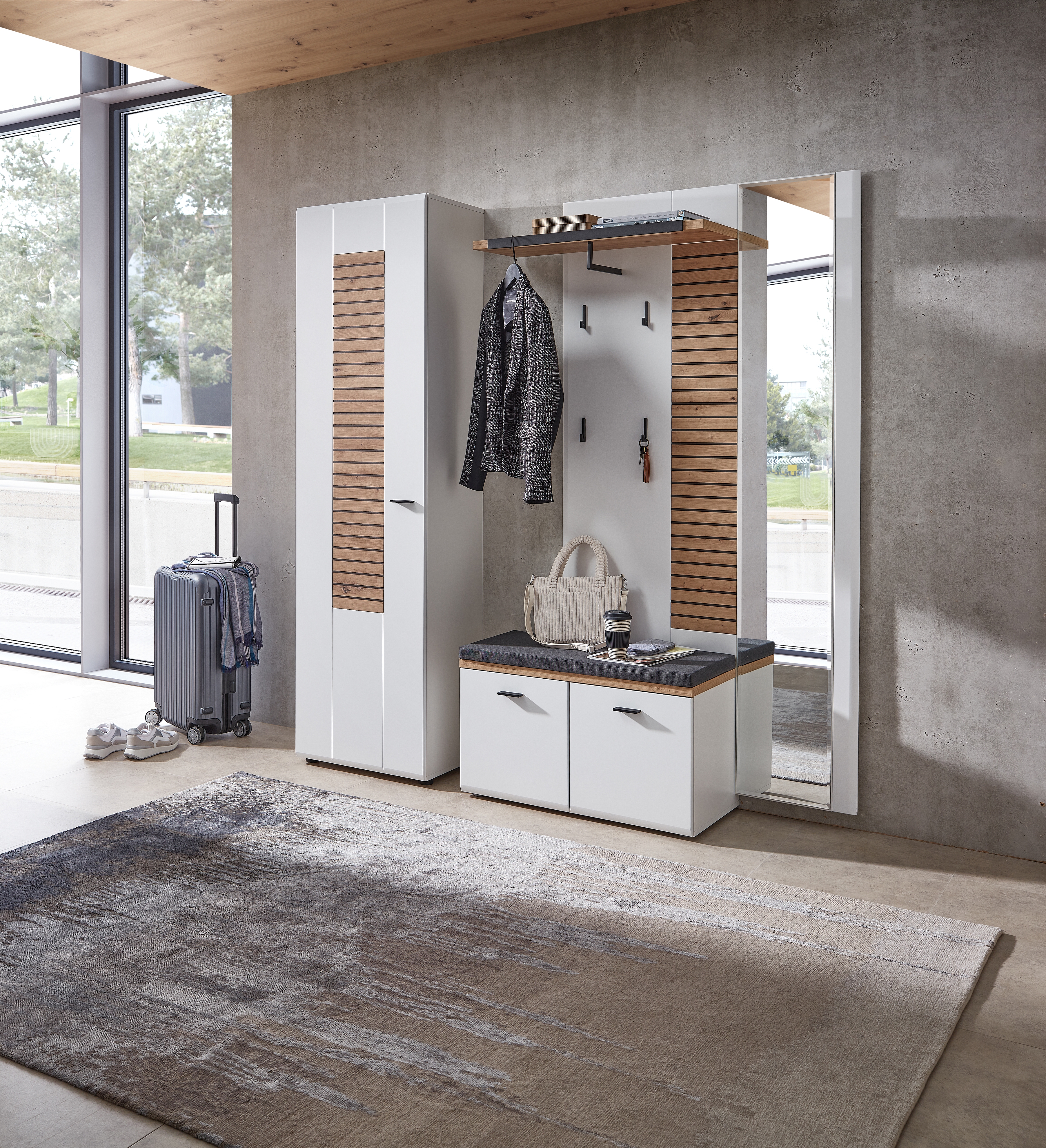 1 armoire d’entrée avec 1 porte, 1 tablette fixe avec barre de penderie extensible et 3 tablettes