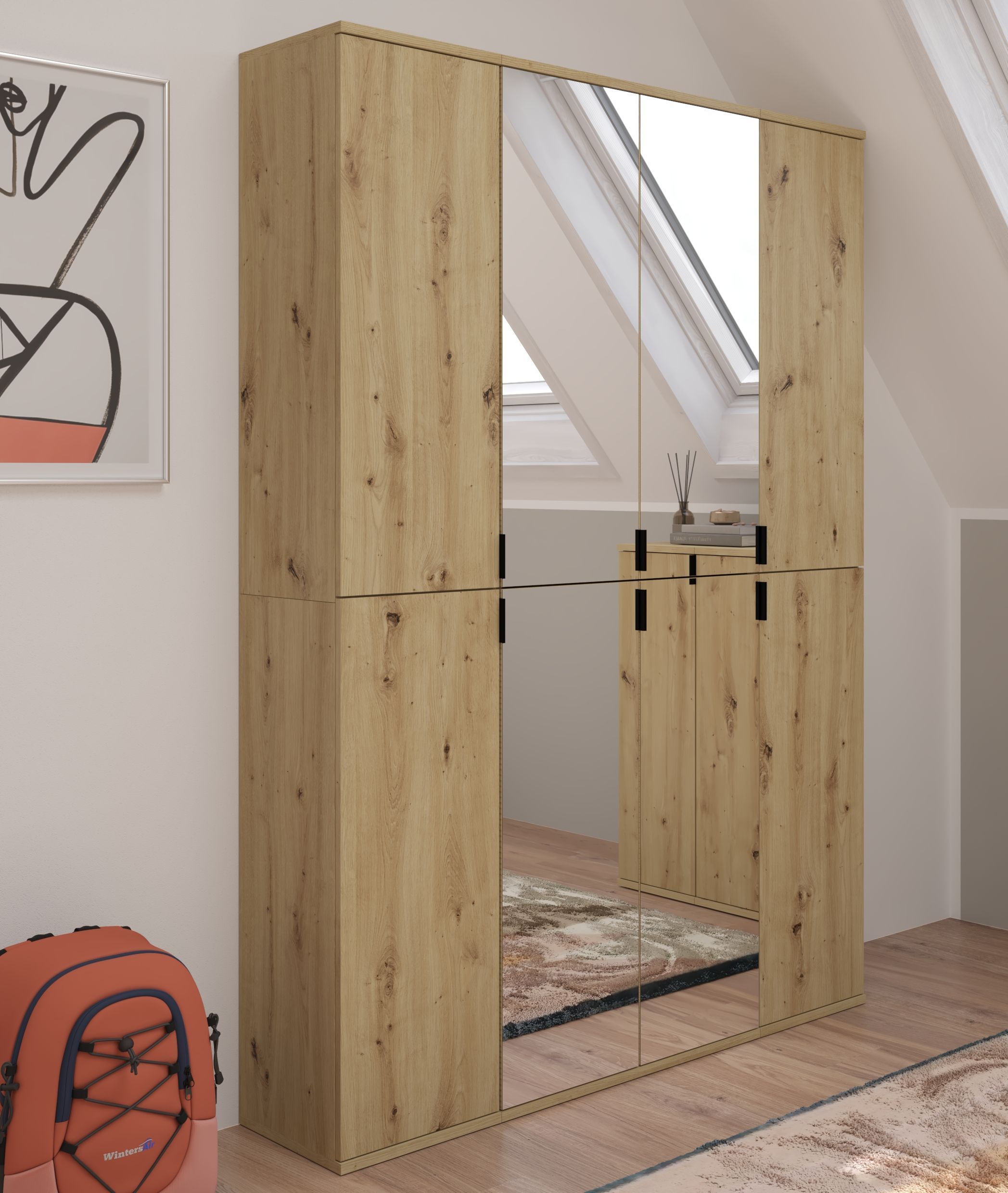 - Design/style : le vestiaire combiné décor chêne Artisan et miroir séduit par son élégance ultra tendance. Les portes miroir donnent au meuble un aspect attrayant et contemporain tandis que le décor chêne Artisan crée une impression de fraîcheur. Ce design simple et stylé s’adapte bien à différents styles d’intérieurs et confère à la pièce une ambiance claire et aérée.