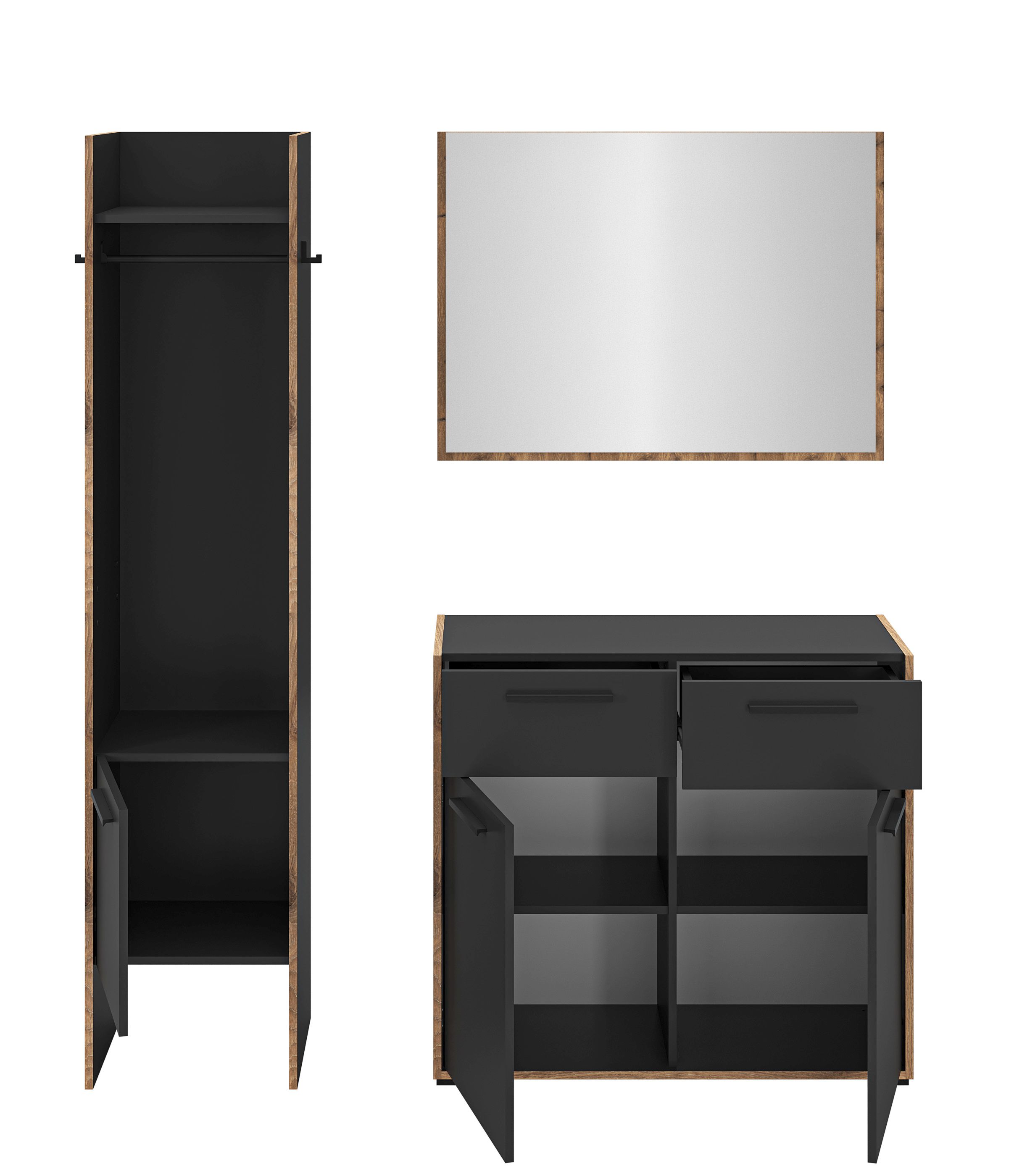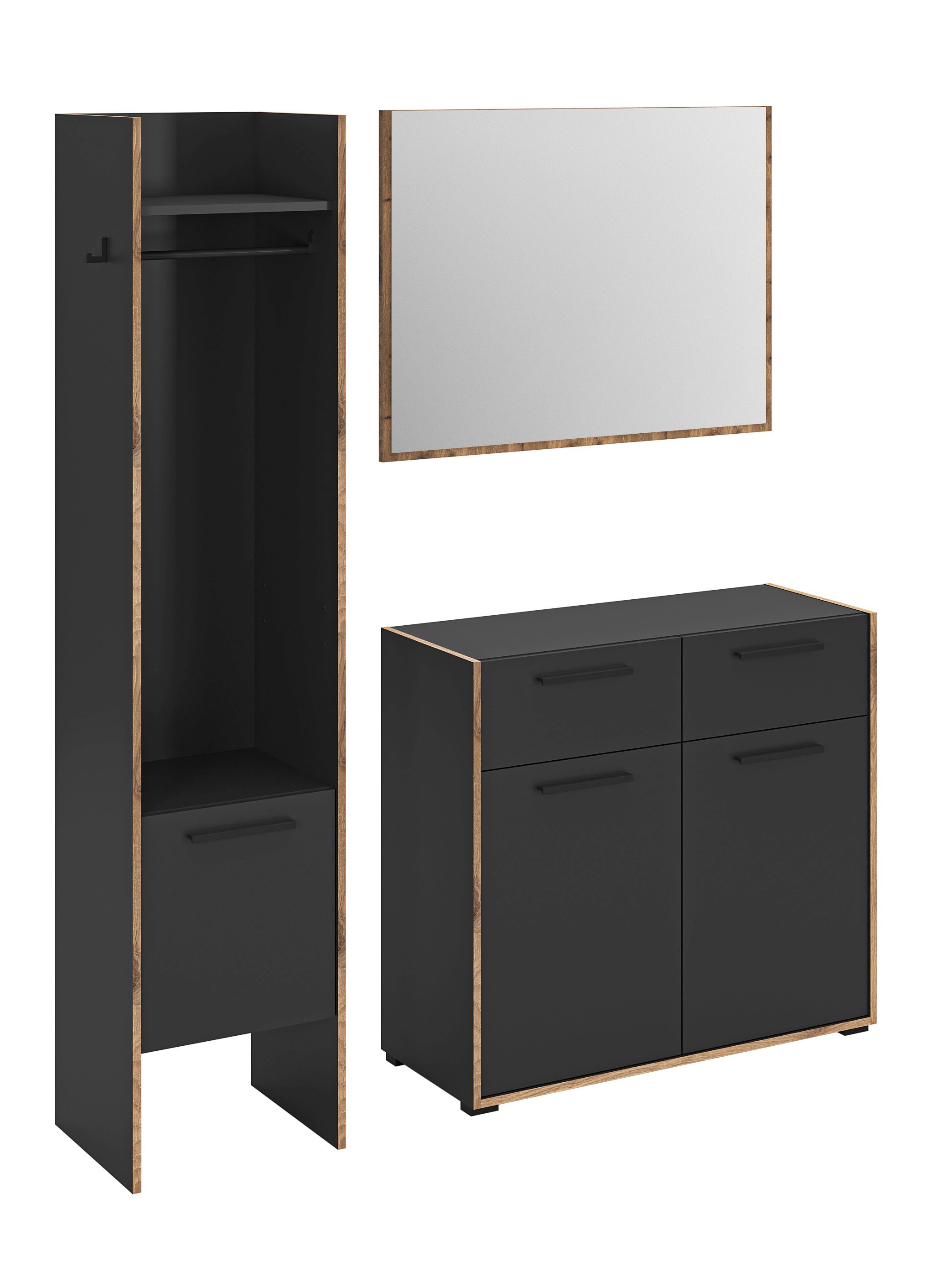 Ce vestiaire combiné constitue la solution parfaite pour aménager votre entrée de manière élégante et fonctionnelle. Il permet de faire régner l’ordre tout en vous accueillant chaque jour dans une atmosphère chaleureuse et agréable. Avec son design moderne en décor basalte, il crée des accents stylés et confère à votre intérieur une note conviviale. Cet ensemble bien pensé, composé d’un meuble de penderie étroit, d’une commode pratique et d’un grand miroir, allie esthétique et fonctionnalité au quotidien. L’assise intégrée, capable de supporter jusqu’à 90 kg, rend l’enfilage ou le retrait des chaussures particulièrement confortable et transforme chaque passage dans le couloir en moment de bien-être. Avec ses dimensions de 152 x 189 x 37 cm, le vestiaire combiné trouve sa place même dans les petits couloirs ou espaces exigus, sans compromis sur le rangement. Sa surface mélaminée robuste est à la fois résistante et facile d’entretien, et donc idéale pour une utilisation quotidienne. Vestes, chaussures ou accessoires trouvent facilement leur place et restent à portée de main. Ce meuble d’entrée devient un point d’ancrage pratique en rentrant chez soi ou un compagnon élégant pour bien commencer la journée. Faites confiance à une finition de qualité et à un design intemporel qui vous accompagneront pendant de nombreuses années. Transformez dès aujourd’hui votre entrée en un espace accueillant et bien organisé ! Avec ses dimensions de 95 x 86 x 37 cm, la commode s’intègre aussi parfaitement dans différents espaces – que ce soit dans le salon, la chambre ou l’entrée. Utilisez les tiroirs pour vos vêtements ou fournitures de bureau, les compartiments fermés pour vos livres ou objets décoratifs, et créez ainsi un environnement ordonné qui reflète votre style personnel.