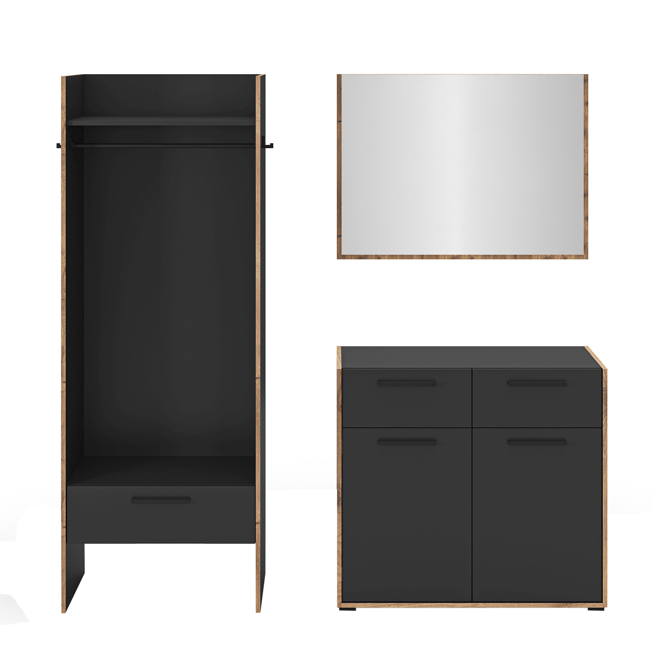Ce vestiaire combiné ne se contente pas d’offrir un espace de rangement pratique : il créera aussi une entrée accueillante pour faciliter votre quotidien. Imaginez-vous commencer la journée confortablemene installé∙e sur l’assise intégrée- capable de supporter jusqu’à 90 kg - en enfilant votre veste : cet ensemble est ainsi l'équilibre parfait entre confort et fonctionnalité. Son design moderne en décor basalte confèrera à votre couloir une atmosphère stylée et contemporaine, propice au bien-être dès les premiers instants. Composé d’un armoire de penderie, d’une commode et d’un miroir, cet ensemble polyvalent se distingue par sa conception bien pensée. Avec ses dimensions généreuses de (LxHxP) 180 x 189 x 37 cm, le vestiaire offre suffisamment de place pour vos vêtements, chaussures et accessoires du quotidien. Le mélange de matériaux de qualité avec surface mélaminée garantit une durée de vie accrue et un entretien facile. Qu’il s’agisse de ranger vos manteaux ou de poser vos clés ou vos sacs, ce meuble d’entrée polyvalent s’adapte à toutes les situations et deviendra vite indispensable dans votre intérieur.