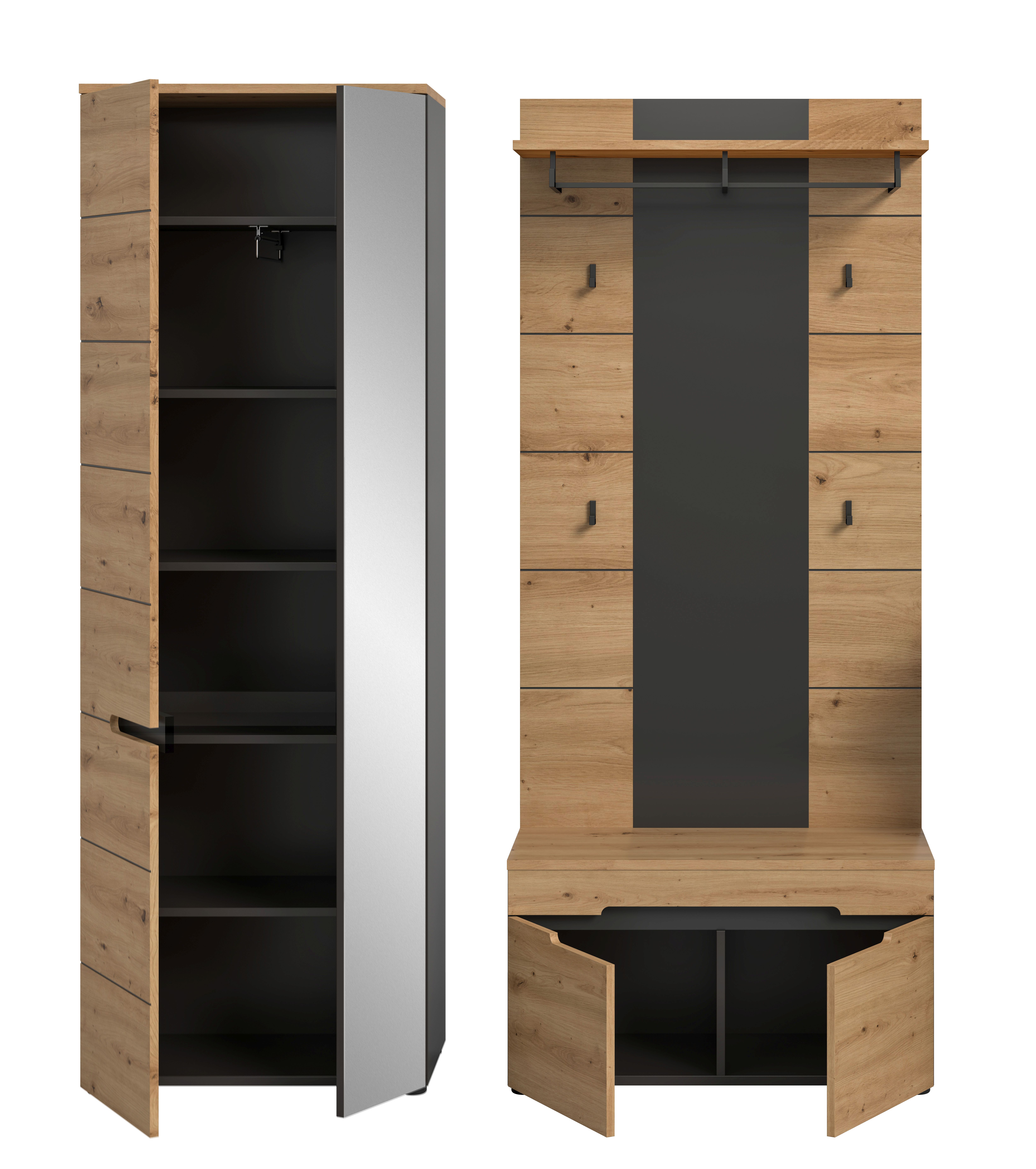 1 armoire d’entrée avec 2 portes (dont 1 porte avec miroir), 1 tablette fixe, 1 barre de penderie et 4 tablettes amovibles
