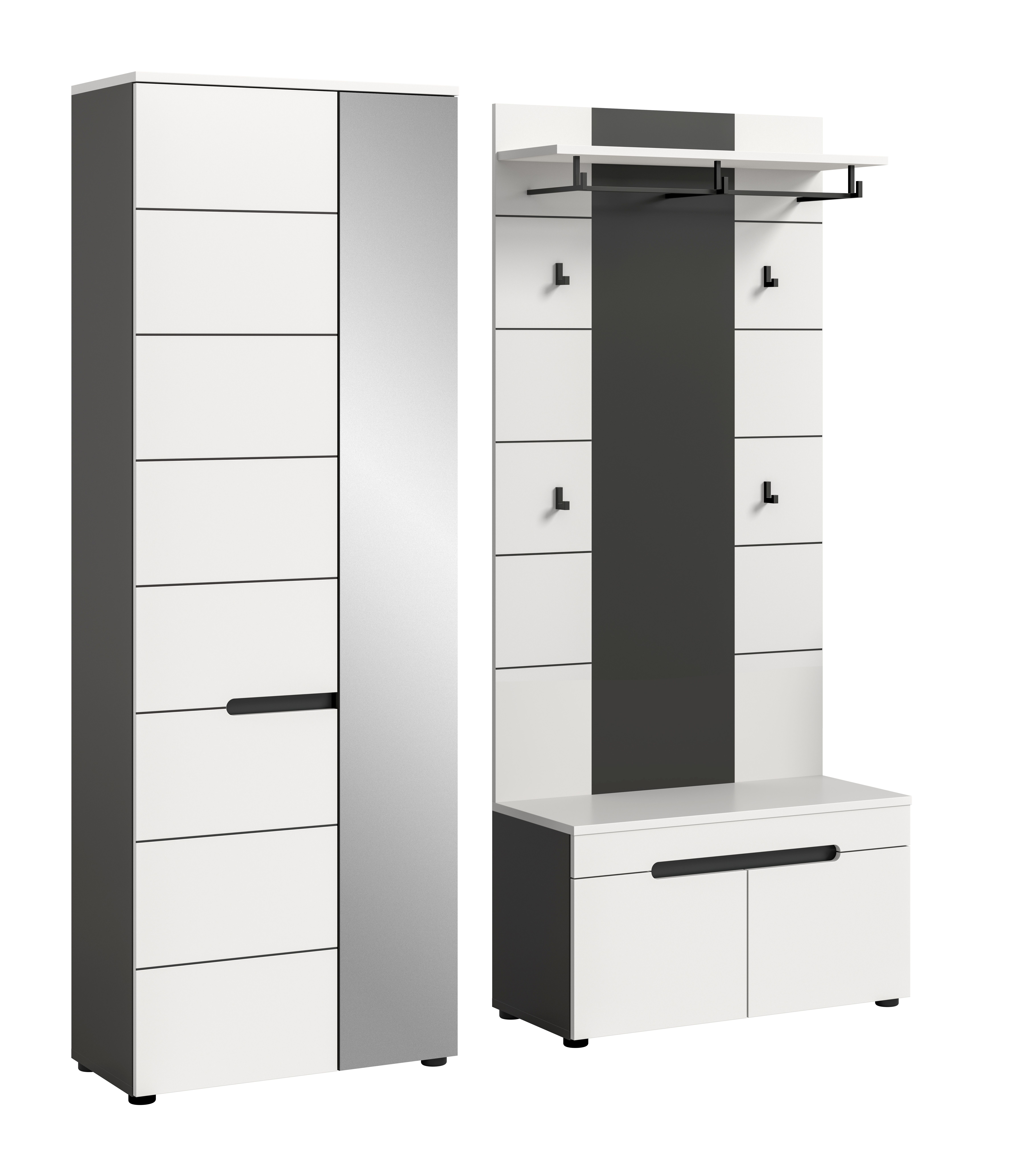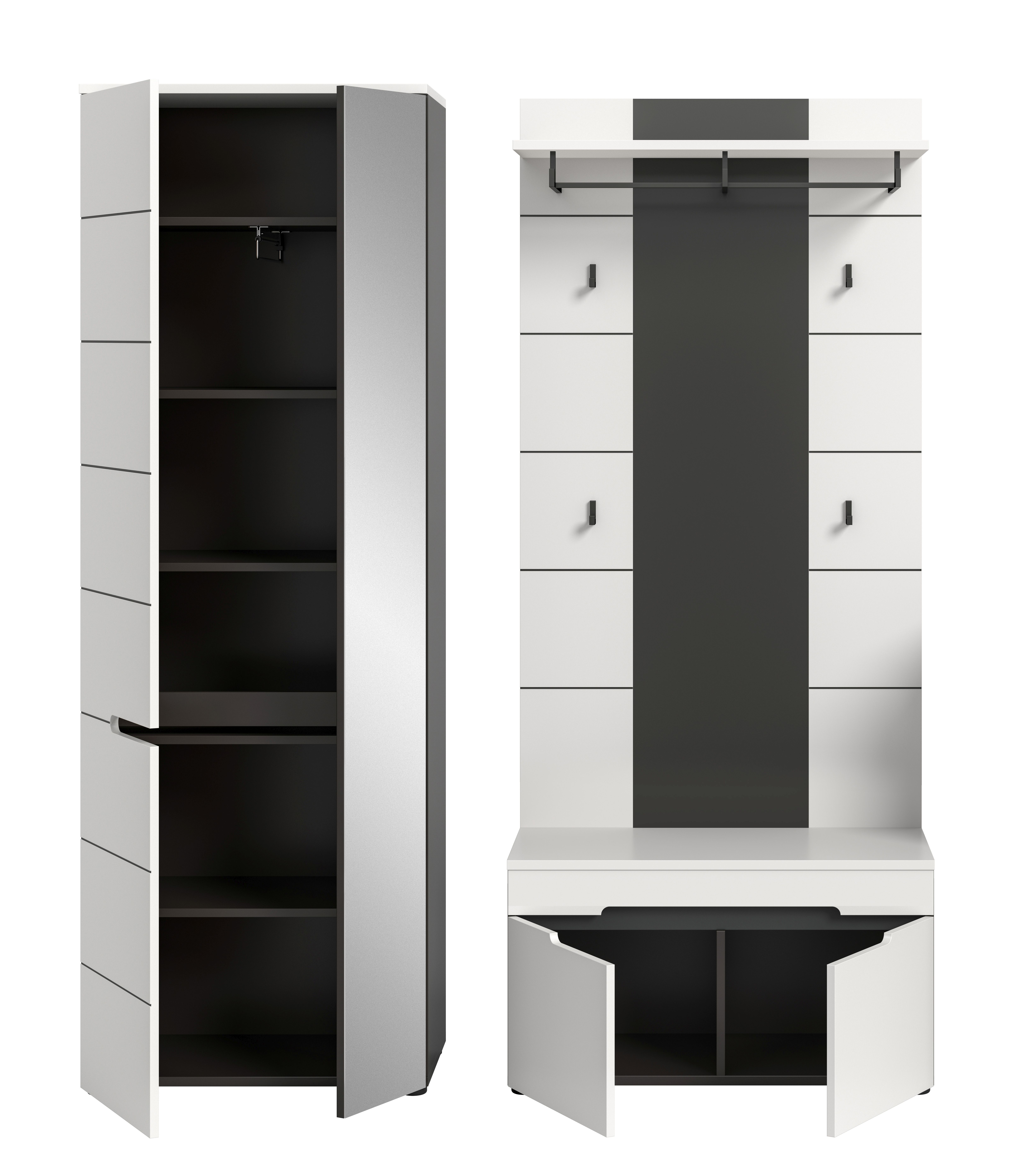 1 armoire d’entrée avec 2 portes (dont 1 porte avec miroir), 1 tablette fixe, 1 barre de penderie et 4 tablettes amovibles