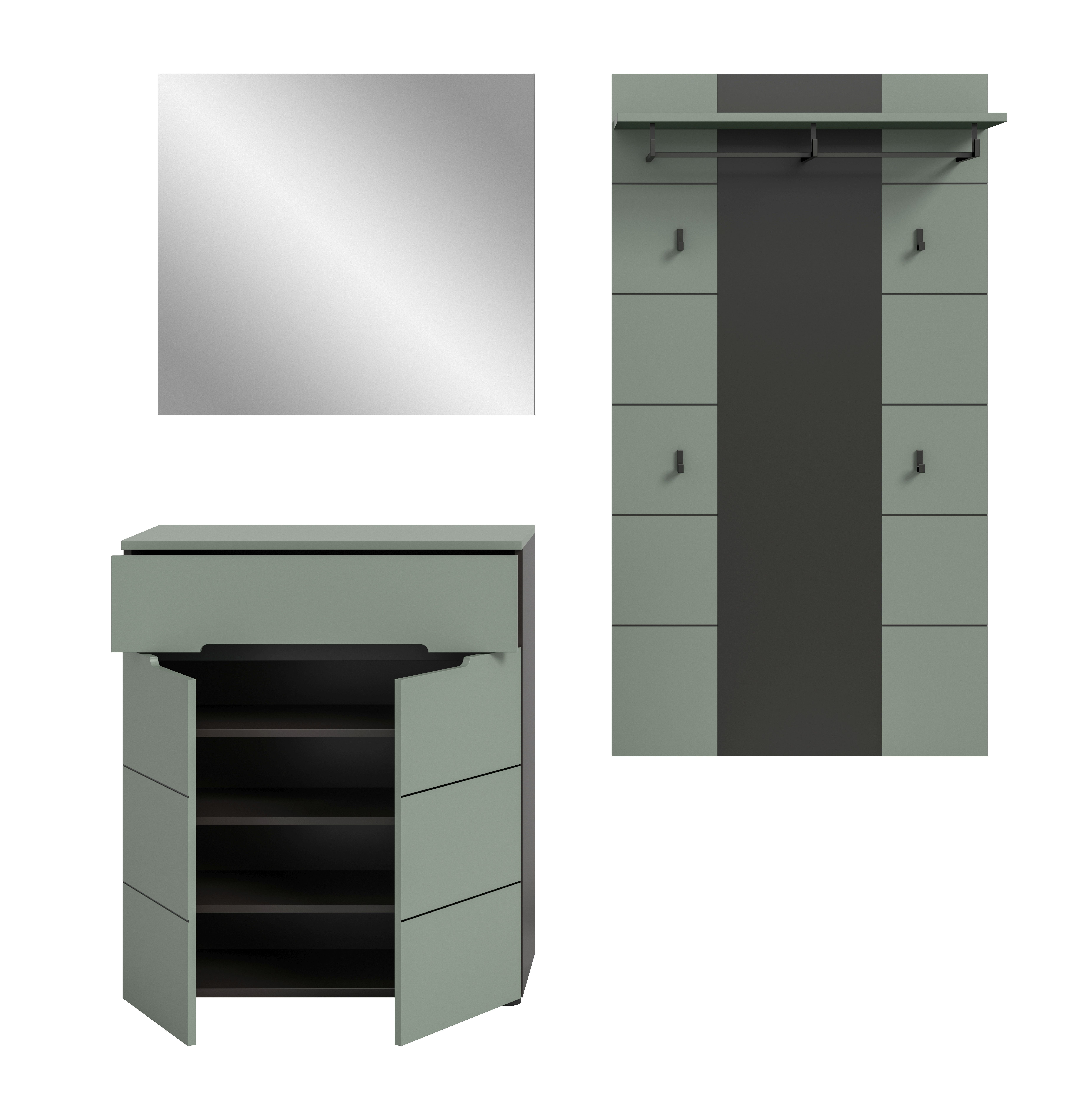 Optimisez votre entrée avec ce vestiaire combiné dans un élégant décor ton gris basalte et smoke green (dimensions : L/H/P : 175 x 190 x 37 cm) ! Composé d’un panneau portemanteau, d’un meuble à chaussures et d’un miroir, cet ensemble offre un bel espace de rangement tout en embellissant le couloir. Son design moderne confère à la pièce une ambiance claire et conviviale et permet de la garder bien rangée. Un modèle idéal si vous cherchez à associer style et côté pratique dans votre intérieur !