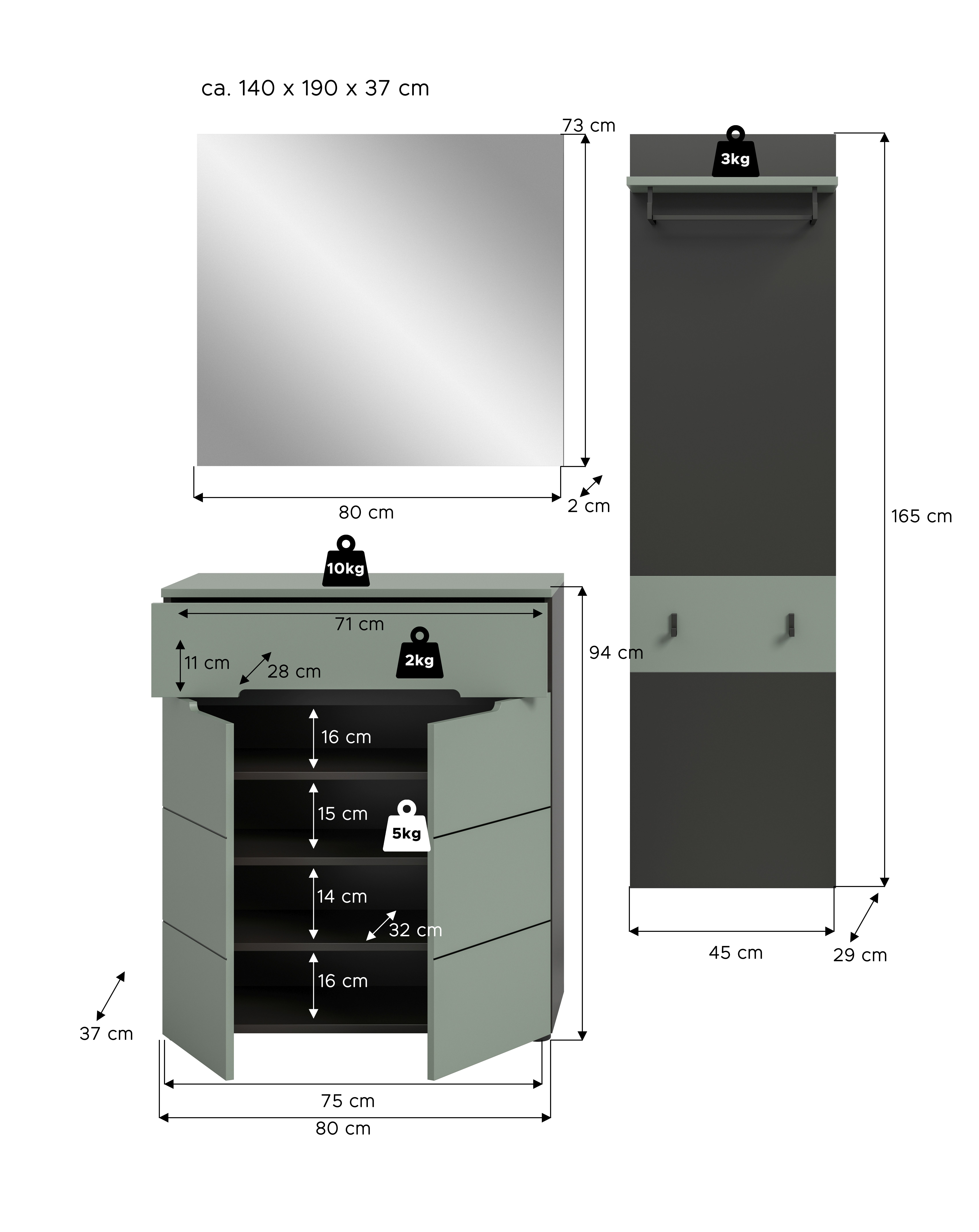L’élégant vestiaire combiné en décor ton gris basalte et ton smoke green (dimensions : L/H/P : 140 x 190 x 37 cm) permettra de maintenir votre entrée toujours bien rangée. L’ensemble se compose d’un panneau portemanteau, d’un meuble à chaussures pratique et d’un miroir qui conférera une touche élégante à votre couloir. Grâce à son design épuré, il s’intègre harmonieusement dans tous les styles d’intérieur tout en créant une atmosphère conviviale. Découvrez l’alliance parfaite entre style et fonctionnalité avec ce joli vestiaire combiné !