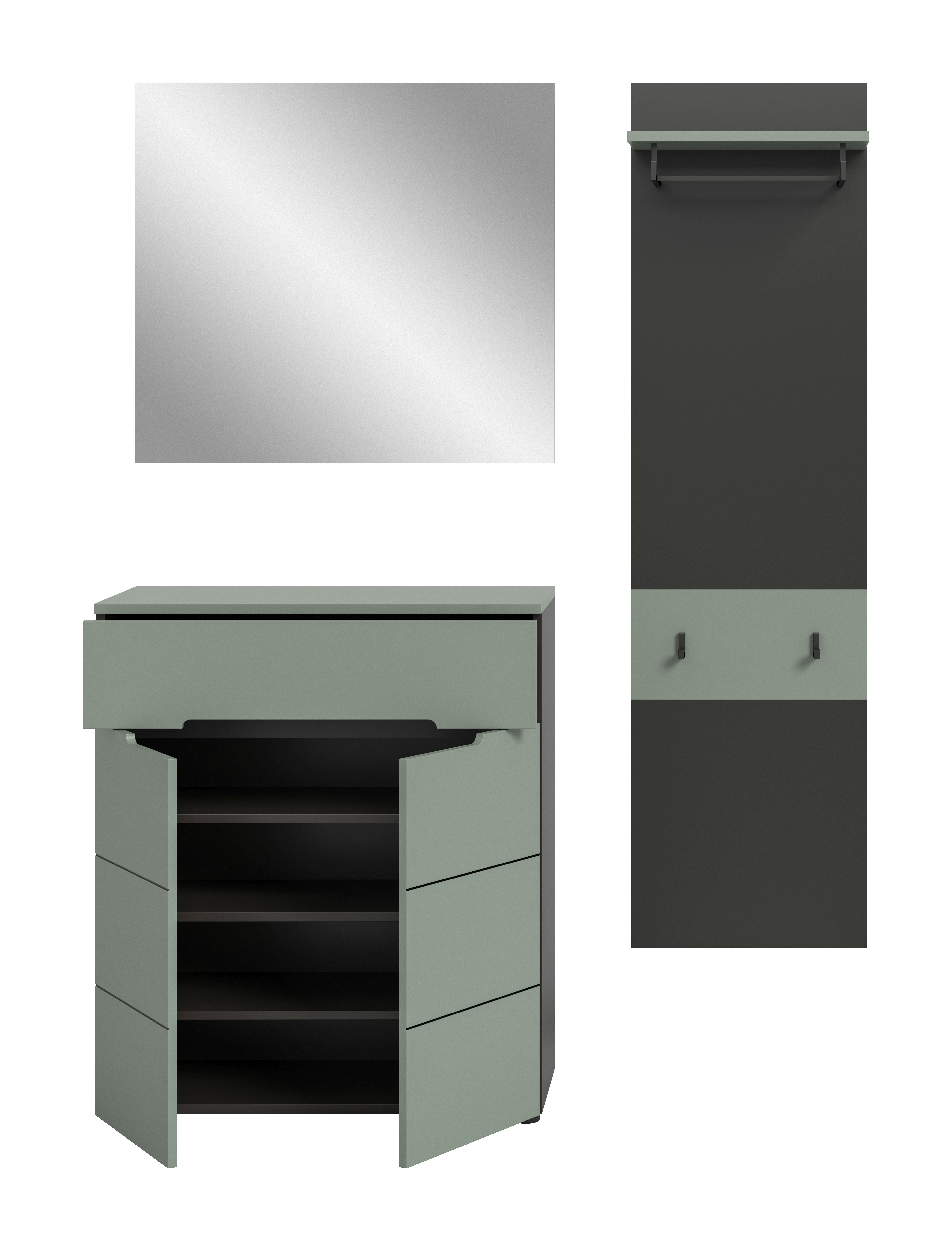 - Ensemble 3 éléments comprenant : 1 panneau portemanteau, 1 meuble à chaussures, 1 miroir