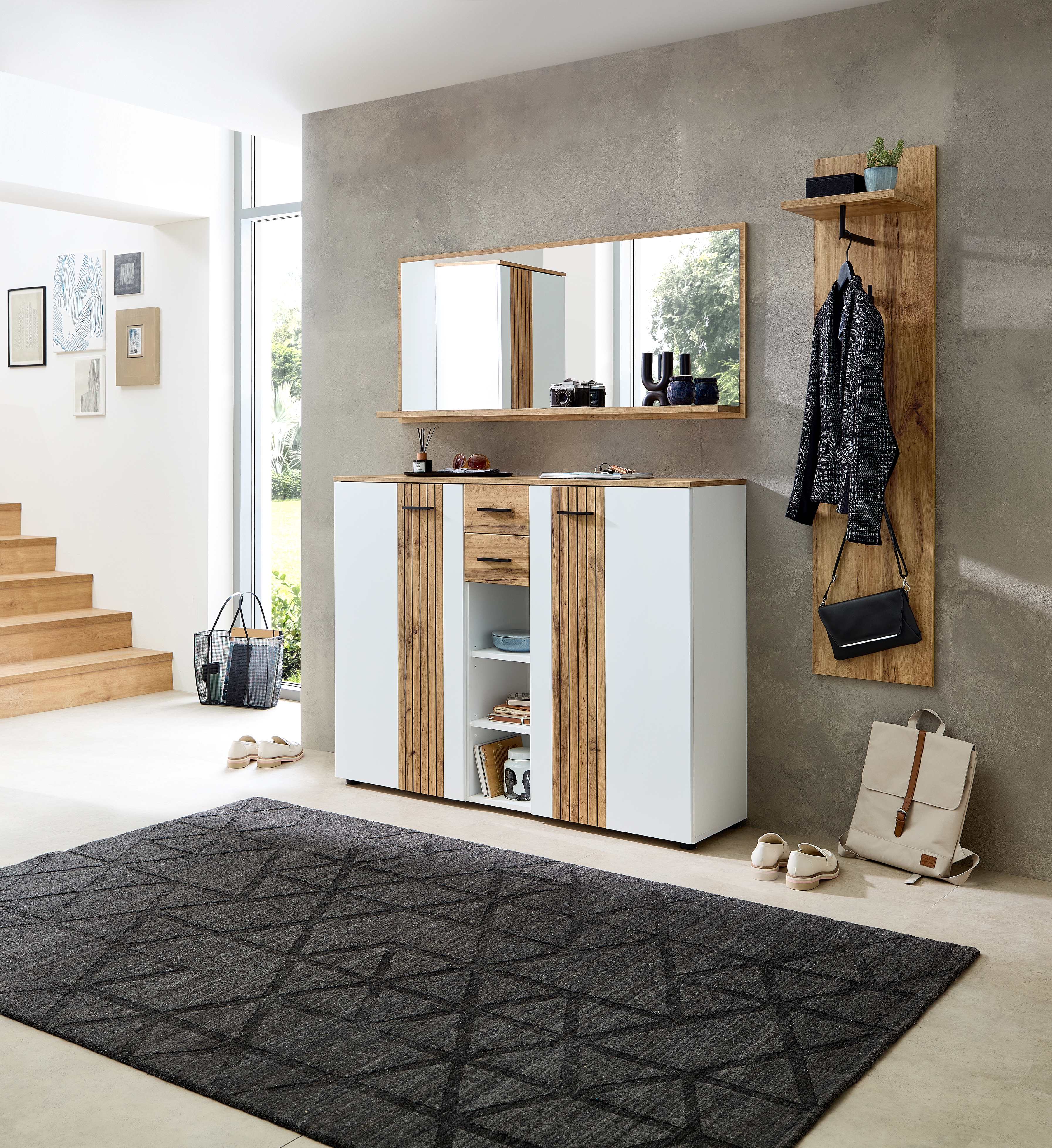 1 meuble à chaussures avec 3 casiers ouverts, 2 portes, 2 tiroirs et 10 tablettes