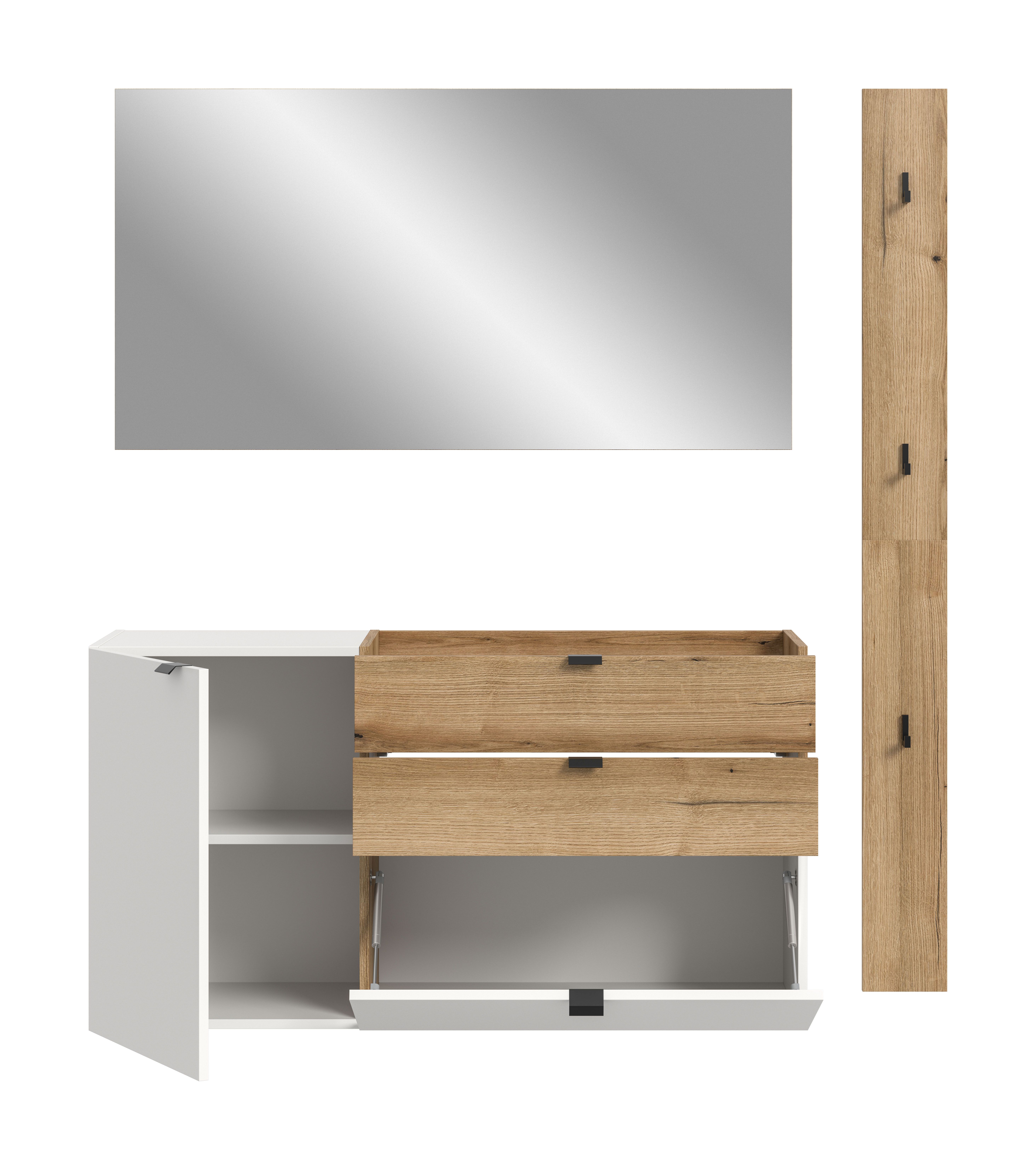 Ce vestiaire combiné 3 éléments en décor blanc (dimensions : L/H/P : 158 x 194 x 37 cm) est la solution idéale pour une entrée bien rangée et stylée. L’ensemble se compose d’un meuble à chaussures suspendu, d’un miroir et d’une patère murale, formant un ensemble harmonieux. Sa surface facile d’entretien permet un nettoyage aisé et conservera longtemps un aspect frais et lumineux. Le meuble suspendu offre un bel espace de rangement pour les chaussures, sacs et objets du quotidien, tandis que le miroir agrandit visuellement l’espace et apporte plus de clarté. La patère murale, équipée de plusieurs crochets, permet de suspendre facilement vestes et accessoires. Le montage rapide et simple vous permet de réaménager votre entrée en toute simplicité. Grâce aux nombreuses possibilités d'association des éléments de la série, vous pourrez adapter ce vestiaire à vos besoins pour faire régner l’ordre avec style.
