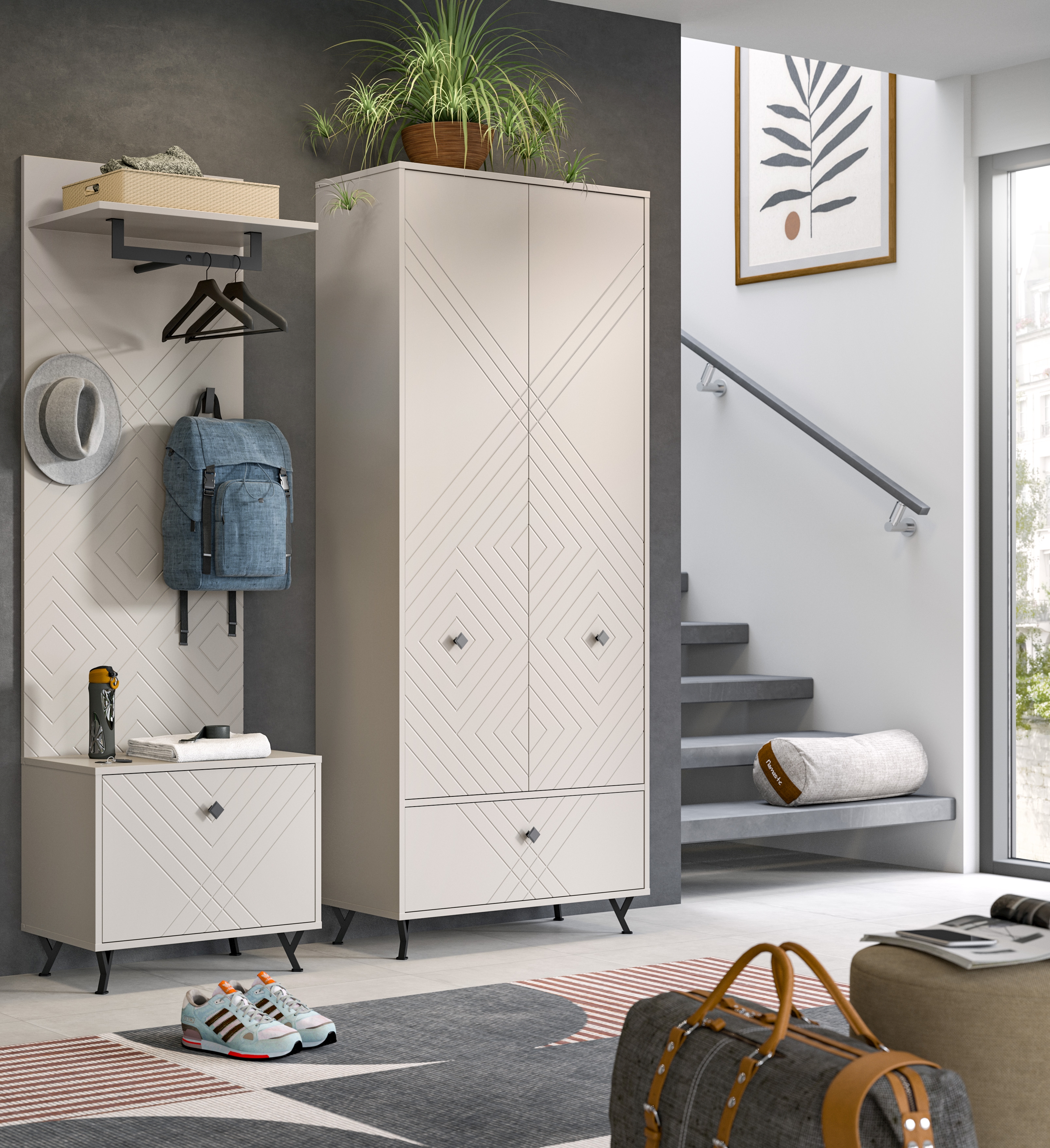 Optimisez votre entrée, votre couloir ou votre buanderie avec notre vestiaire combiné de qualité dans un revêtement mélaminé ton beige sable et surface thermoformée aspect mat. Cet ensemble bien pensé comprend une armoire d’entrée, un panneau portemanteau mural, un miroir, un meuble à chaussures et un banc à chaussures ; il offre un grand espace de rangement et conférera à votre entrée une ambiance moderne et accueillante. Découvrez dès maintenant l’équilibre parfait entre aspects pratique et esthétique pour votre intérieur.