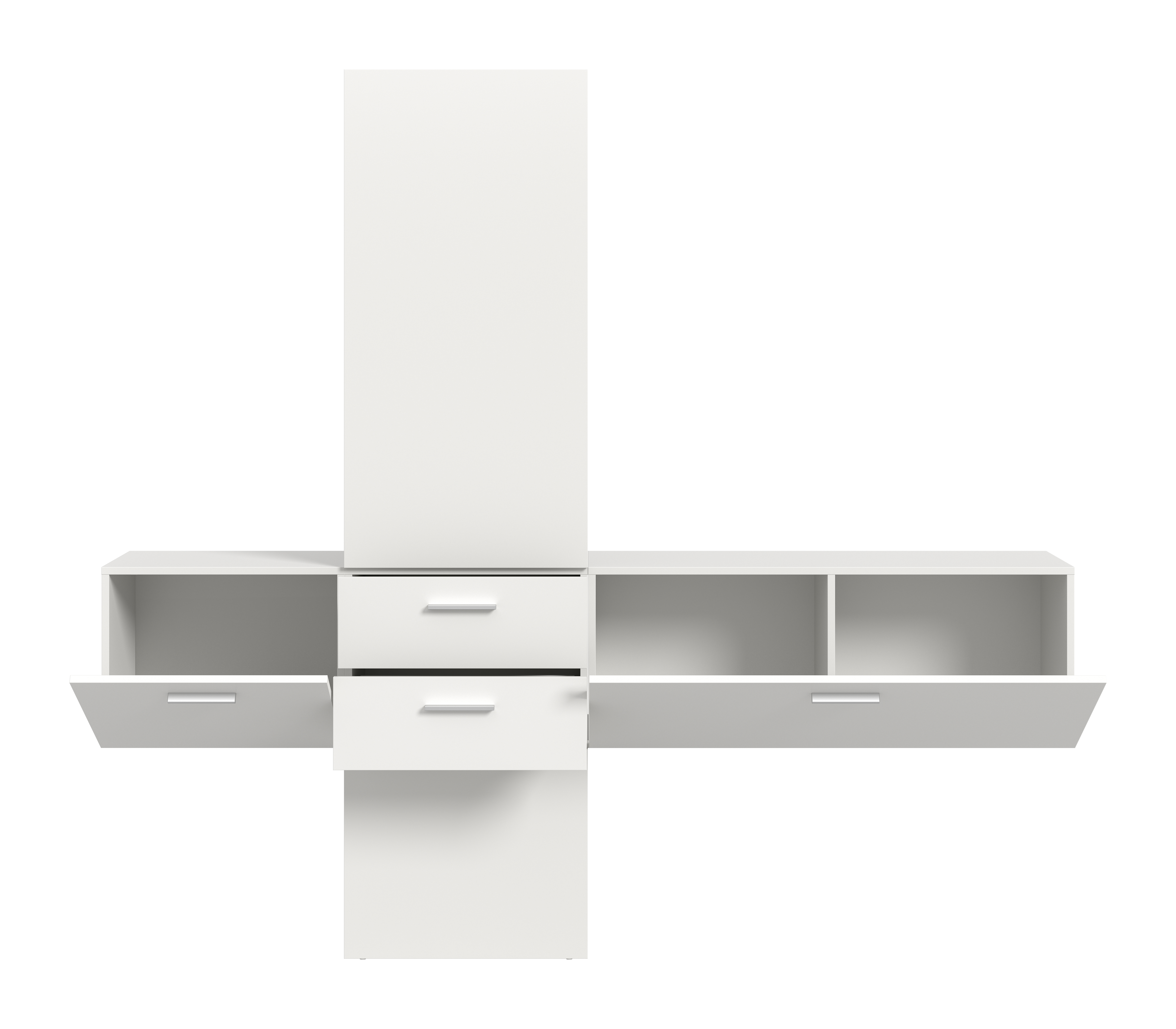 1 meuble de rangement avec 1 abattant et, derrière lui, 2 casiers