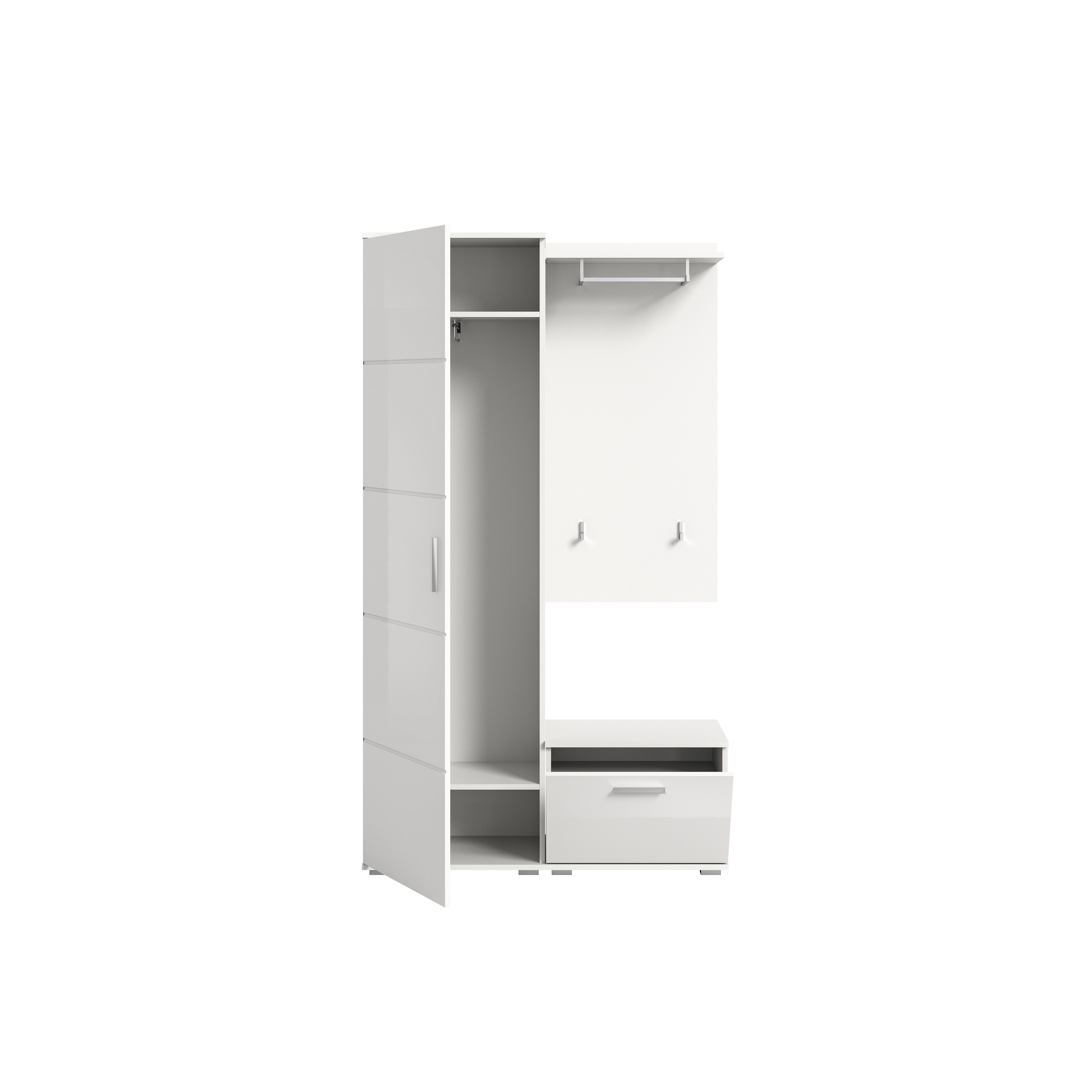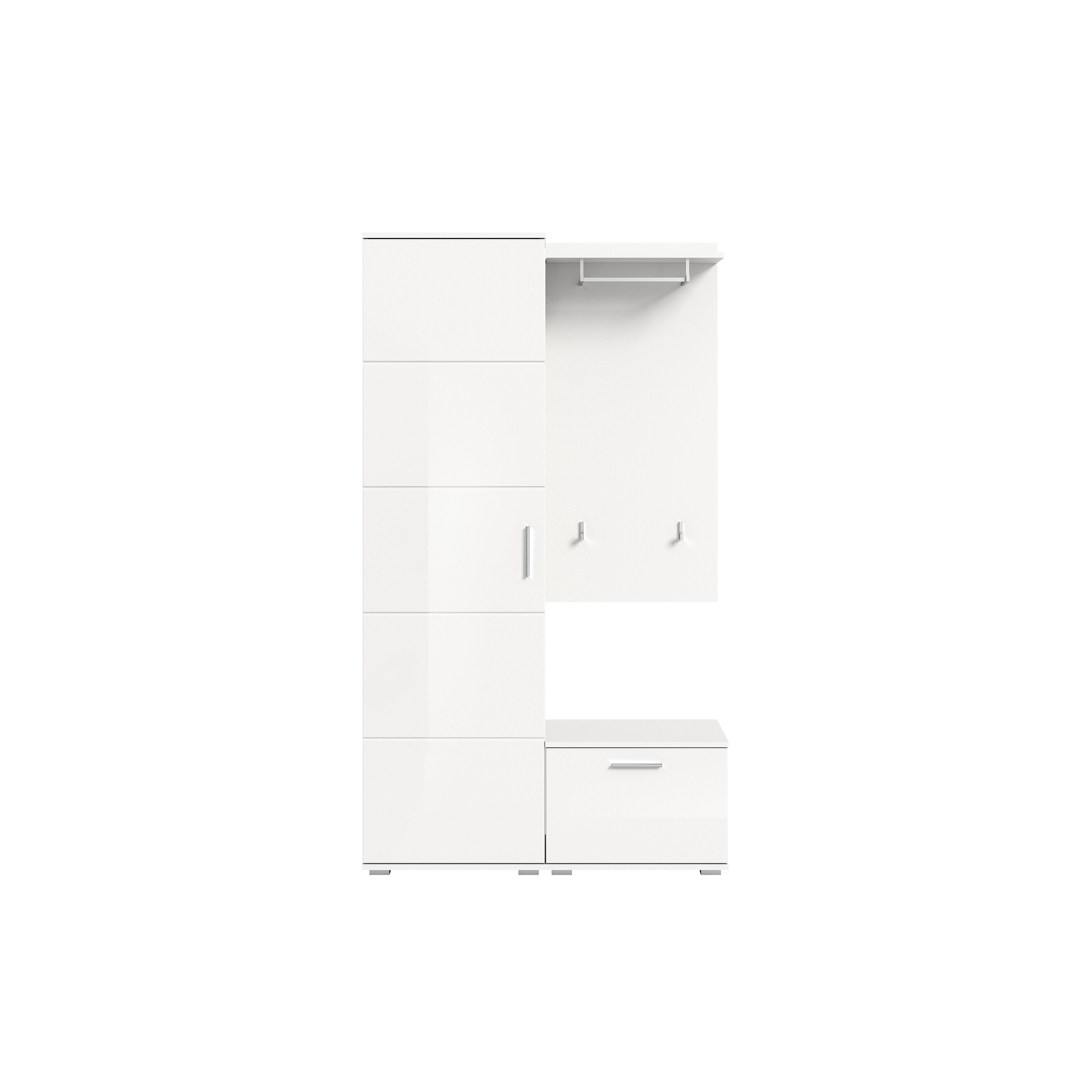 - Design/style : le vestiaire combiné ton blanc et ton blanc ultra brillant séduit par son apparence moderne et élégante. L’association des façades brillantes et de la surface mate confère au vestiaire un joli design tout en contrastes qui s’intègre parfaitement dans une décoration intérieure moderne. Les lignes claires et les formes minimalistes garantissent une élégance indémodable tandis que les poignées aspect chrome confèrent à l’ensemble une touche de raffinement.