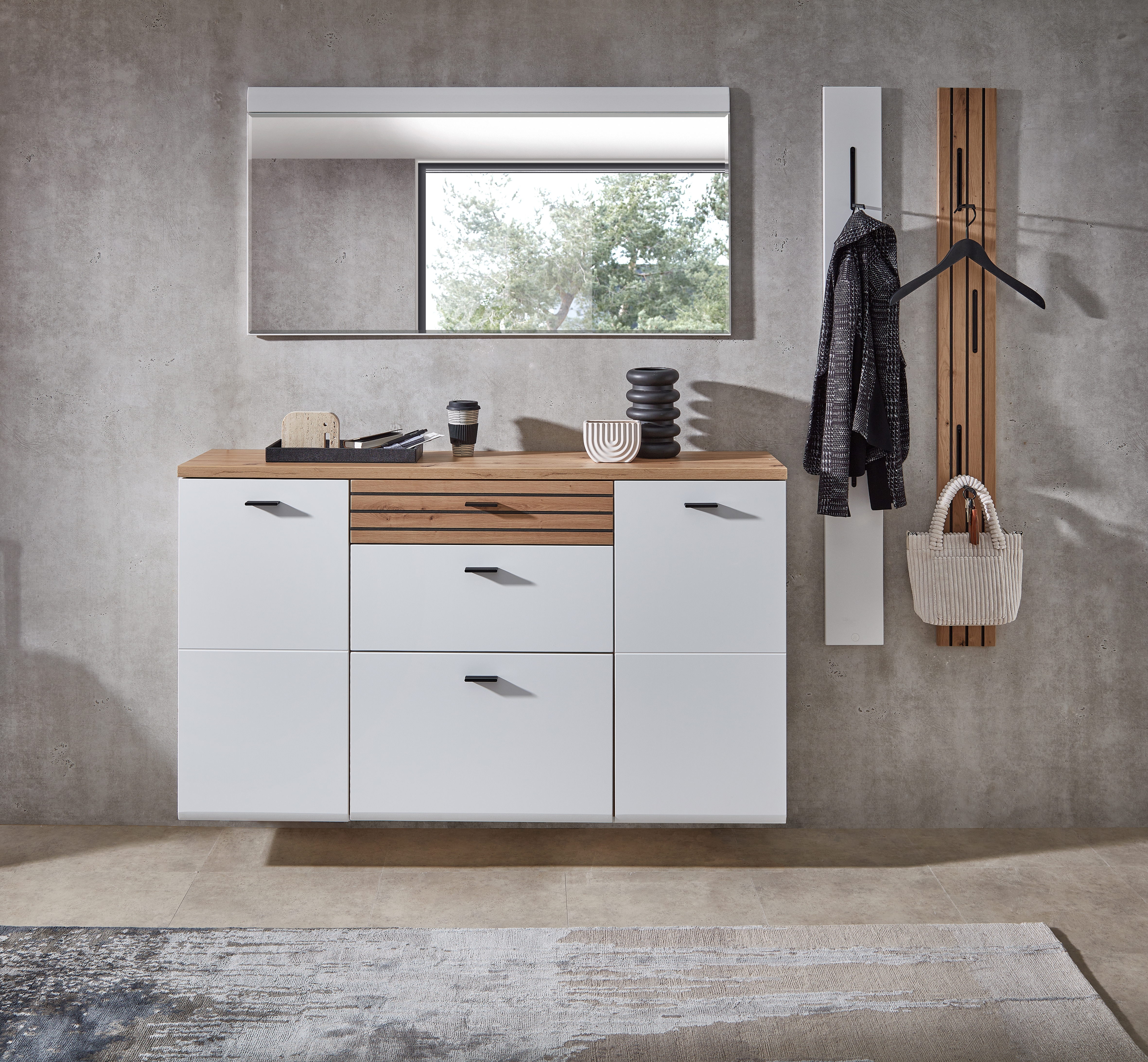 1 meuble à chaussures à suspendre avec 2 portes, 2 tiroirs, 1 abattant avec rangement pour chaussures et 8 tablettes