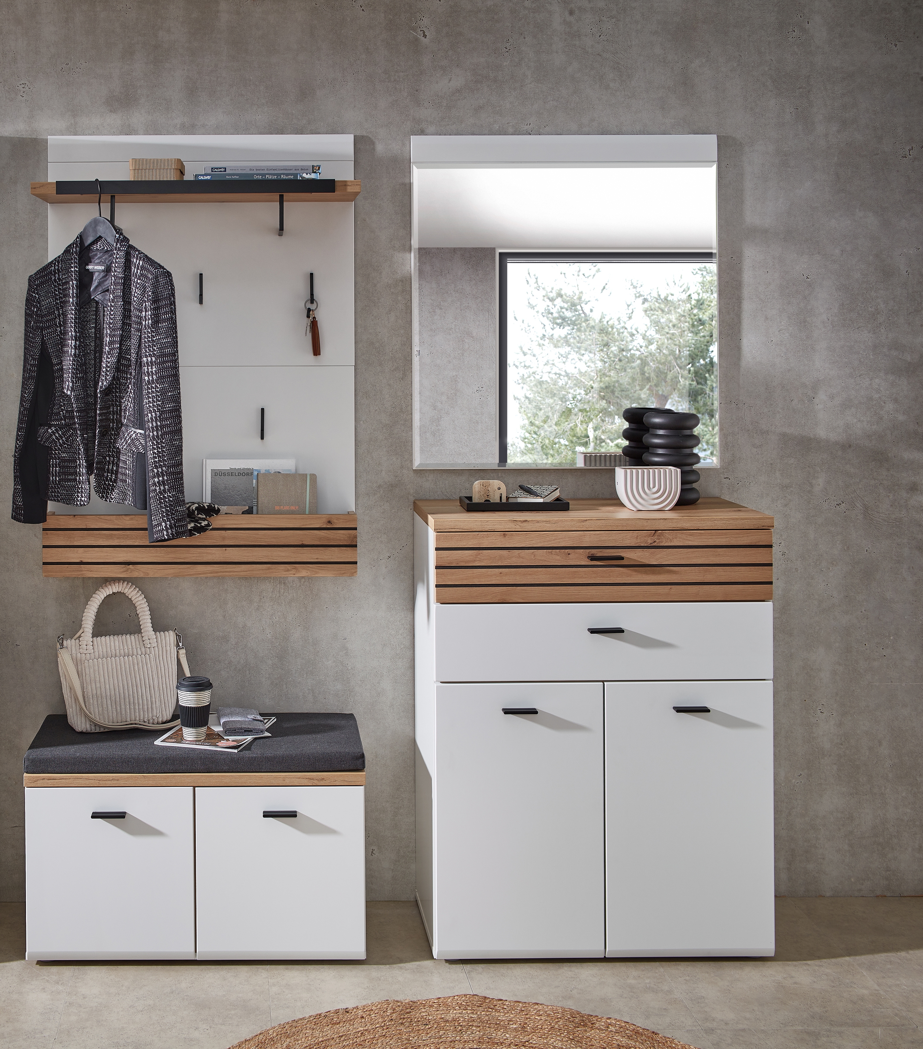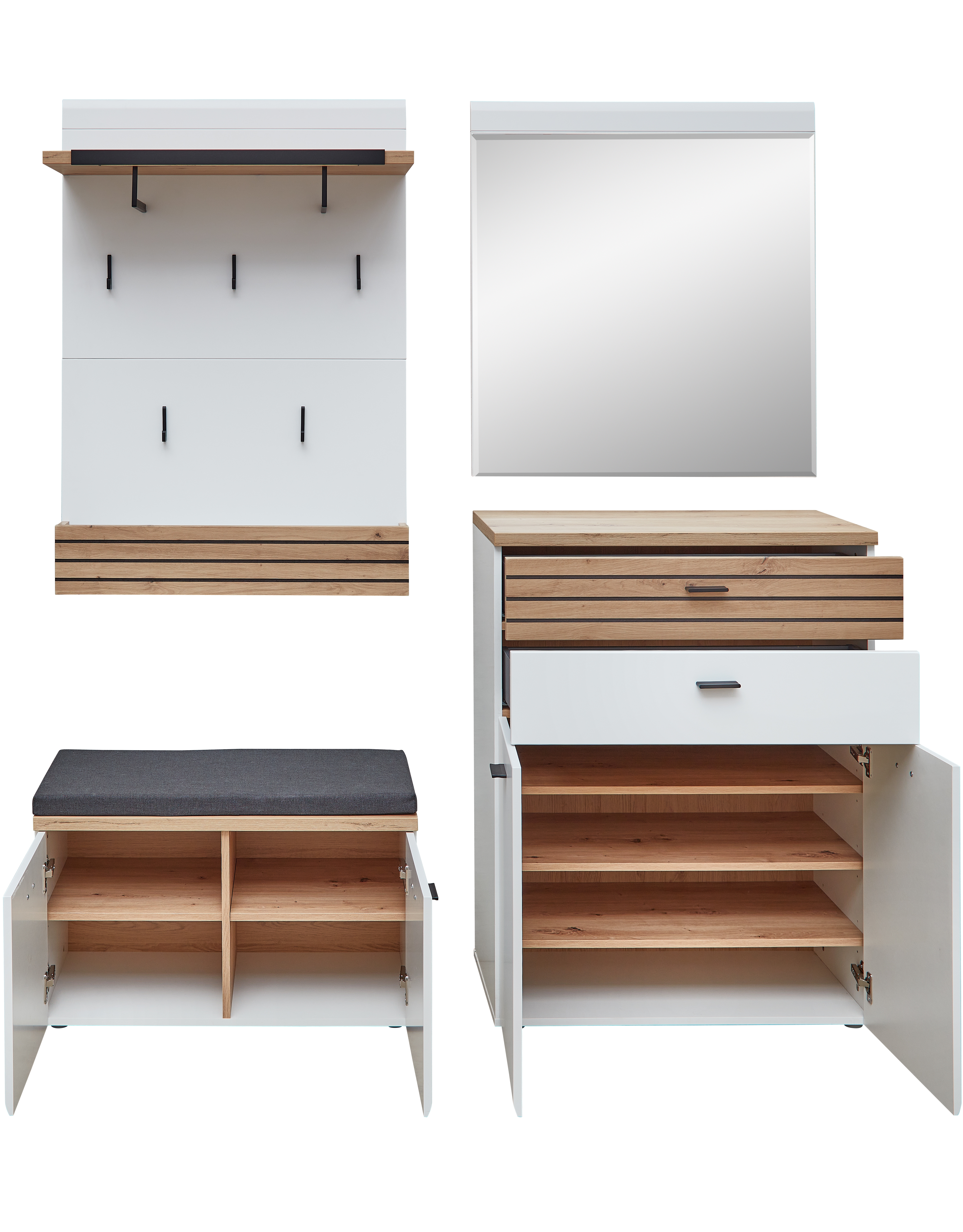 1 meuble à chaussures avec 2 tiroirs, 2 portes et 3 tablettes