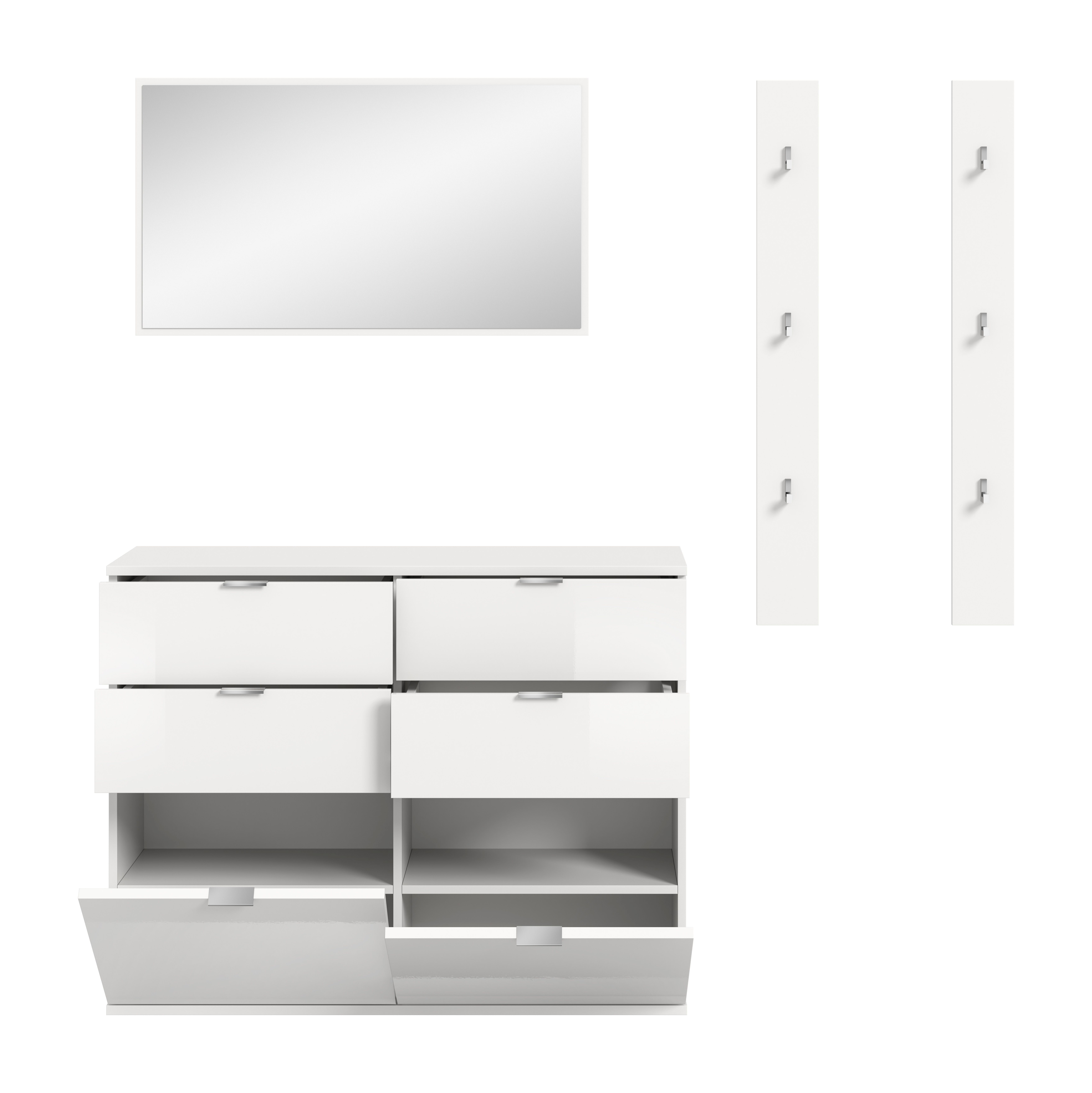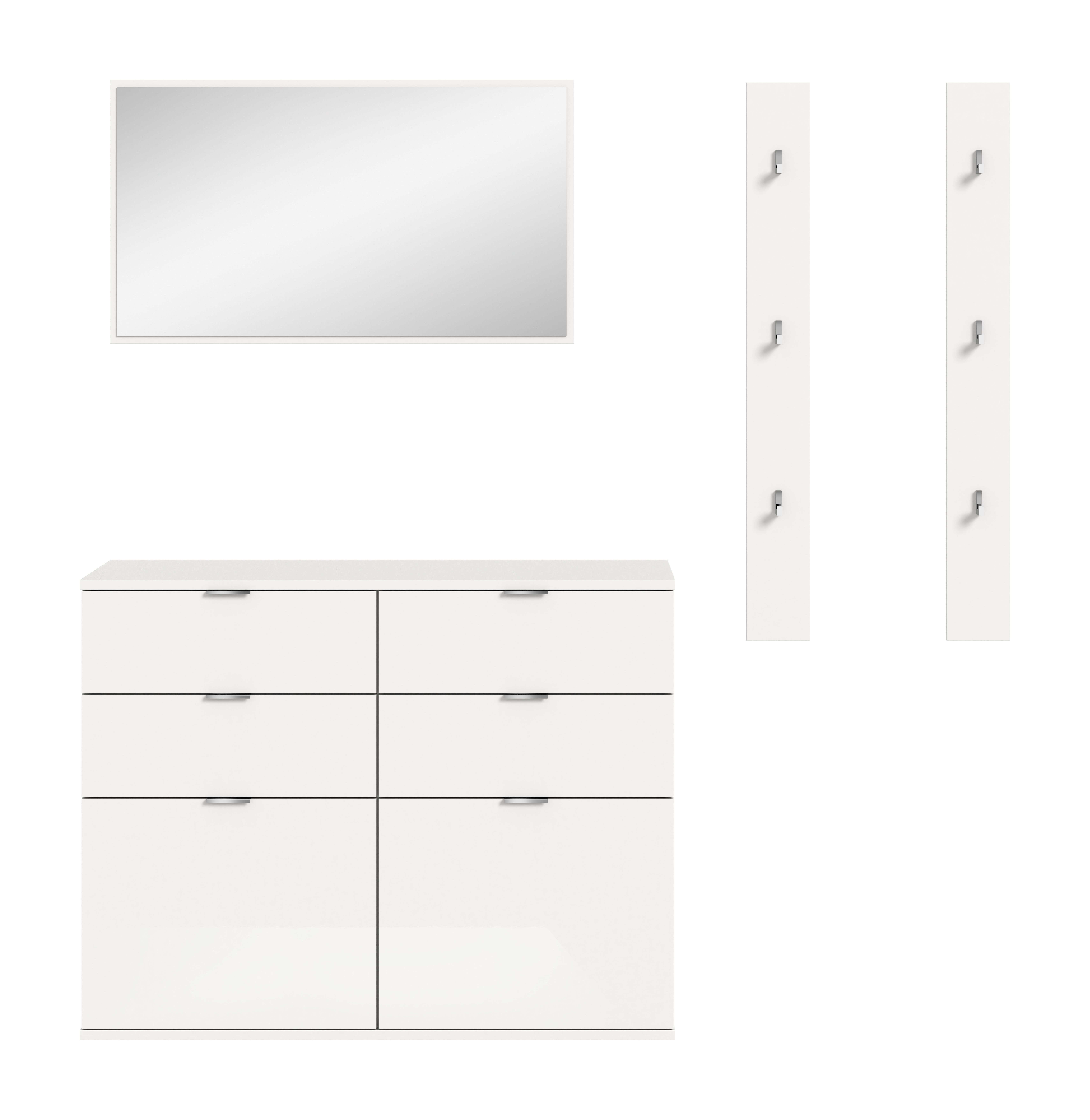 Apportez une touche moderne à votre entrée avec notre vestiaire combiné ton blanc ultra brillant ! Avec ses dimensions compactes (L/H/P : 171x191x37 cm), cet ensemble offre un espace de rangement généreux tout en affirmant un style contemporain. Il se compose d’une élégante commode, d’un grand miroir et d’un lot pratique de deux panneaux muraux pour suspendre vestes et accessoires. La finition ultra brillante réfléchit la lumière et crée une ambiance lumineuse et aérée. Cette combinaison est idéale pour celles et ceux qui cherchent à associer fonctionnalité et design dans leur intérieur.