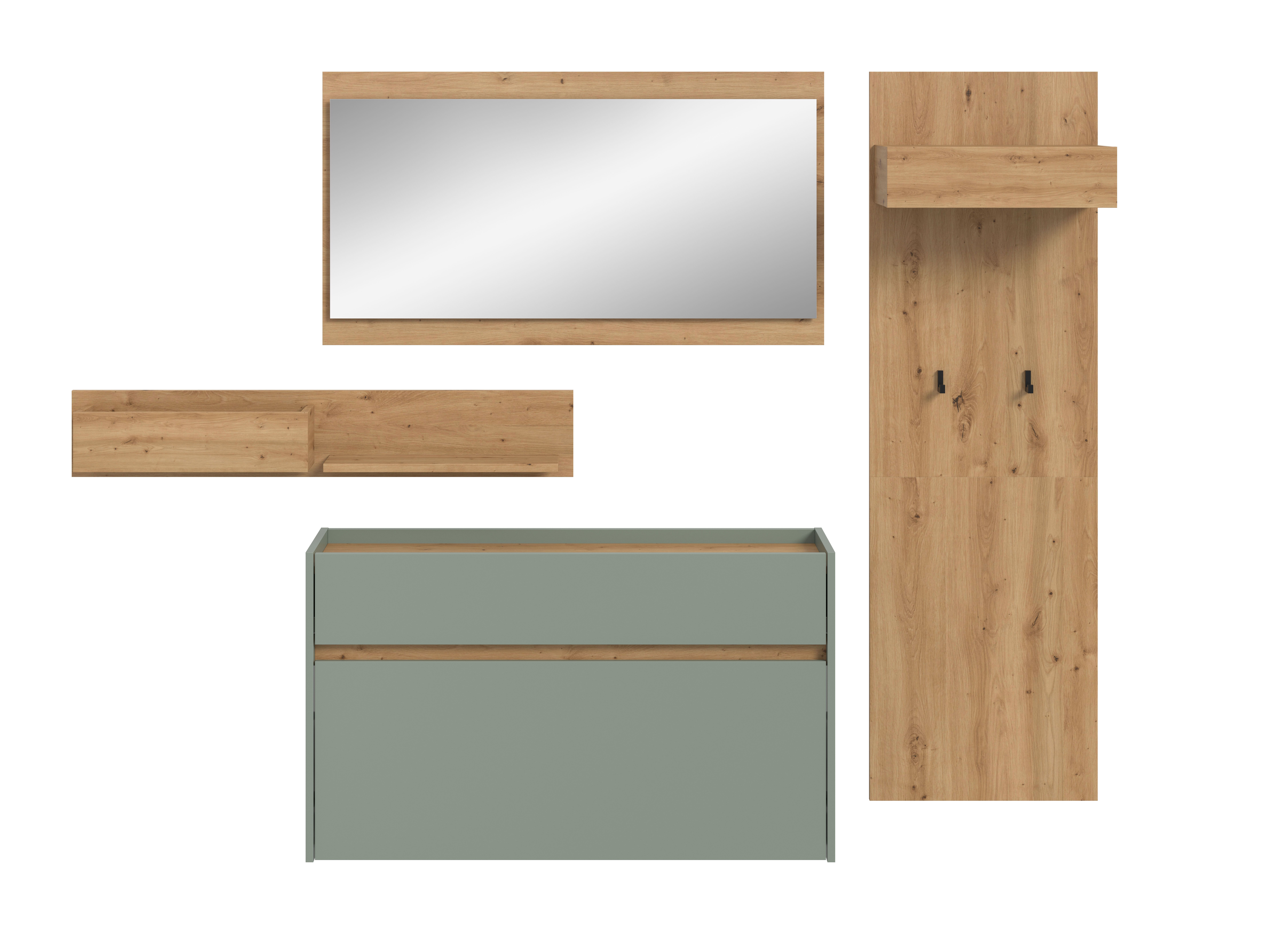 Ce vestiaire combiné 4 éléments ton sauge et décor chêne Artisan (dimensions : L/H/P : 205 x 192 x 32 cm) se compose d’un meuble à chaussures, d’une étagère murale, d’un miroir et d’un panneau portemanteau. Le bois composite certifié FSC® est synonyme de durabilité. Ses surfaces faciles d’entretien et son montage simple font de ce vestiaire une solution particulièrement pratique au quotidien. Il peut être complété par d’autres articles de la série pour un aménagement du couloir à la fois stylé et fonctionnel.