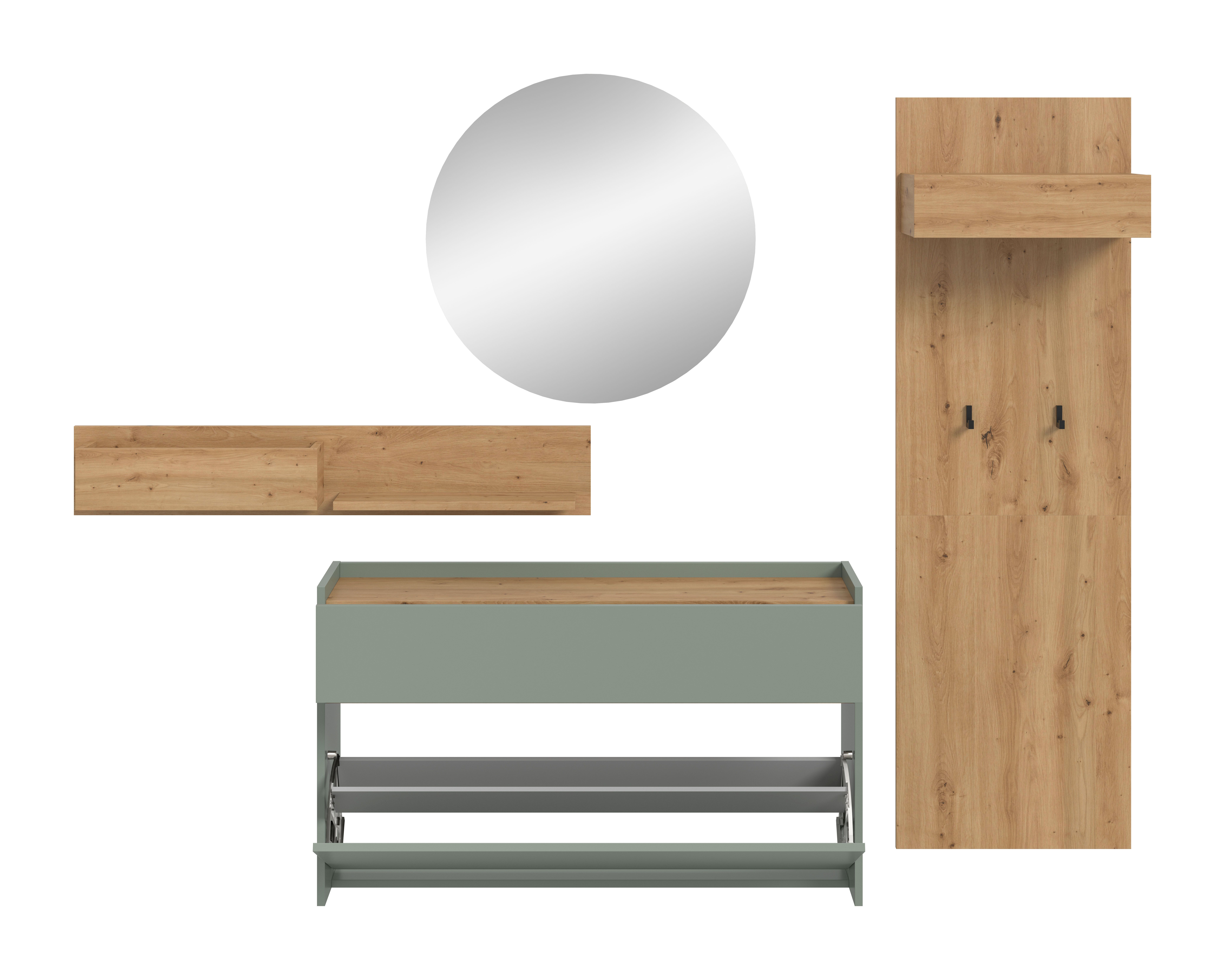 - Ensemble 4 éléments comprenant : 1 meuble à chaussures, 1 étagère murale, 1 miroir, 1 panneau portemanteau