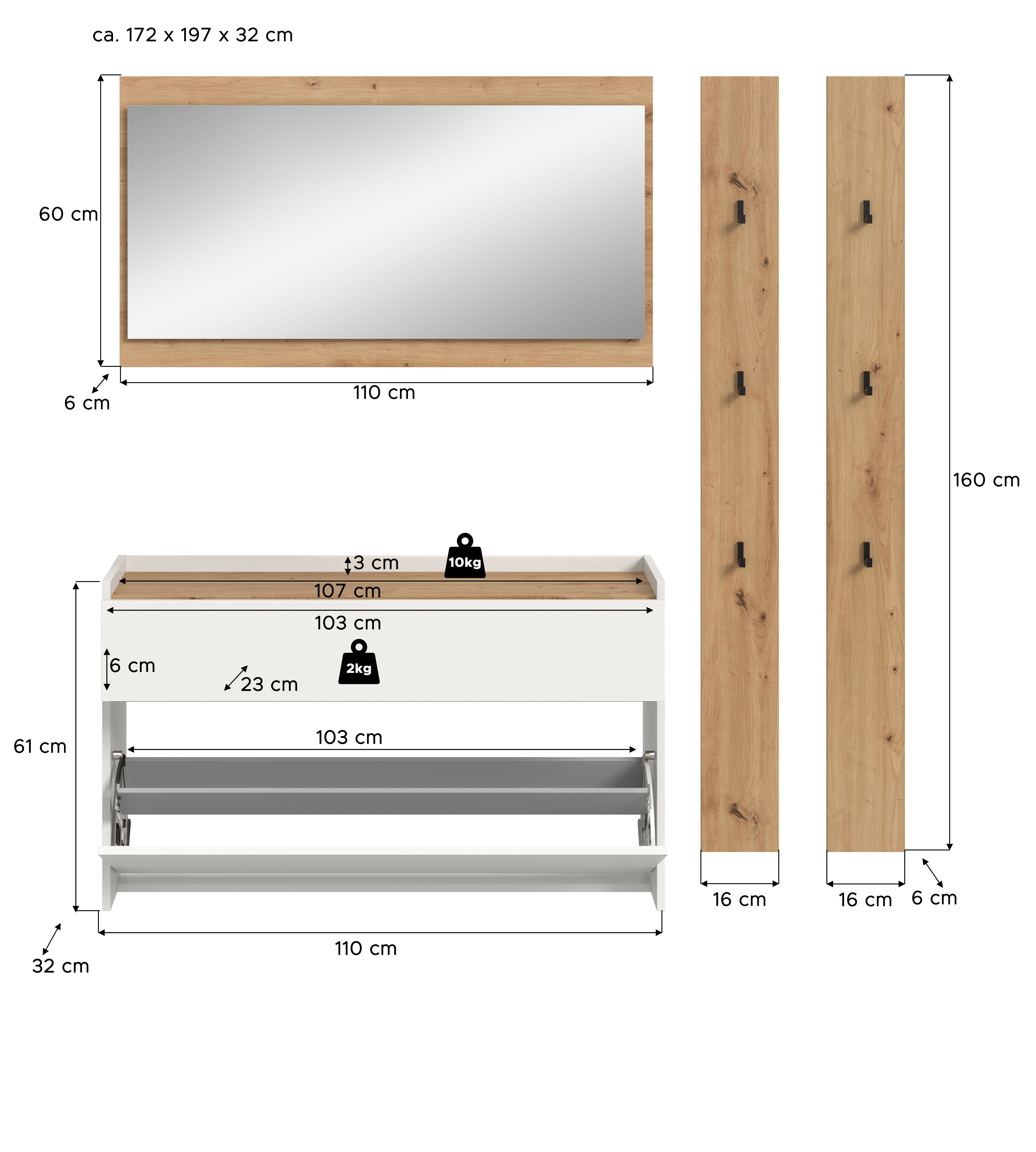 Ce vestiaire combiné 4 éléments se compose d’un meuble à chaussures, d’un miroir et de 2 panneaux portemanteaux – une solution pratique pour optimiser l’espace de rangement. Dimensions : L/H/P : 172 x 192 x 32 cm. Le bois composite certifié FSC® est synonyme de durabilité. Sa surface facile d’entretien et son montage simple font de ce vestiaire combiné un ensemble particulièrement pratique au quotidien. Il peut être complété par d’autres articles de la série pour une entrée bien rangée et stylée.